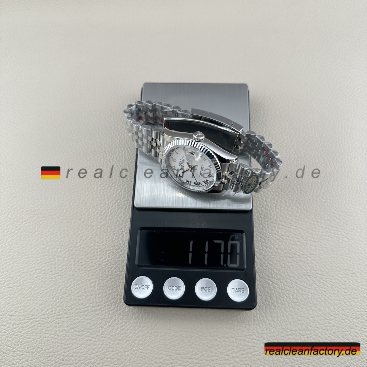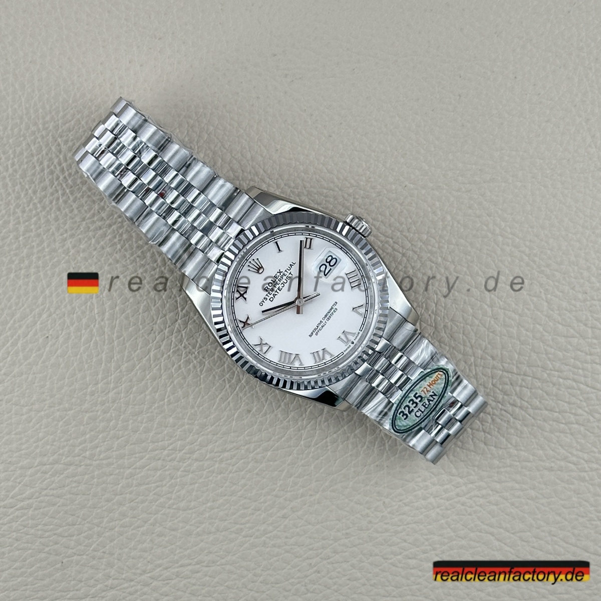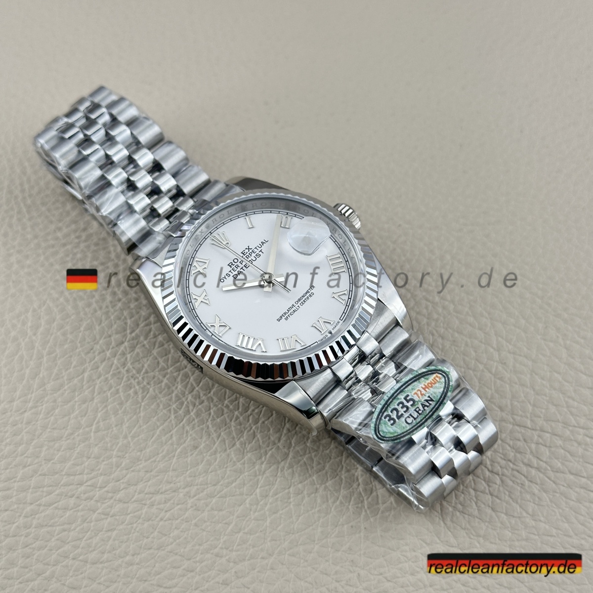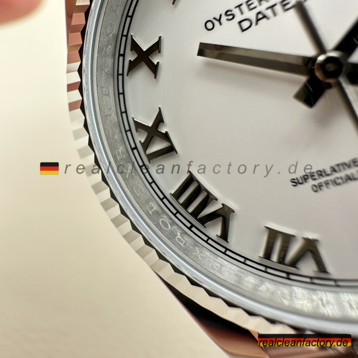 • Clean Factorys Super Clone Rolex Datejust 126234-0025 definiert das klassische weiße Zifferblatt mit römischen Ziffern neu – eingefasst in hochwertigem Edelstahl und vollendet durch eine geriffelte Weißgold-Lünette. Diese Konfiguration verbindet zeitlose Eleganz mit makelloser Ausführung und zeigt, dass Schlichtheit durch meisterhafte Handwerkskunst zur höchsten Form von Luxus werden kann. Die Kombination aus römischen Ziffern und weißem Zifferblatt verkörpert Rolex’ dauerhafteste formale Ästhetik – durch Clean Factorys dauerhafte Weißgold-Technologie und präzise Zifferngestaltung auf ein neues Level gehoben.