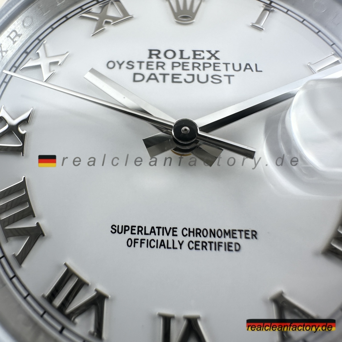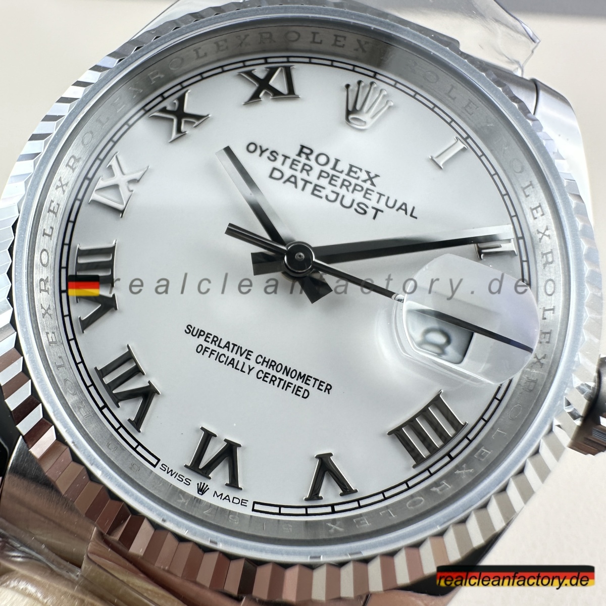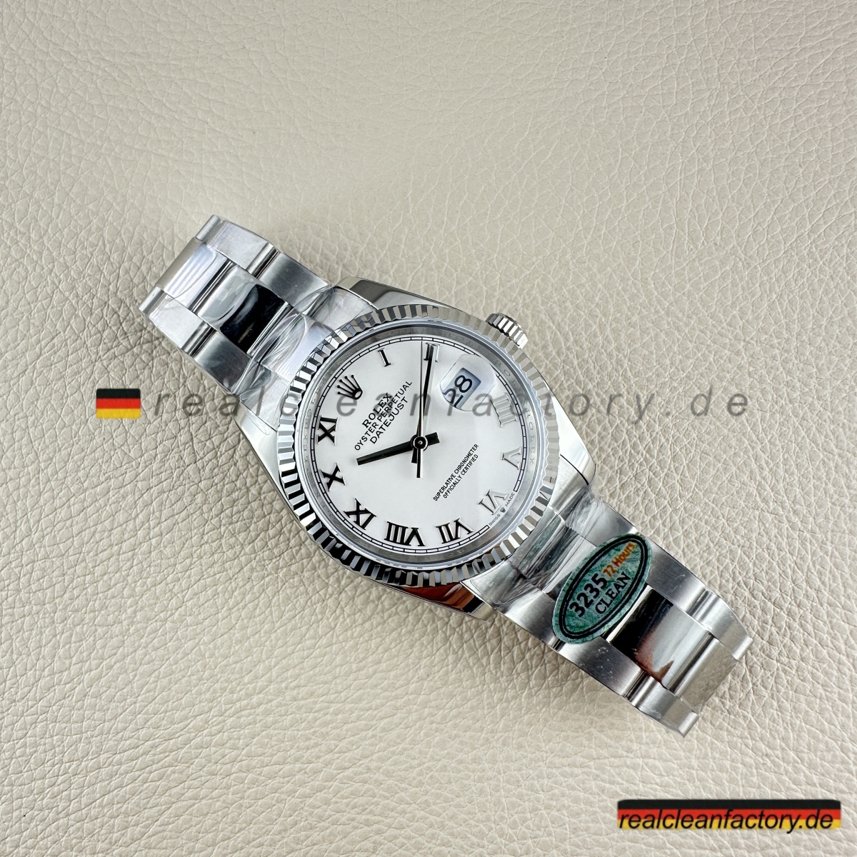 - Clean Factory’s Super Clone Rolex Datejust 126234-0026 verbessert das klassische weiße römische Zifferblatt mit der Stärke und Eleganz des Oyster-Armbands und schafft so ein zeitloses, vielseitiges Stück. Durch die Kombination des formellen Zifferblatts von Rolex mit einer robusten Konstruktion fertigt Clean Factory eine Luxus-Uhr, die sowohl für professionelle Umgebungen als auch für die Freizeit perfekt geeignet ist. Angetrieben vom Super Swiss 3235 Clone-Uhrwerk liefert die Uhr mechanische Präzision, die dem makellosen Finish des Gehäuses entspricht. Das Ergebnis ist eine Hybrid-Uhr, die Raffinesse mit Leistung vereint.