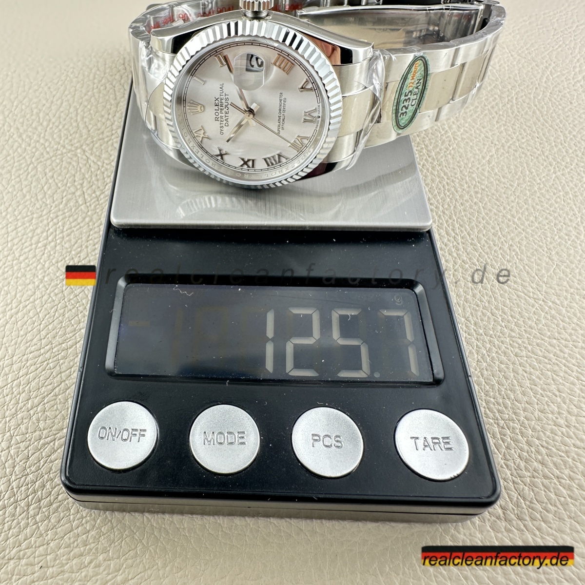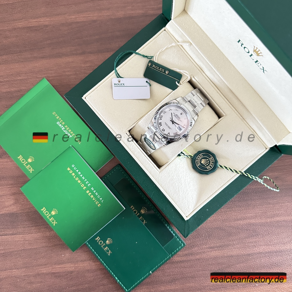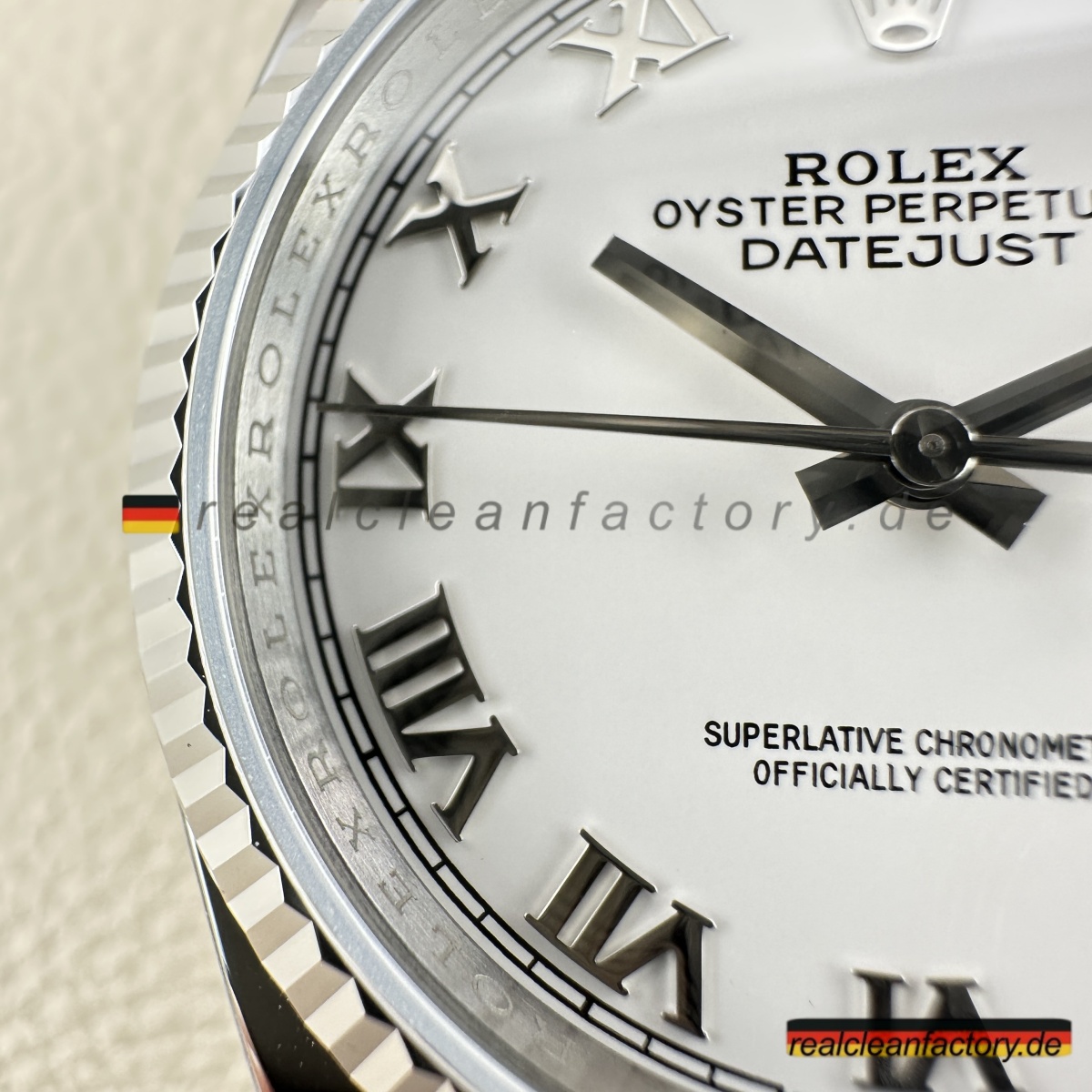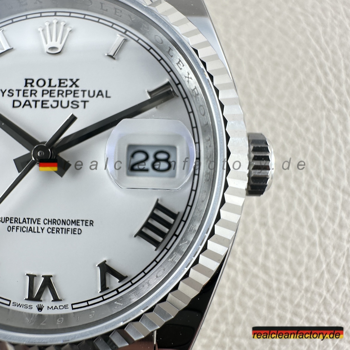 - Clean Factory’s Super Clone Rolex Datejust 126234-0026 verbessert das klassische weiße römische Zifferblatt mit der Stärke und Eleganz des Oyster-Armbands und schafft so ein zeitloses, vielseitiges Stück. Durch die Kombination des formellen Zifferblatts von Rolex mit einer robusten Konstruktion fertigt Clean Factory eine Luxus-Uhr, die sowohl für professionelle Umgebungen als auch für die Freizeit perfekt geeignet ist. Angetrieben vom Super Swiss 3235 Clone-Uhrwerk liefert die Uhr mechanische Präzision, die dem makellosen Finish des Gehäuses entspricht. Das Ergebnis ist eine Hybrid-Uhr, die Raffinesse mit Leistung vereint.