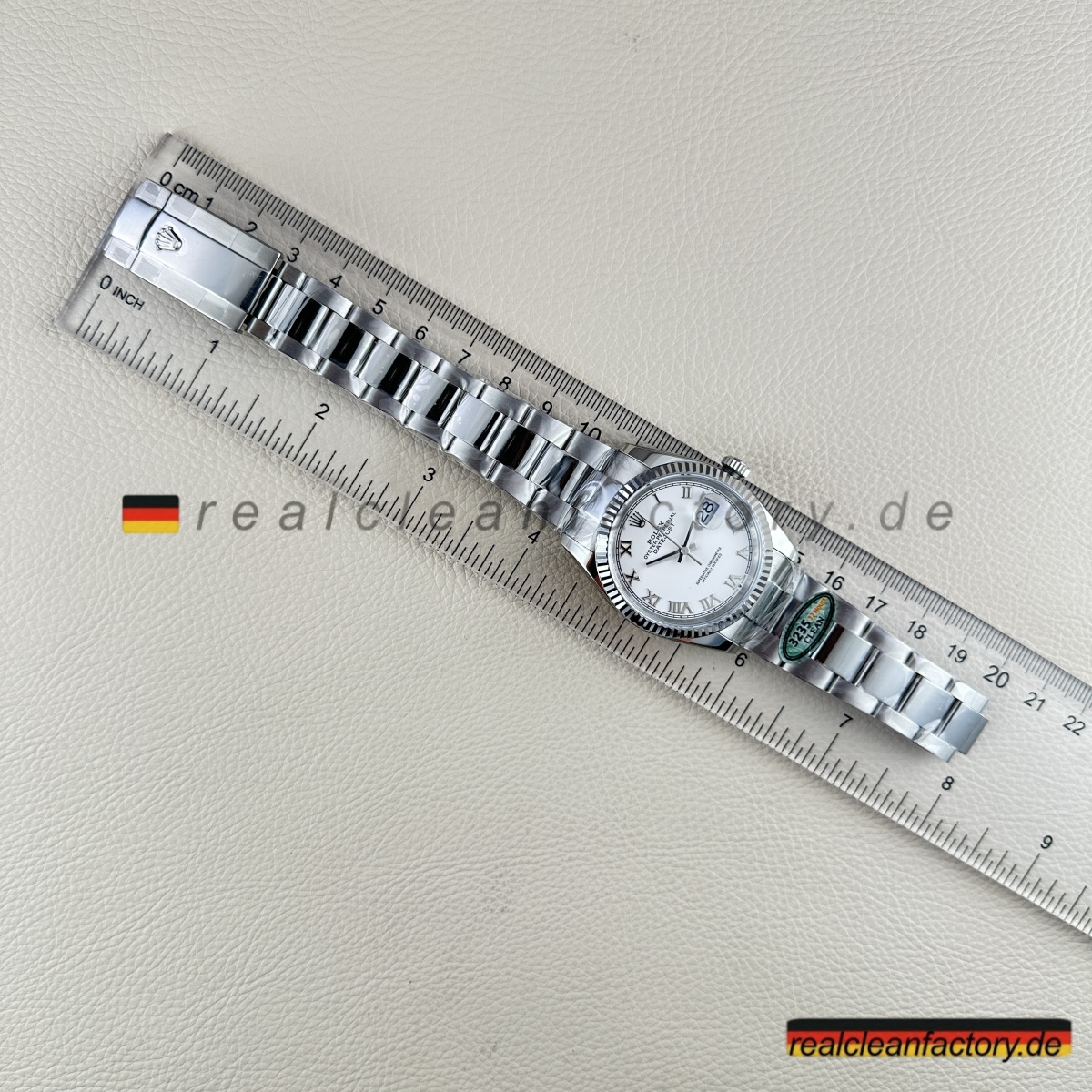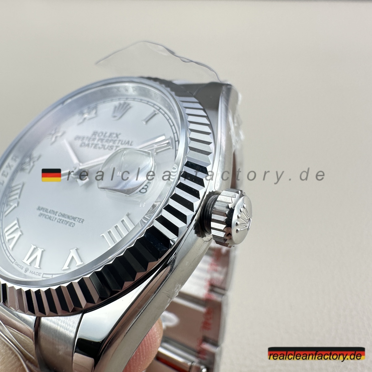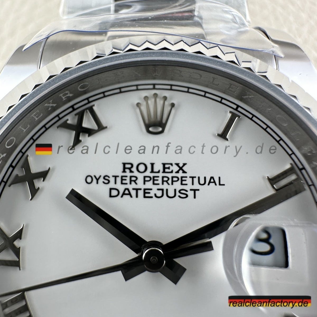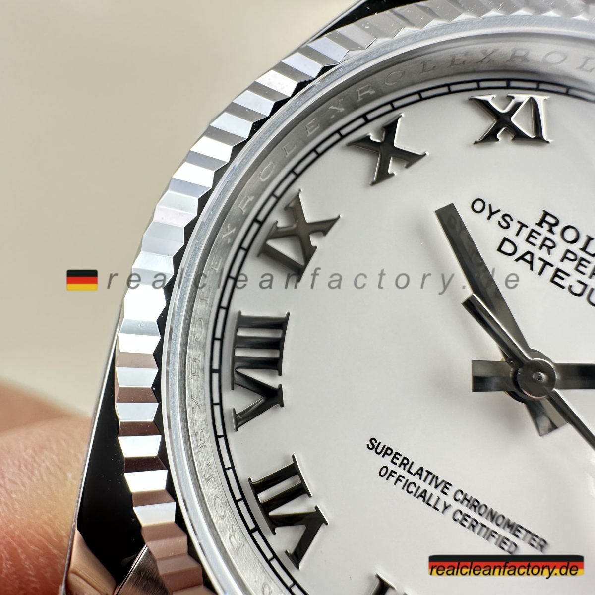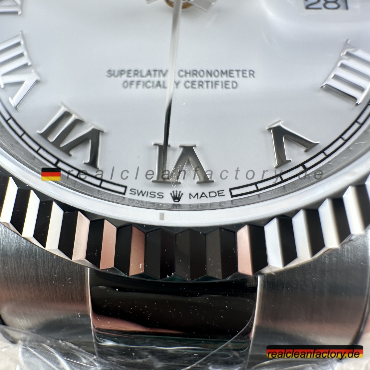 - Der direkte Vergleich mit einer authentischen weißen römischen Oyster Datejust zeigt bemerkenswerte Treue. Die Tiefe des Zifferblatts, die Qualität der weißen Goldlünette und die Präzision des Uhrwerks stimmen mit der echten Rolex-Handwerkskunst überein. Clean Factory’s Super Clone ist ein Beweis für ihre Hingabe, die zeitlose Eleganz und mechanische Exzellenz von Rolex nachzubilden.
