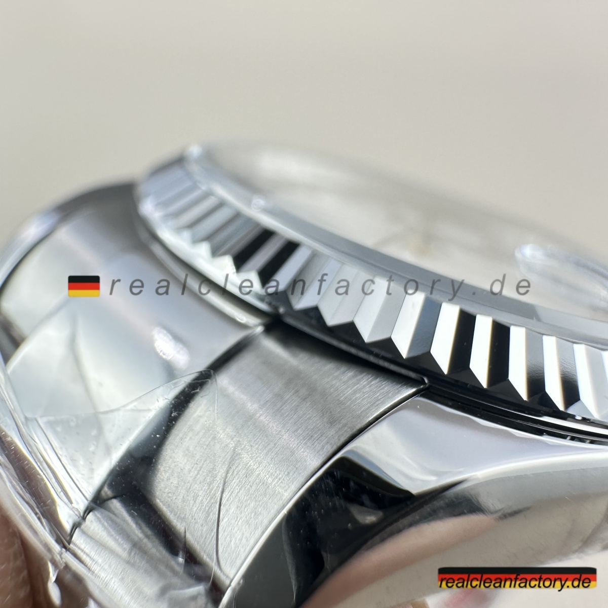 - Das weiße Sunburst-Zifferblatt in Kombination mit dem Oyster-Armband schafft einen auffälligen Kontrast. Das subtile Sunburst-Muster verleiht dem Zifferblatt Tiefe und Charakter, während das robuste Oyster-Armband der Uhr eine selbstbewusste Präsenz verleiht. Clean Factory’s spezialisierte Pigmentierung stellt sicher, dass das weiße Zifferblatt ein zartes Gleichgewicht zwischen Brillanz und Wärme bewahrt und nahtlos von einem formellen Umfeld zu entspannten Anlässen übergeht.