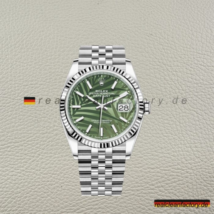- Clean Factory’s Super Clone Rolex Datejust 126234-0047 bringt das ikonische grüne Palm-Motiv-Zifferblatt von Rolex auf eine Weise zum Leben, wie es die meisten Hersteller nicht einmal versuchen würden, geschweige denn meistern. In der klassischen 36-mm-Gehäusegröße, kombiniert mit einer weißgoldenen, fluted Lünette und einem Jubilee-Armband, beweist diese Uhr, dass exotisches Design nicht auf Kosten von Raffinesse gehen muss. Vergleichen Sie sie Seite an Seite mit der echten Rolex, und der Detailgrad ist nahezu ununterscheidbar.