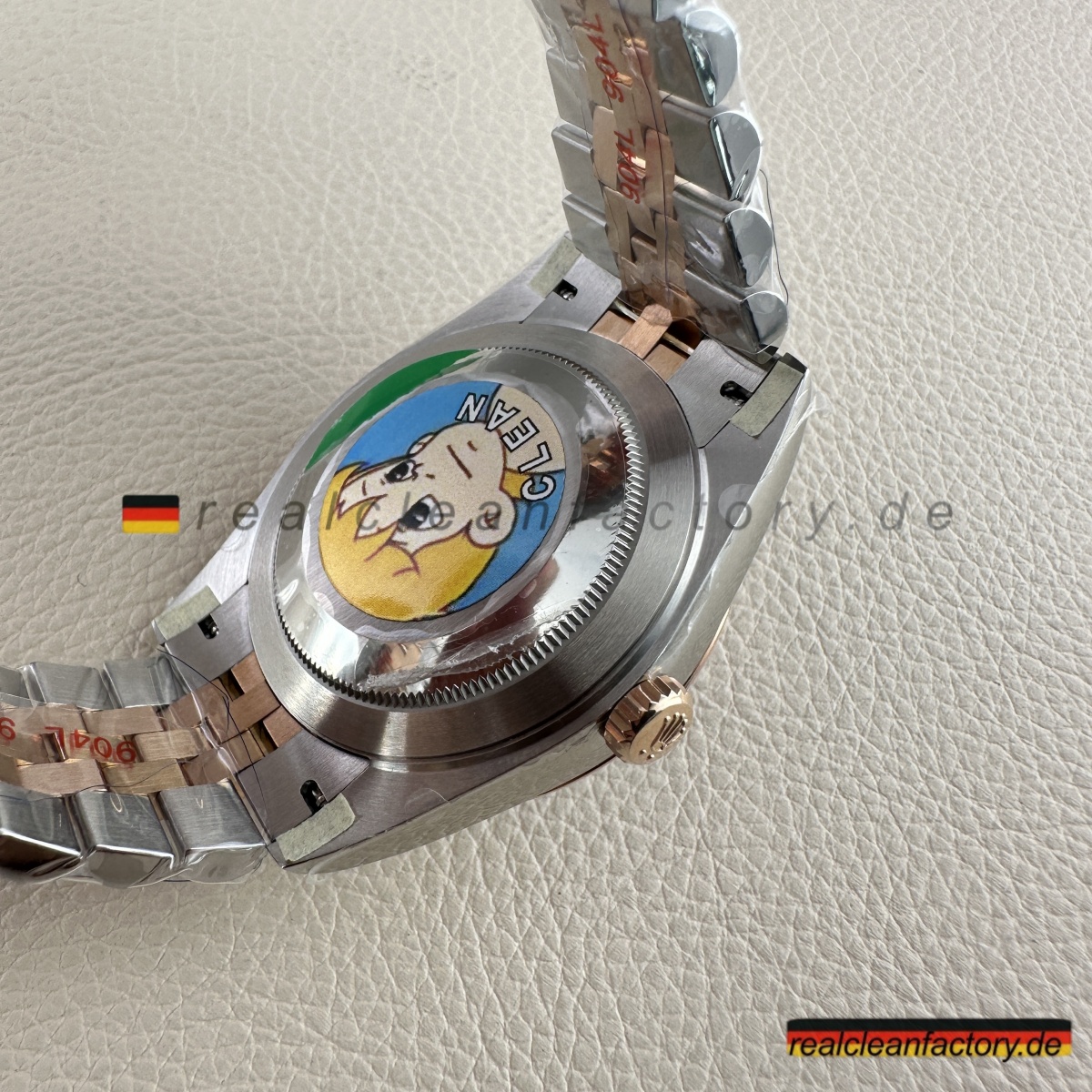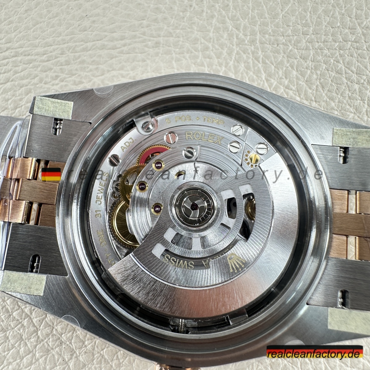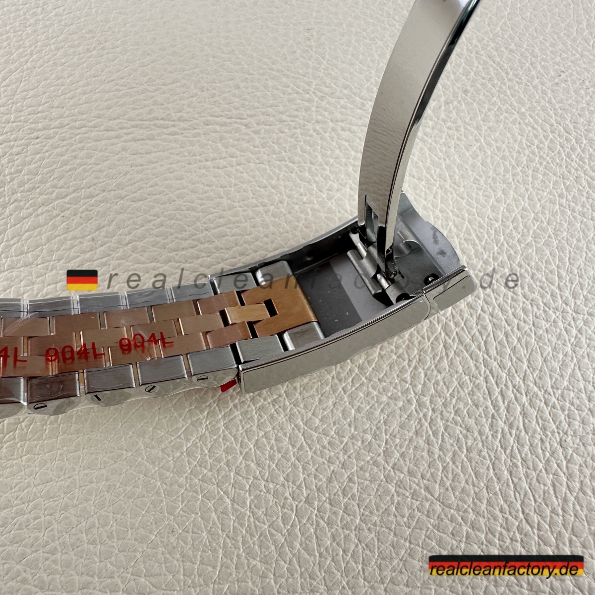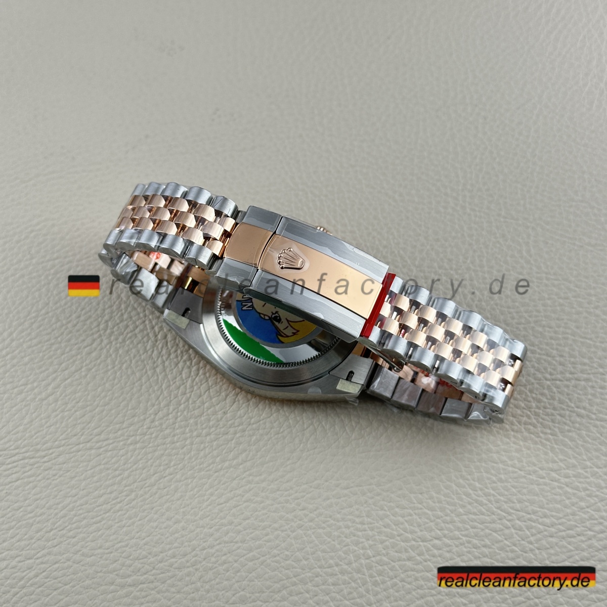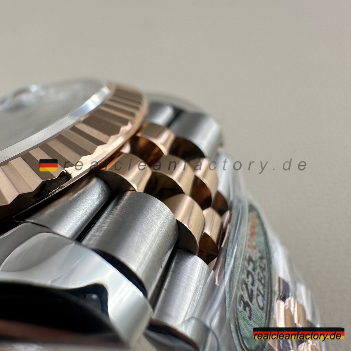 - Die meisten Hersteller meiden diese Kombination komplett, da sie gleich drei hochkomplexe Prozesse gleichzeitig beherrschen müssten: Wimbledon-Zifferblattfertigung, Roségold-Ummantelung der geriffelten Lünette und Jubilee-Bandkonstruktion. Wer sich dennoch daran versucht, scheitert oft an mangelnder Präzision oder unvollkommener Verarbeitung. Clean Factorys Investitionen in modernste Fertigungstechniken und spezielle Ausrüstung ermöglichen ein Ergebnis, das echten Rolex-Originalen in Optik, Haptik und Haltbarkeit beeindruckend nahekommt.