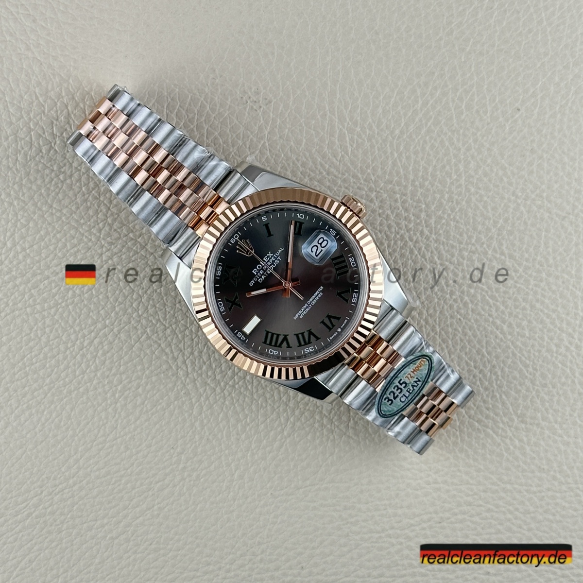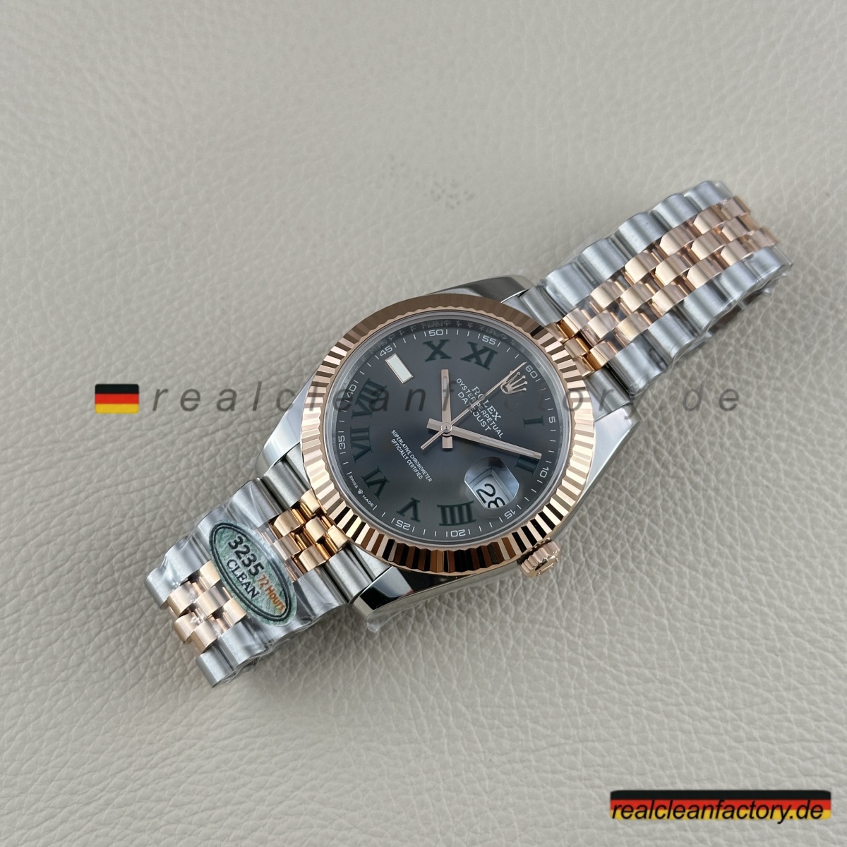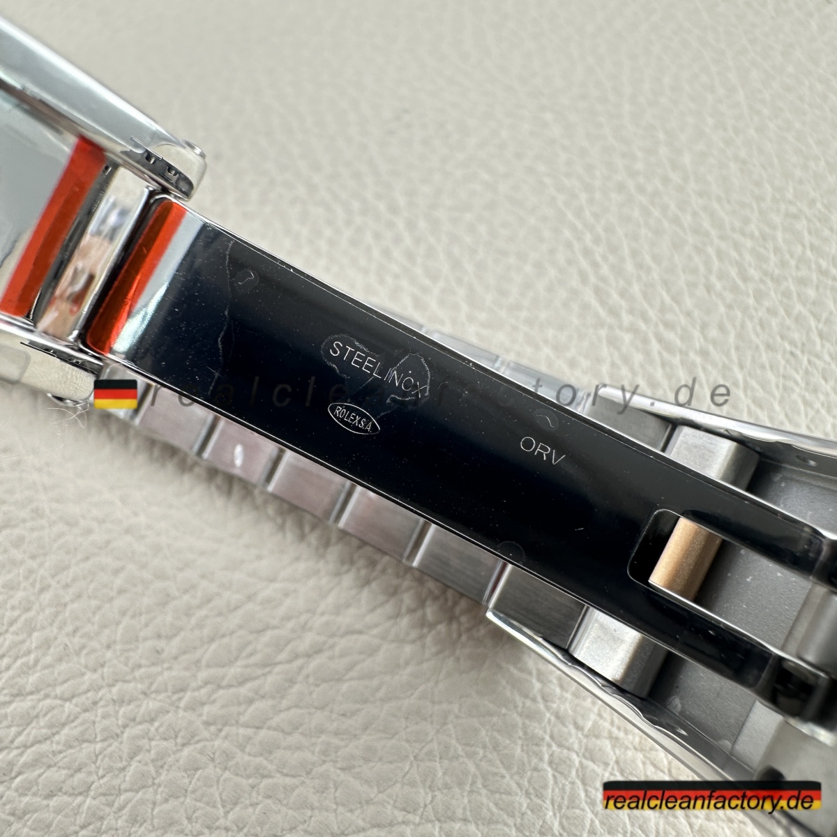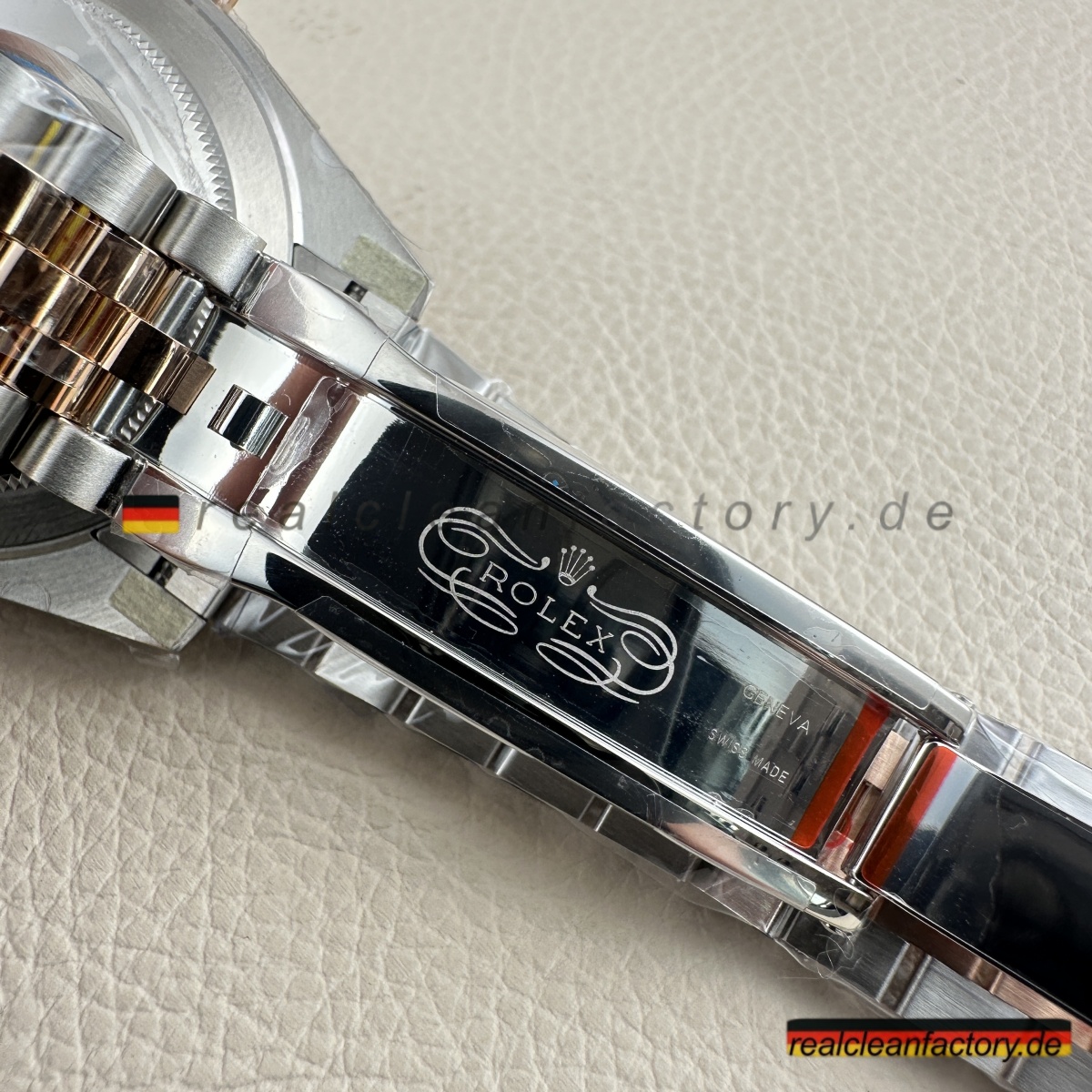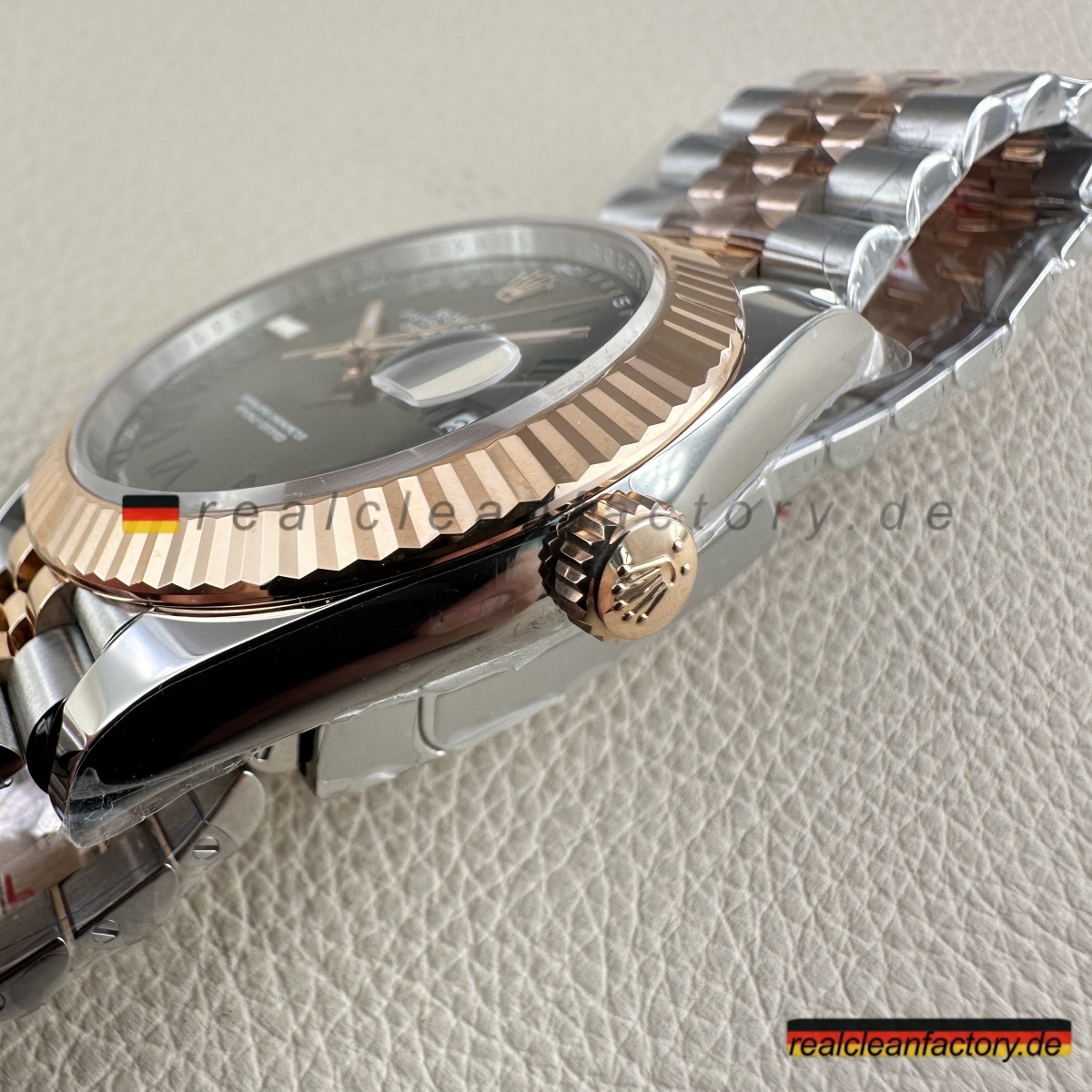 - Die meisten Hersteller meiden diese Kombination komplett, da sie gleich drei hochkomplexe Prozesse gleichzeitig beherrschen müssten: Wimbledon-Zifferblattfertigung, Roségold-Ummantelung der geriffelten Lünette und Jubilee-Bandkonstruktion. Wer sich dennoch daran versucht, scheitert oft an mangelnder Präzision oder unvollkommener Verarbeitung. Clean Factorys Investitionen in modernste Fertigungstechniken und spezielle Ausrüstung ermöglichen ein Ergebnis, das echten Rolex-Originalen in Optik, Haptik und Haltbarkeit beeindruckend nahekommt.
