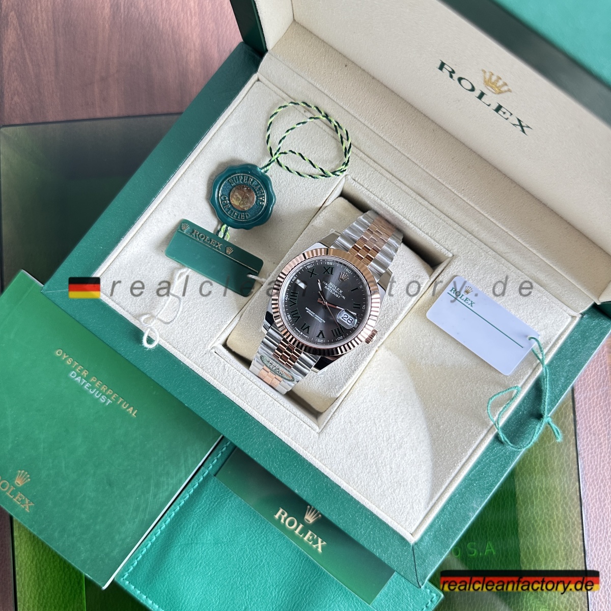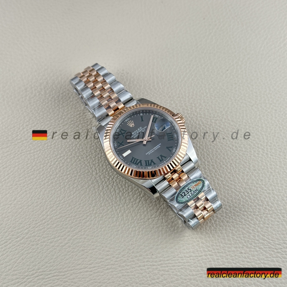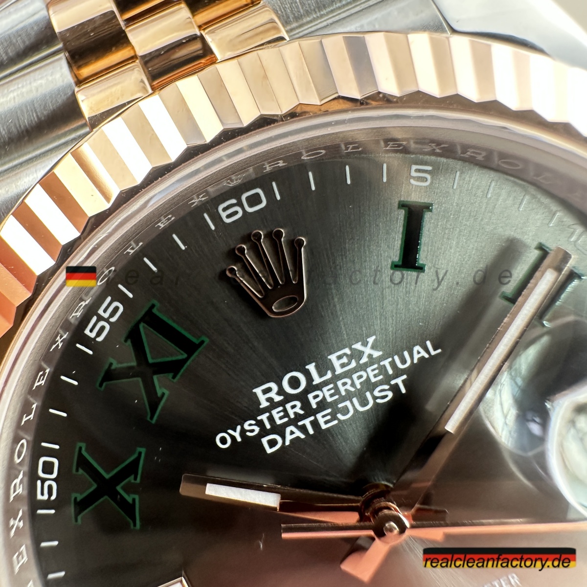 - Clean Factorys Rolex Datejust 126331-0016 vereint einige der anspruchsvollsten Elemente der Luxusuhrenfertigung in einer einzigen Referenz. Hier treffen die Roségold-Ummantelung der geriffelten Lünette, das Wimbledon-Zifferblatt mit seiner charakteristischen zweifarbigen Kombination aus Schiefergrau und Grün sowie die fünfteilige Jubilee-Bandkonstruktion zusammen – jedes dieser Merkmale ist für sich bereits eine große Herausforderung, die kaum ein Hersteller gleichzeitig bewältigt.