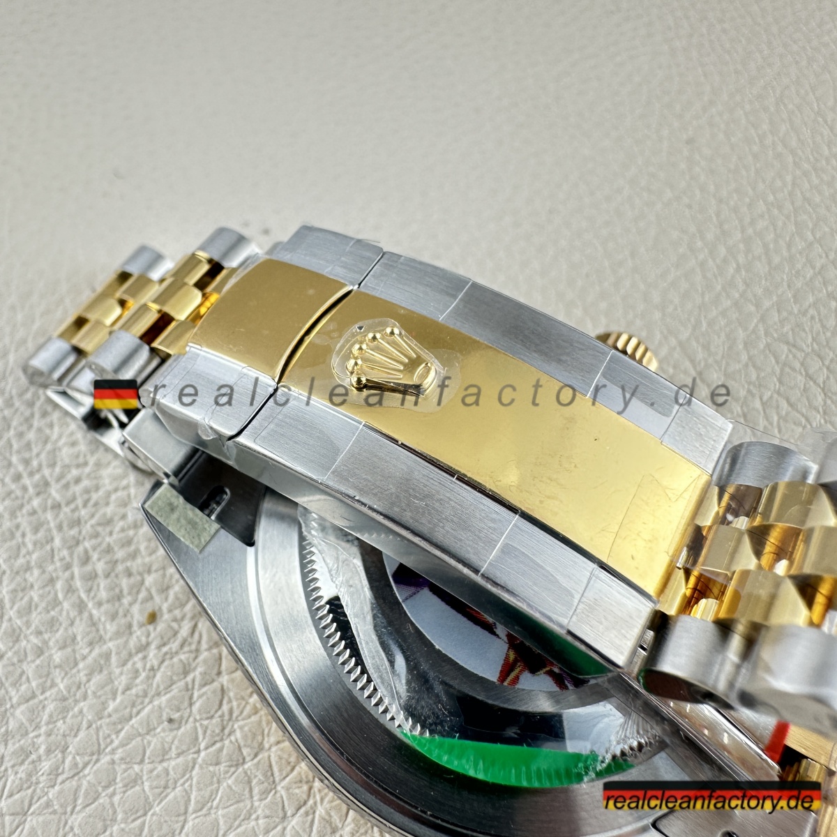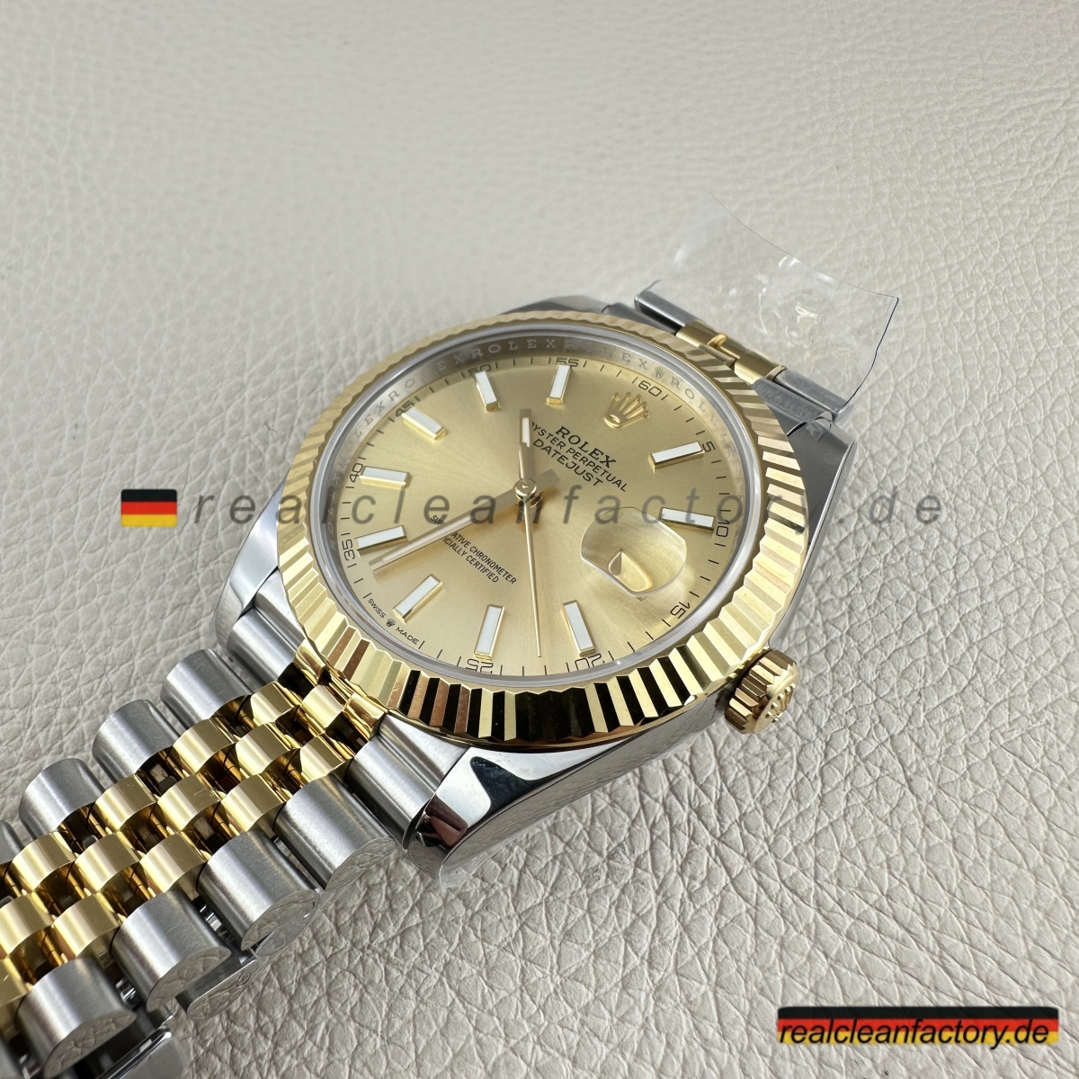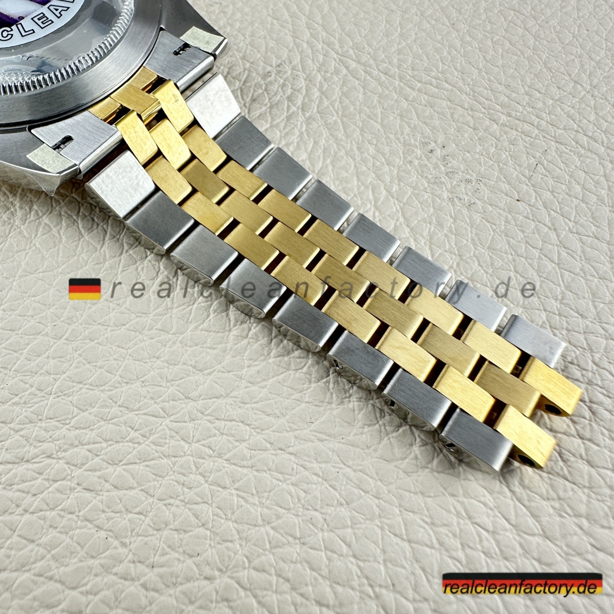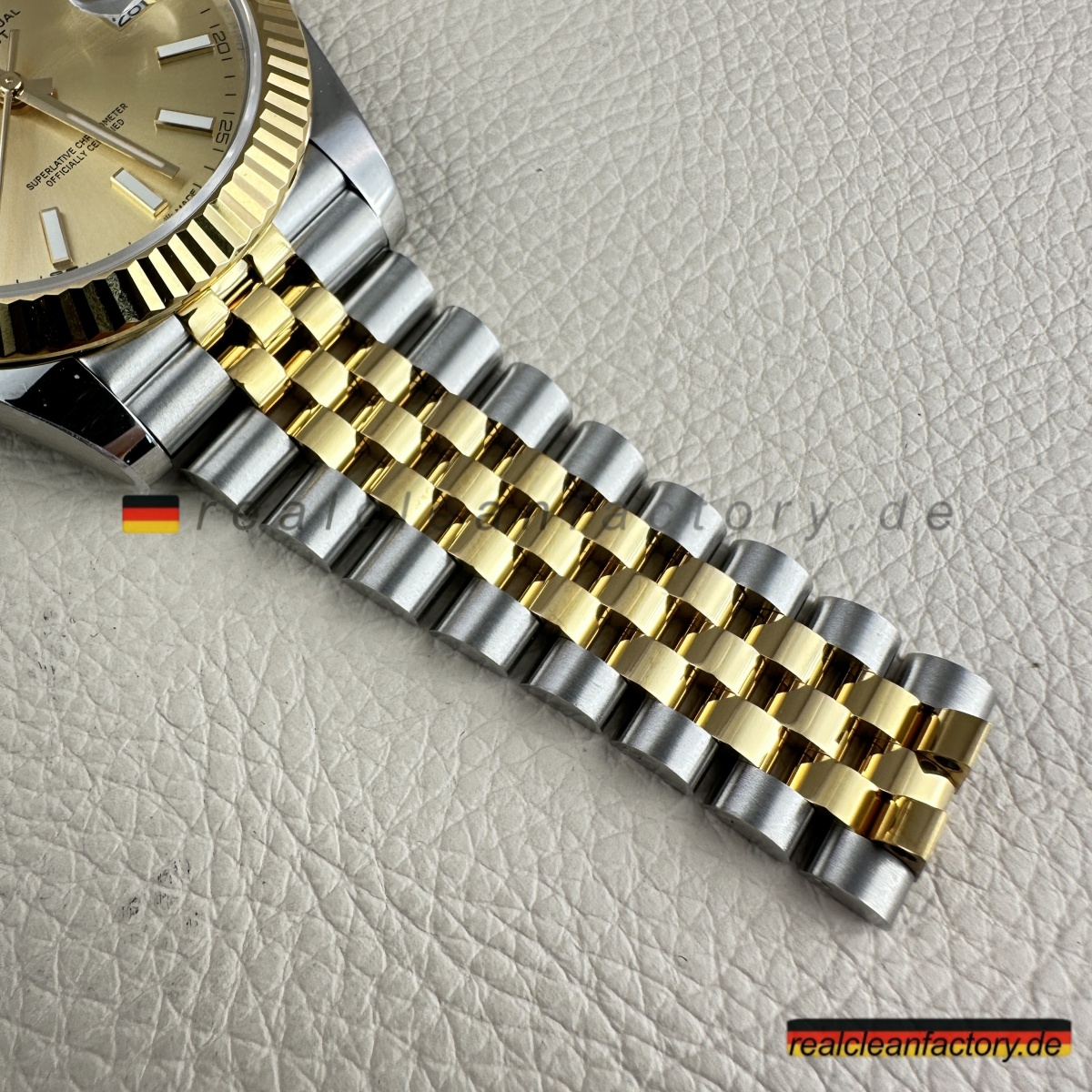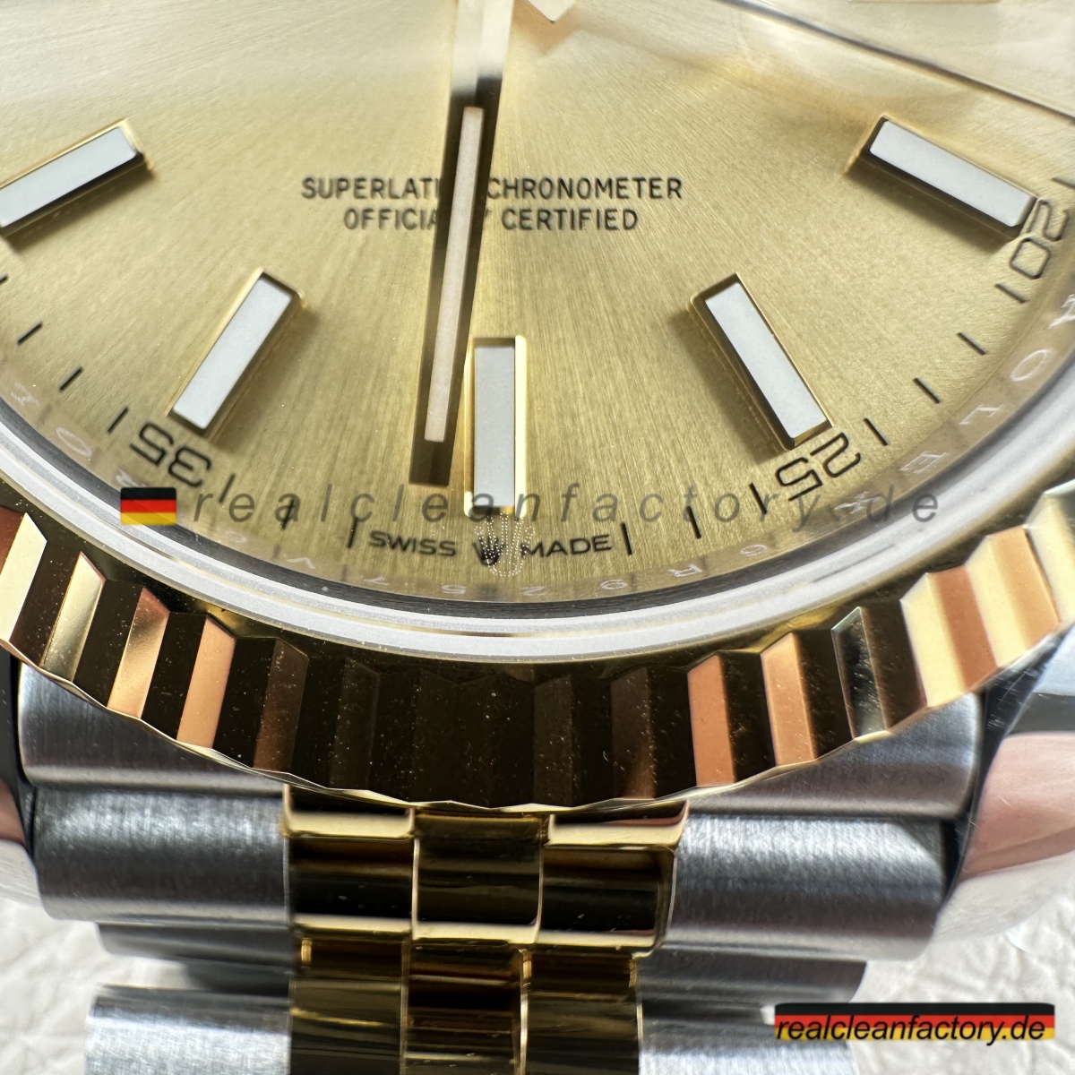 • Die exakte Abstimmung der Gelbgoldtöne von Lünette, Armband und Krone ist essenziell. Die reflektierende Oberfläche des Champagner-Zifferblatts verstärkt selbst kleinste Abweichungen – deshalb hat Clean Factory spezielle Verfahren entwickelt, um ein absolut einheitliches, hochwertiges Erscheinungsbild zu gewährleisten.