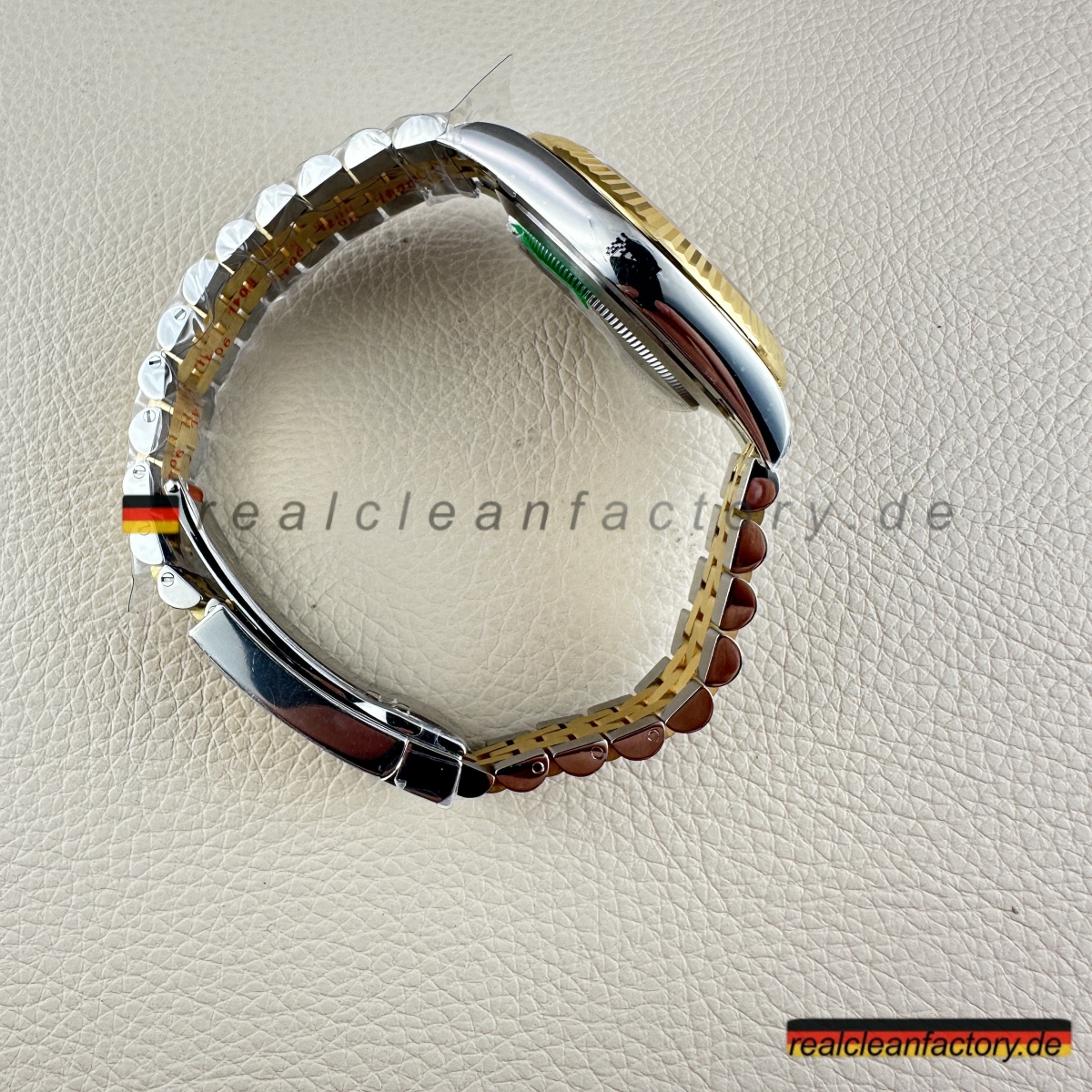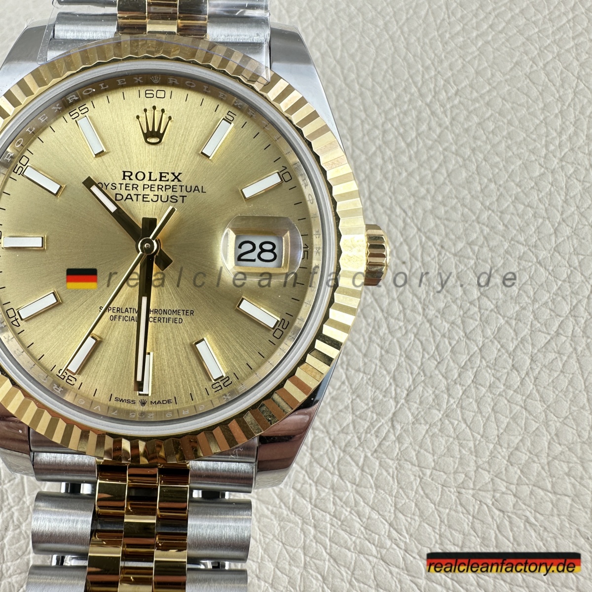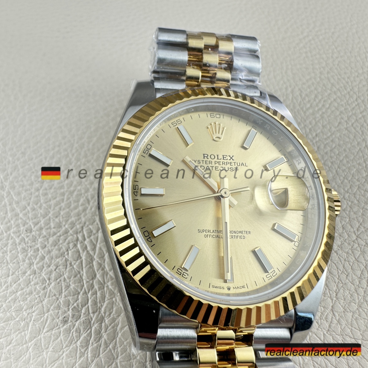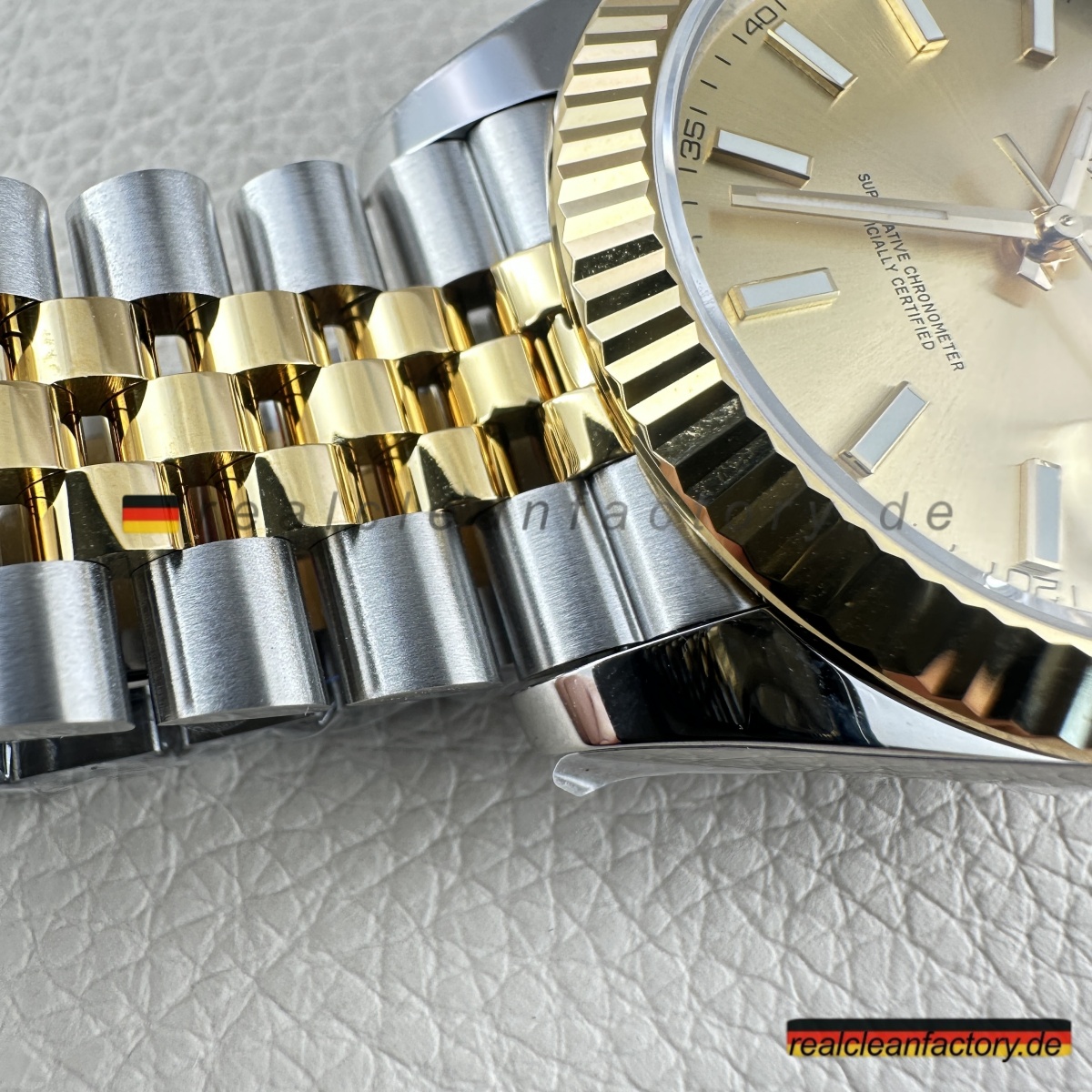 • Die exakte Abstimmung der Gelbgoldtöne von Lünette, Armband und Krone ist essenziell. Die reflektierende Oberfläche des Champagner-Zifferblatts verstärkt selbst kleinste Abweichungen – deshalb hat Clean Factory spezielle Verfahren entwickelt, um ein absolut einheitliches, hochwertiges Erscheinungsbild zu gewährleisten.