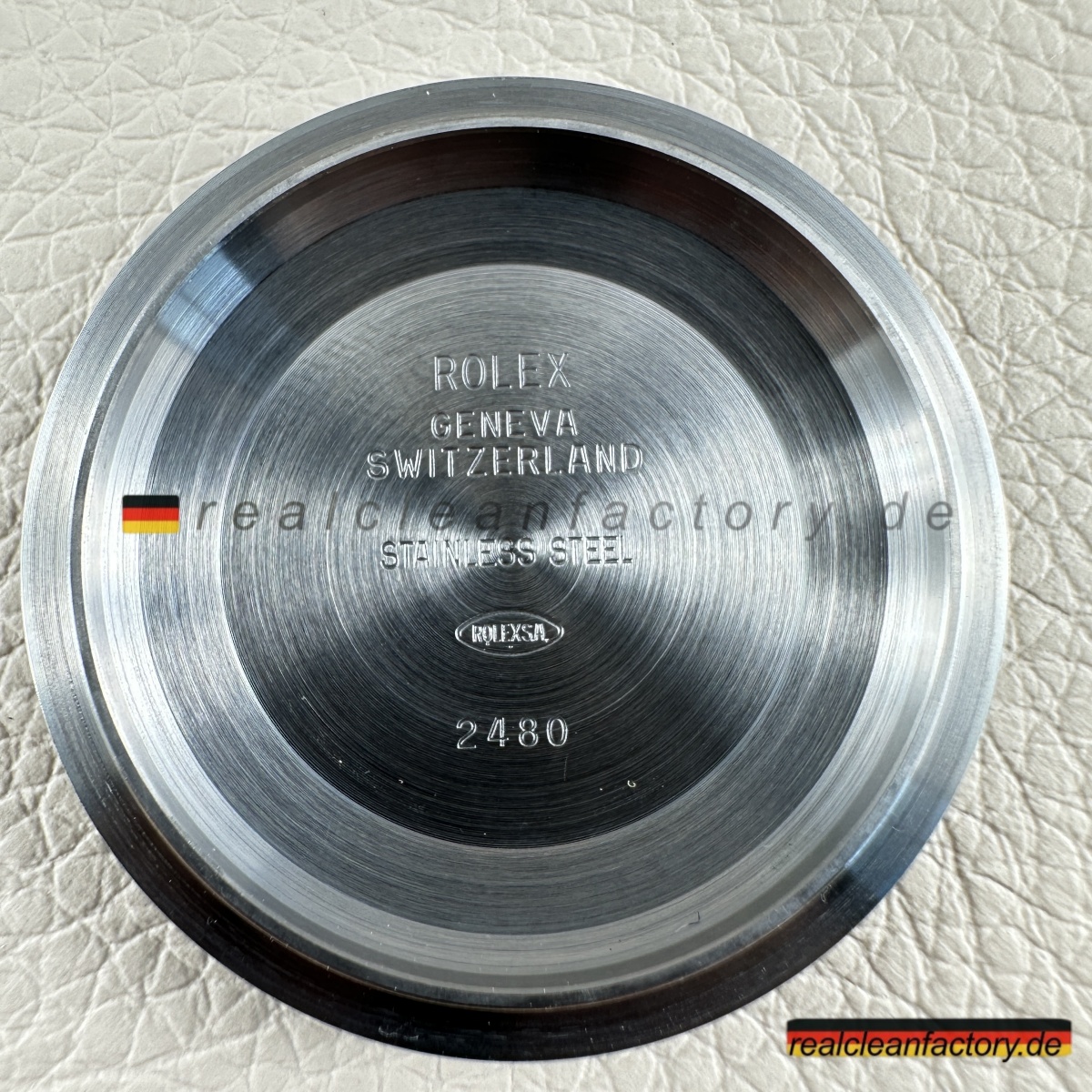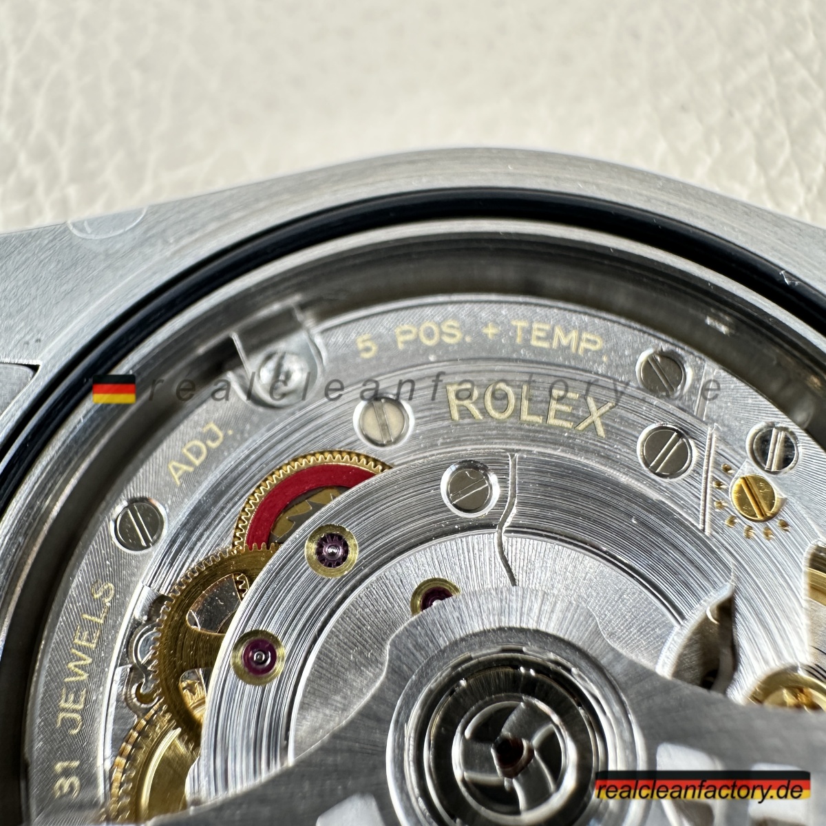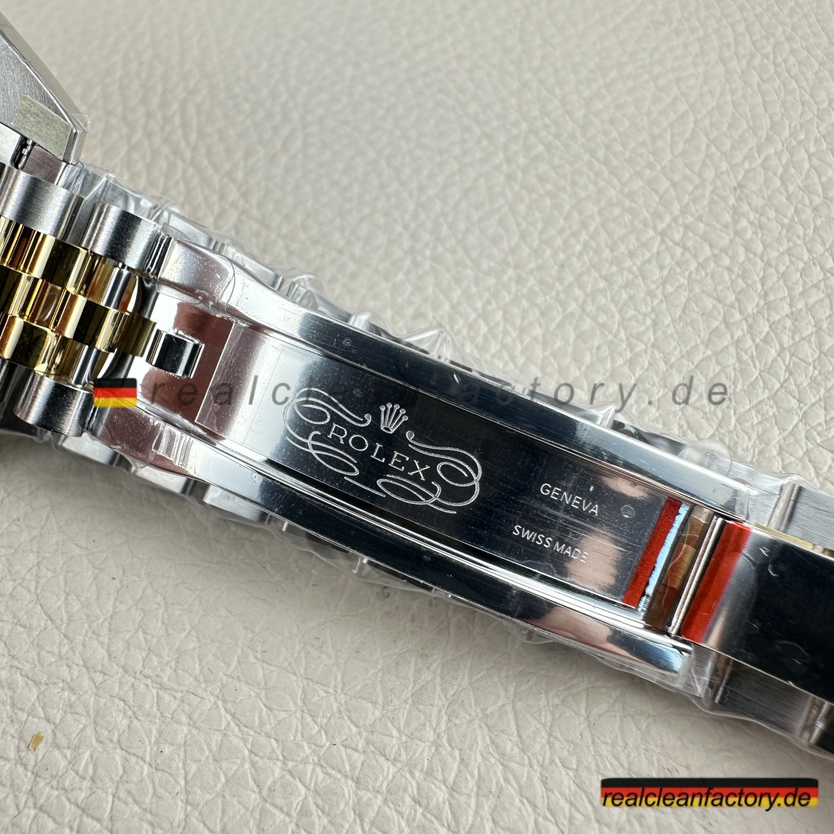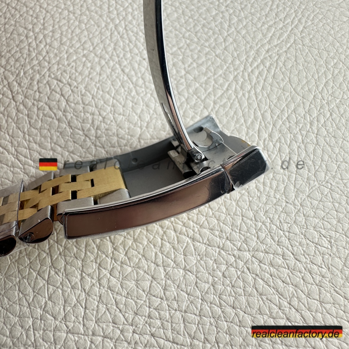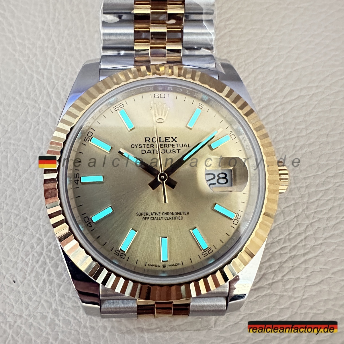 • Die exakte Abstimmung der Gelbgoldtöne von Lünette, Armband und Krone ist essenziell. Die reflektierende Oberfläche des Champagner-Zifferblatts verstärkt selbst kleinste Abweichungen – deshalb hat Clean Factory spezielle Verfahren entwickelt, um ein absolut einheitliches, hochwertiges Erscheinungsbild zu gewährleisten.