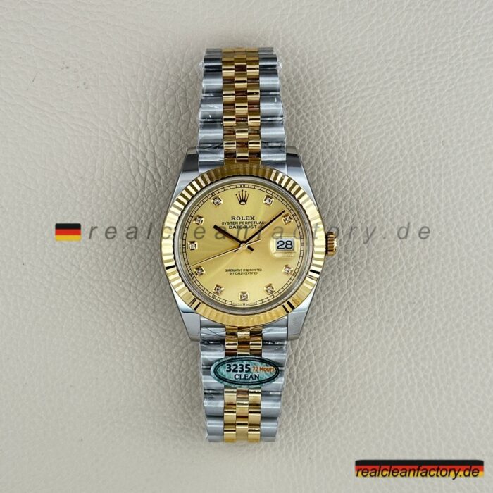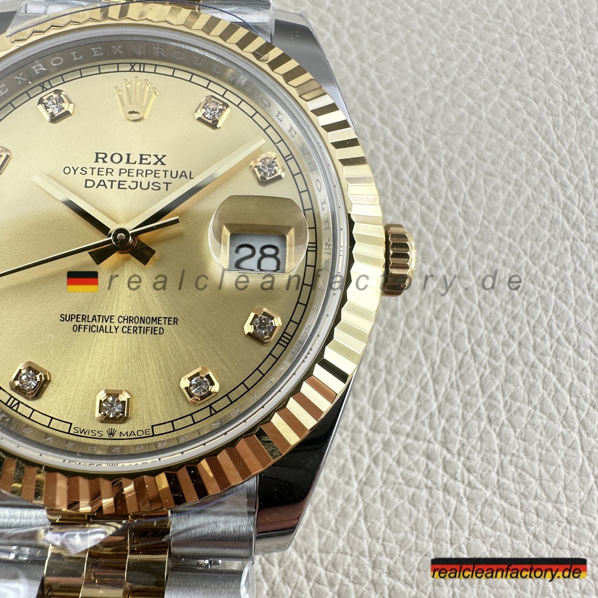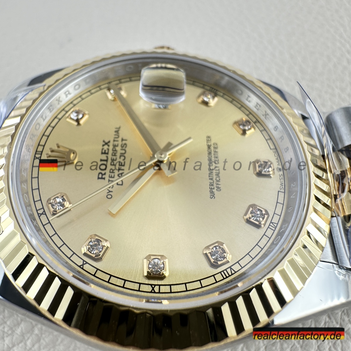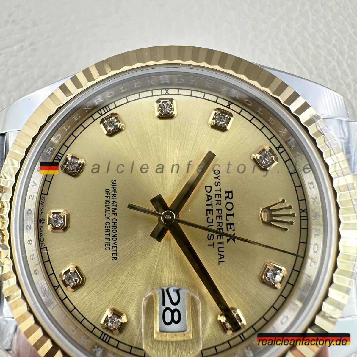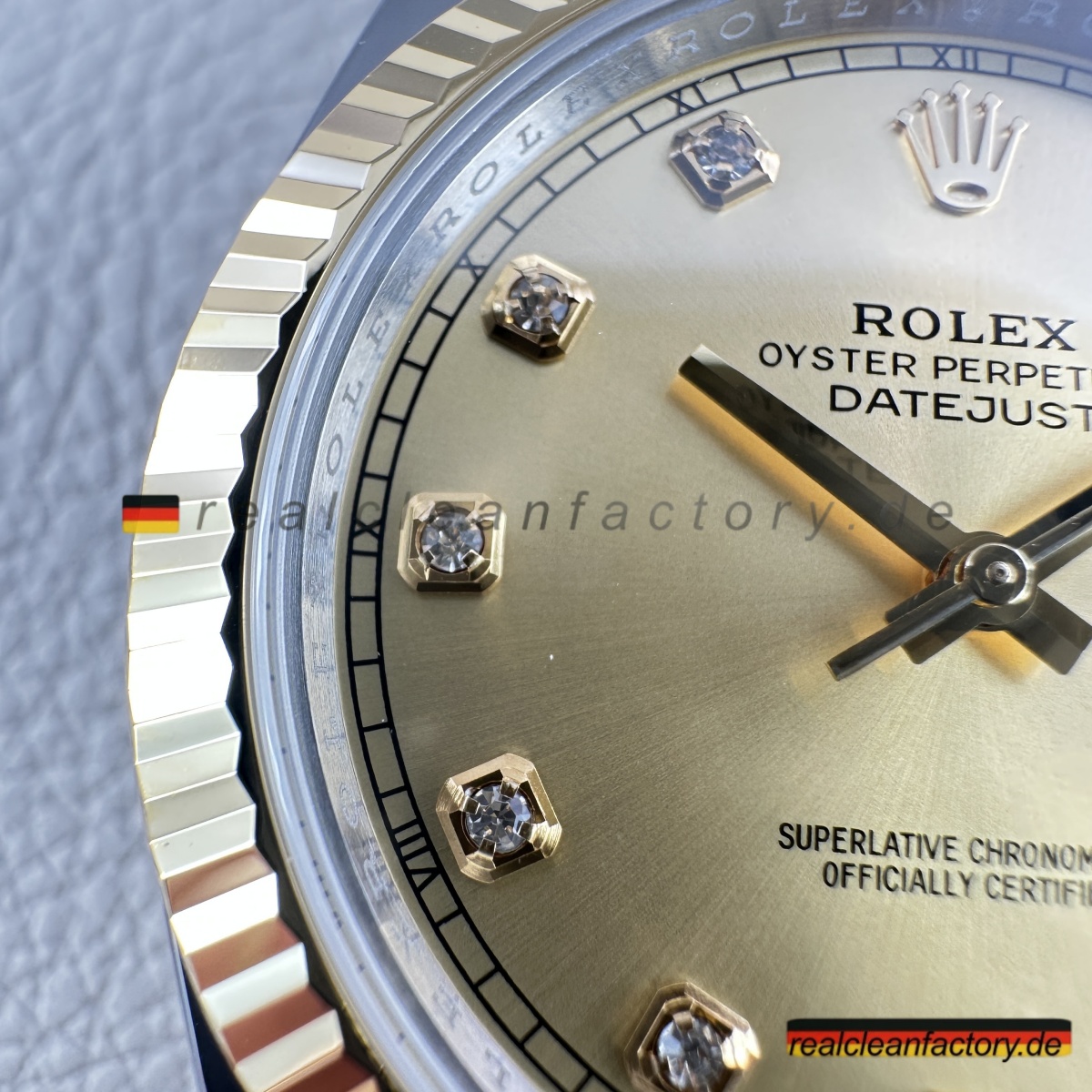 - Diese perfekte Harmonie aus Champagner-Zifferblatt, Gelbgold und Diamantakzenten erfordert präzise Abstimmung. Selbst kleine Unterschiede in Goldton oder Ausrichtung der Indizes würden sofort auffallen. Clean Factorys kompromisslose Konsistenz sorgt für ein stimmiges Erscheinungsbild, das dem Namen Rolex gerecht wird.