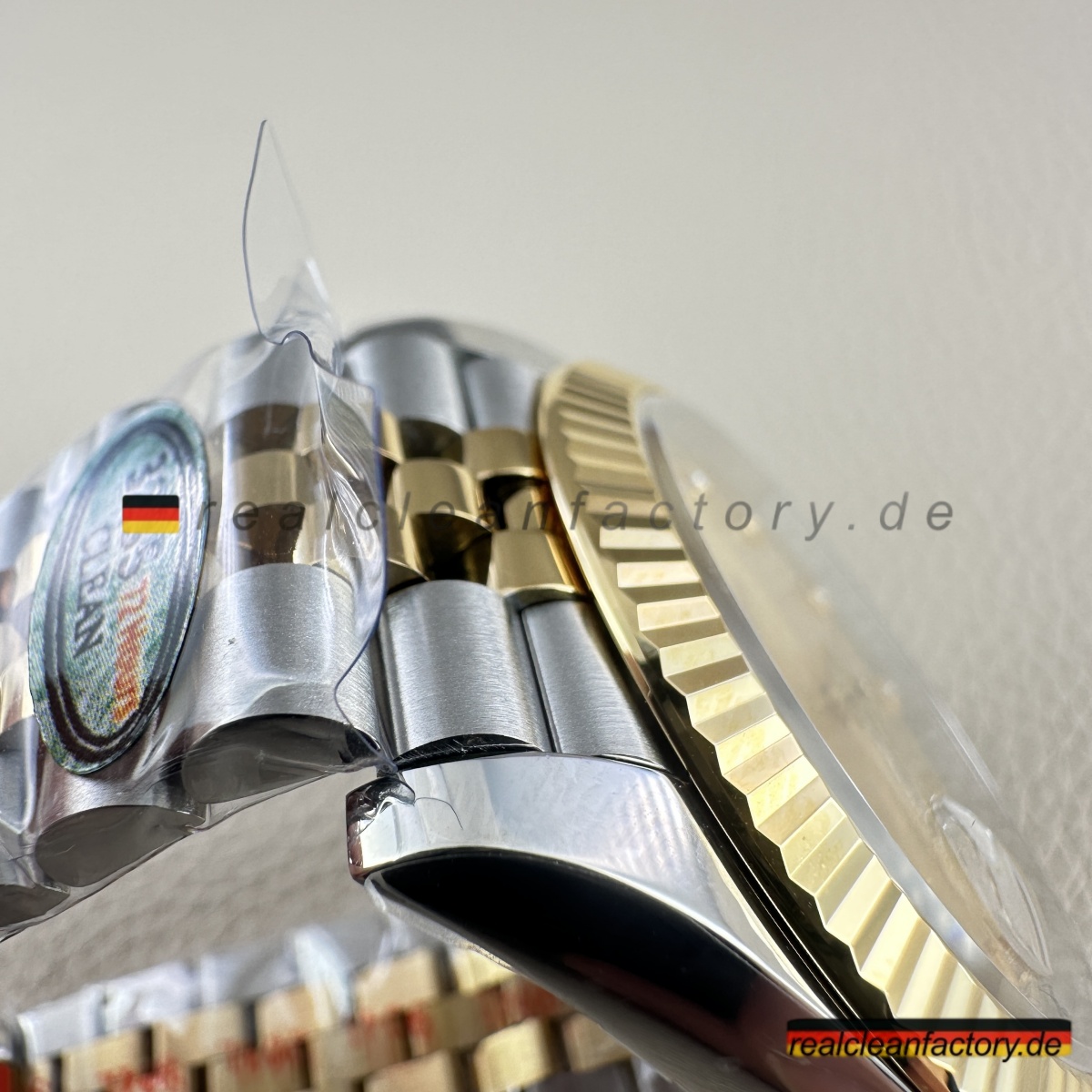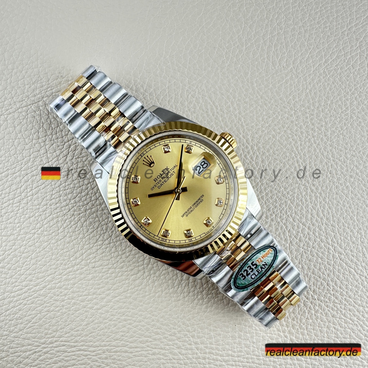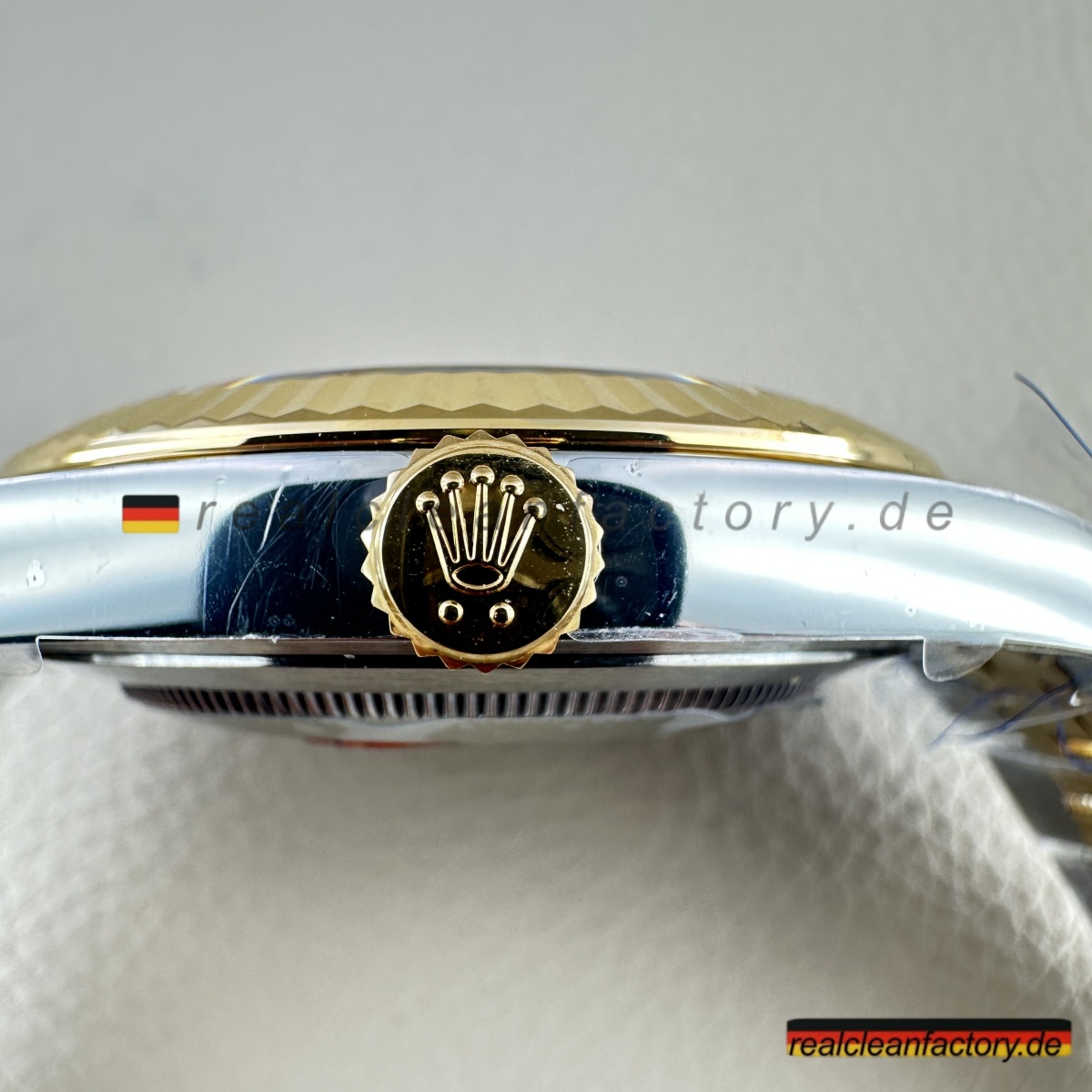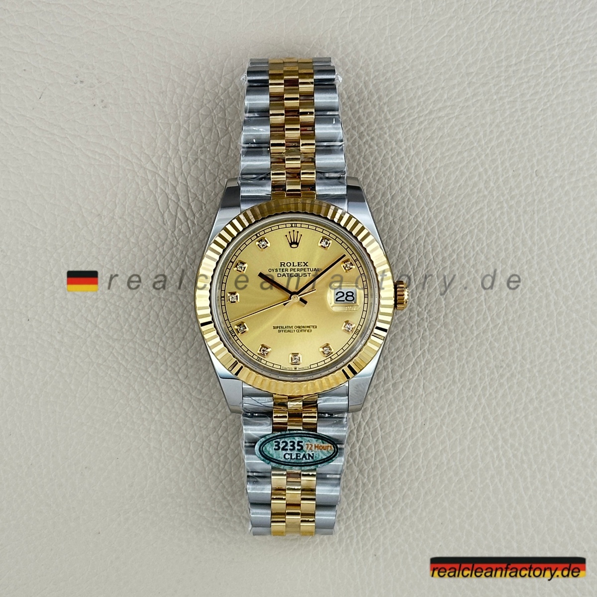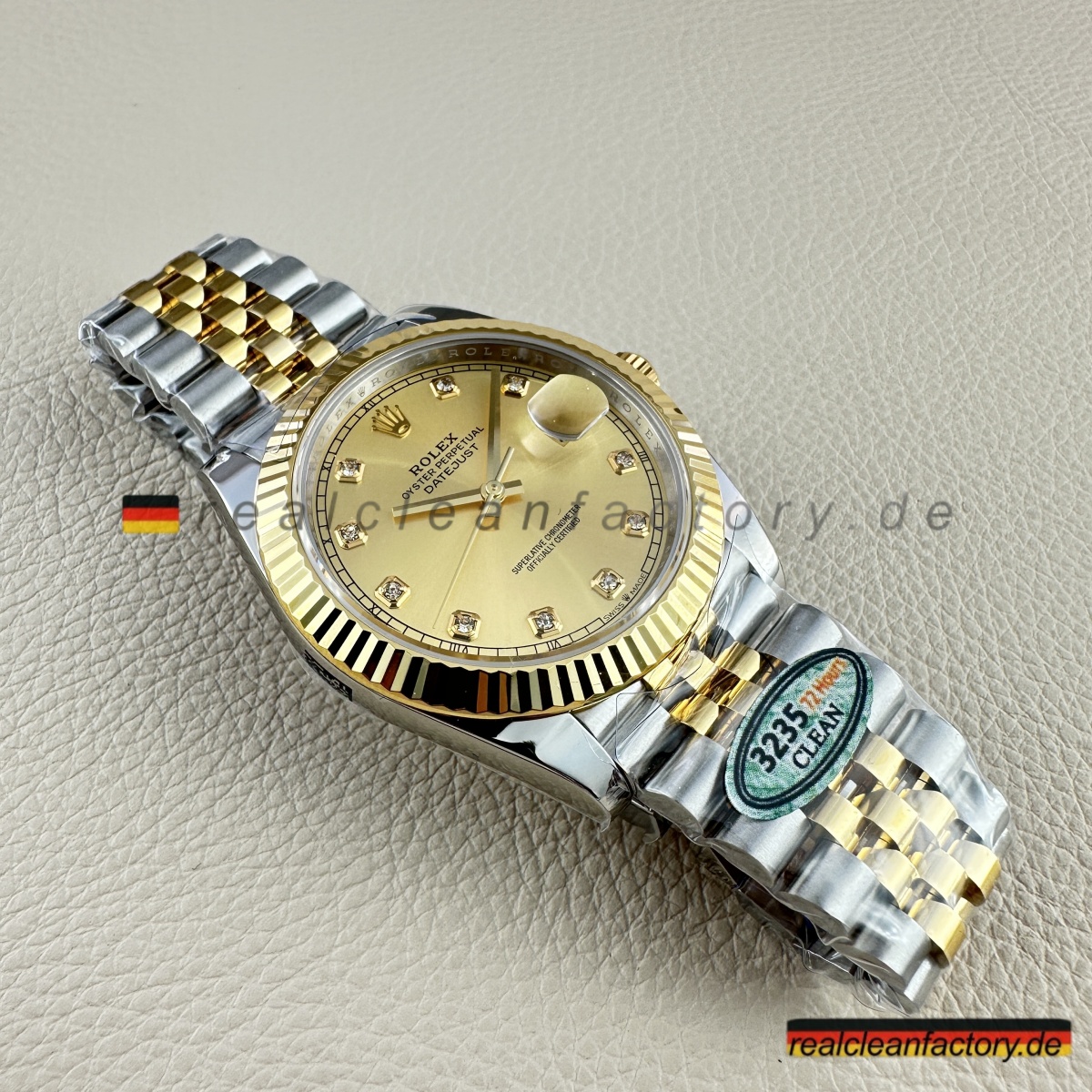 - Diese perfekte Harmonie aus Champagner-Zifferblatt, Gelbgold und Diamantakzenten erfordert präzise Abstimmung. Selbst kleine Unterschiede in Goldton oder Ausrichtung der Indizes würden sofort auffallen. Clean Factorys kompromisslose Konsistenz sorgt für ein stimmiges Erscheinungsbild, das dem Namen Rolex gerecht wird.