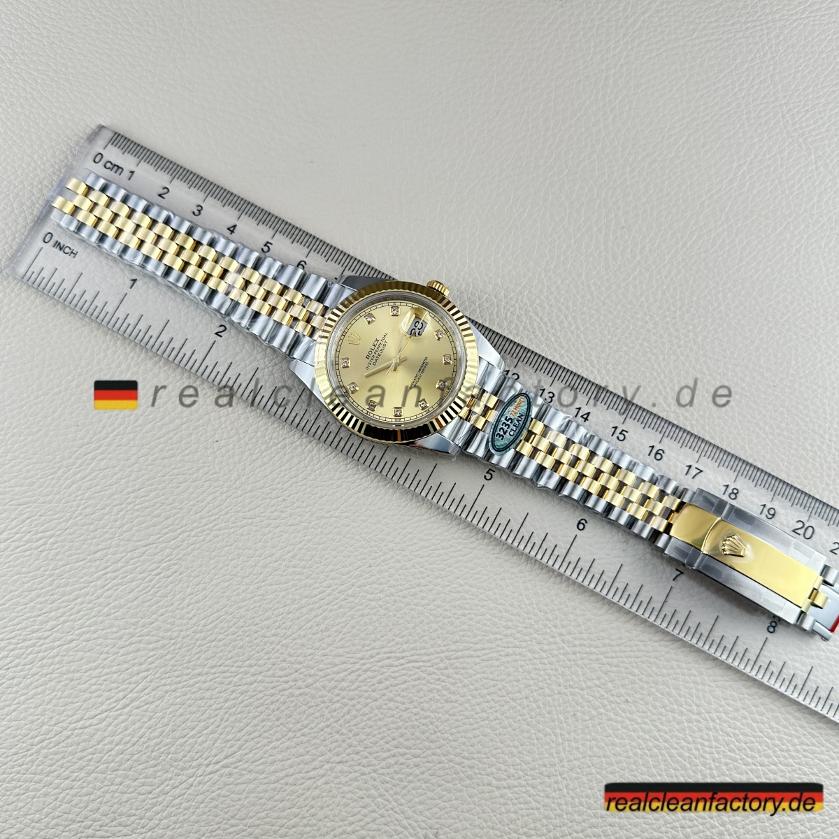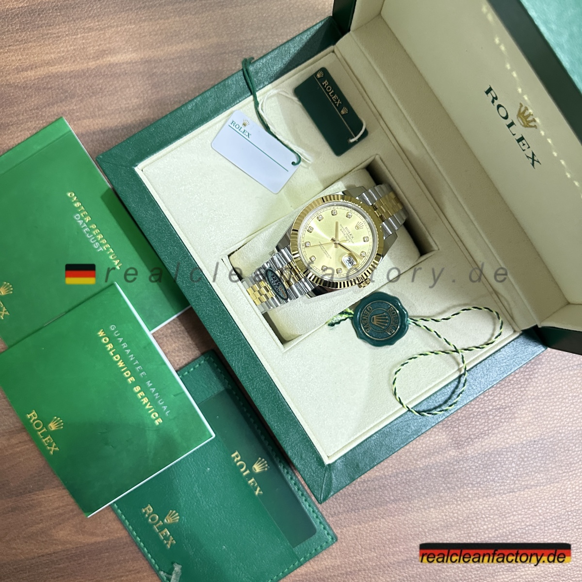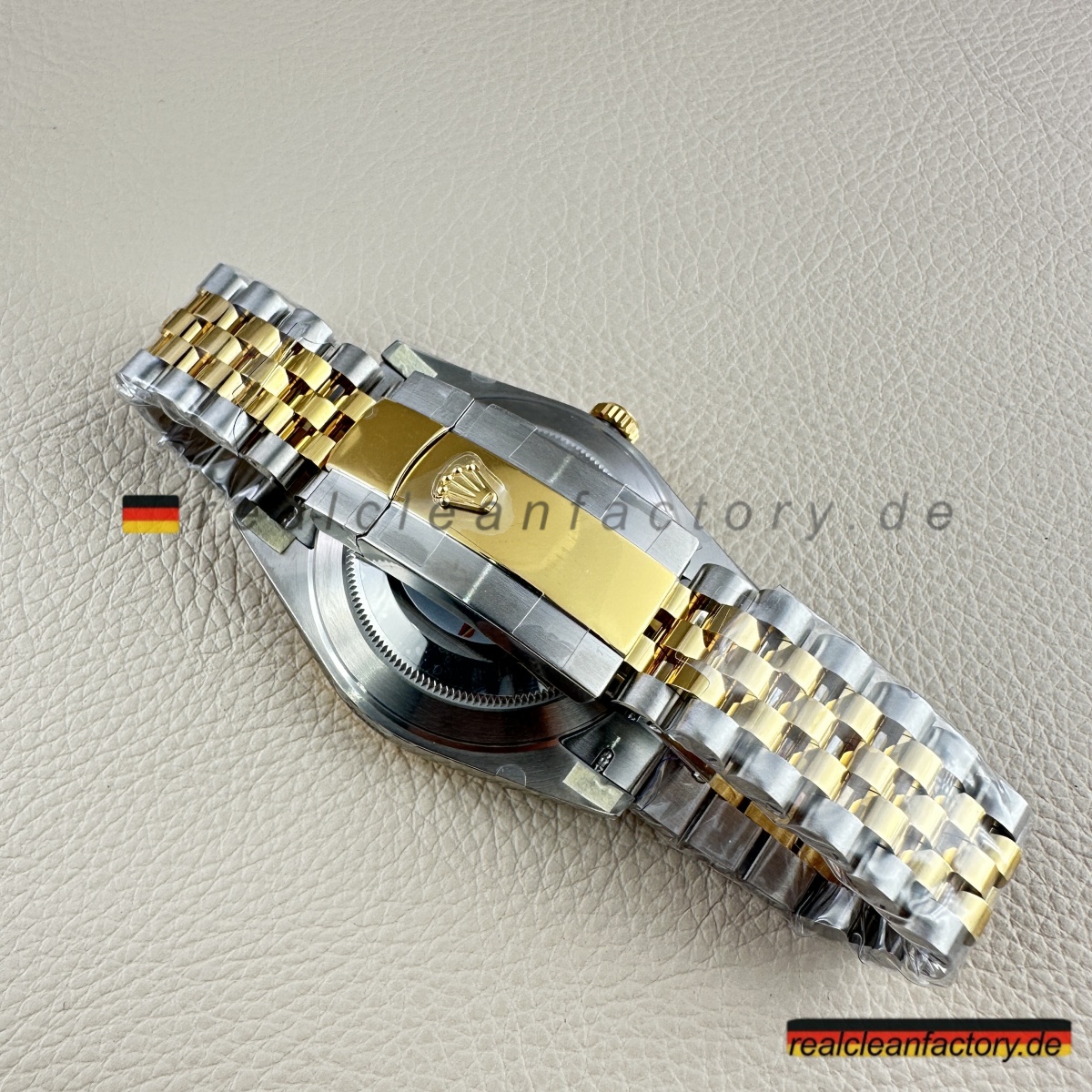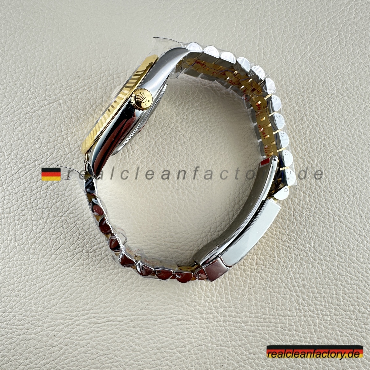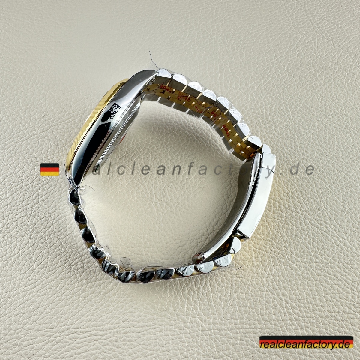 - Diese perfekte Harmonie aus Champagner-Zifferblatt, Gelbgold und Diamantakzenten erfordert präzise Abstimmung. Selbst kleine Unterschiede in Goldton oder Ausrichtung der Indizes würden sofort auffallen. Clean Factorys kompromisslose Konsistenz sorgt für ein stimmiges Erscheinungsbild, das dem Namen Rolex gerecht wird.