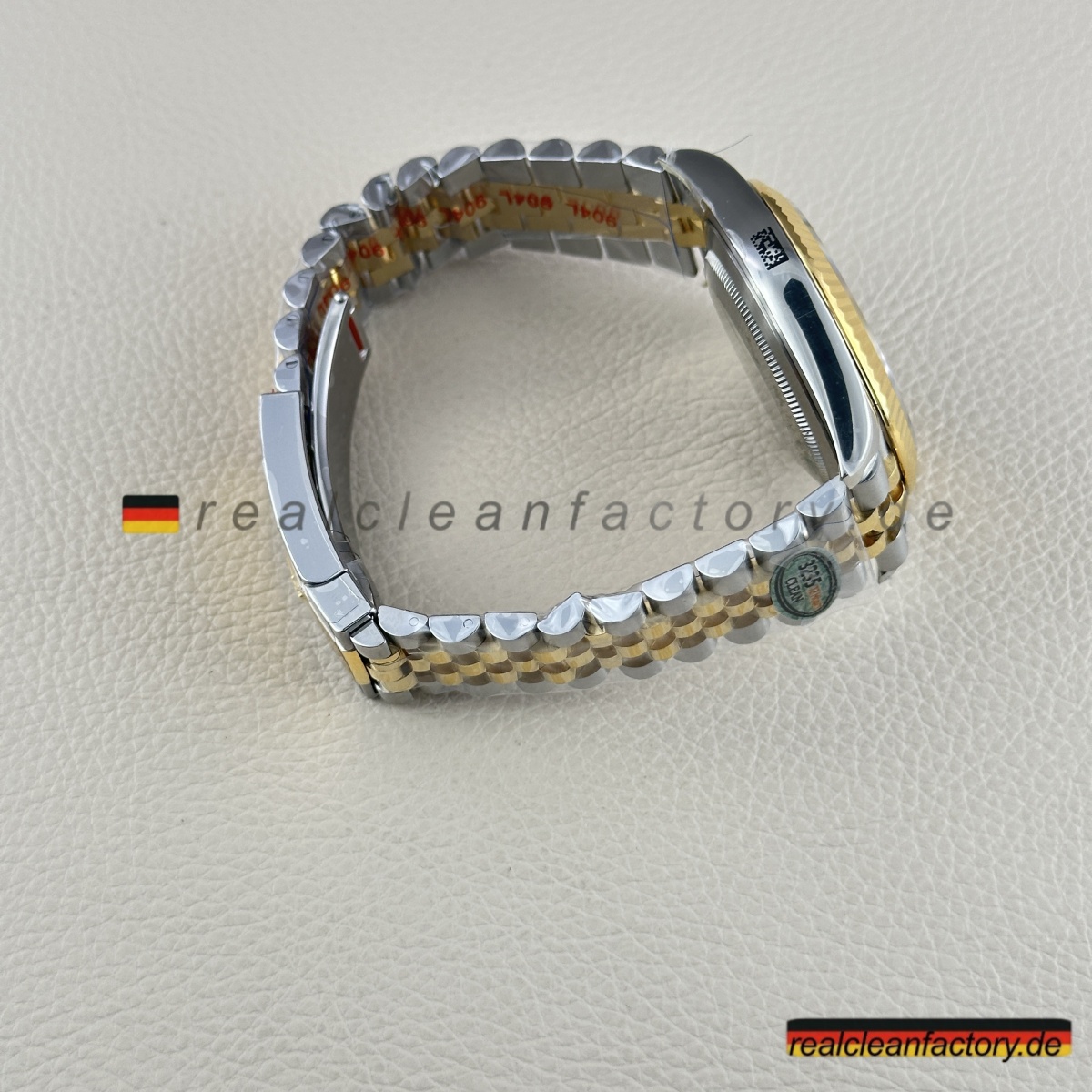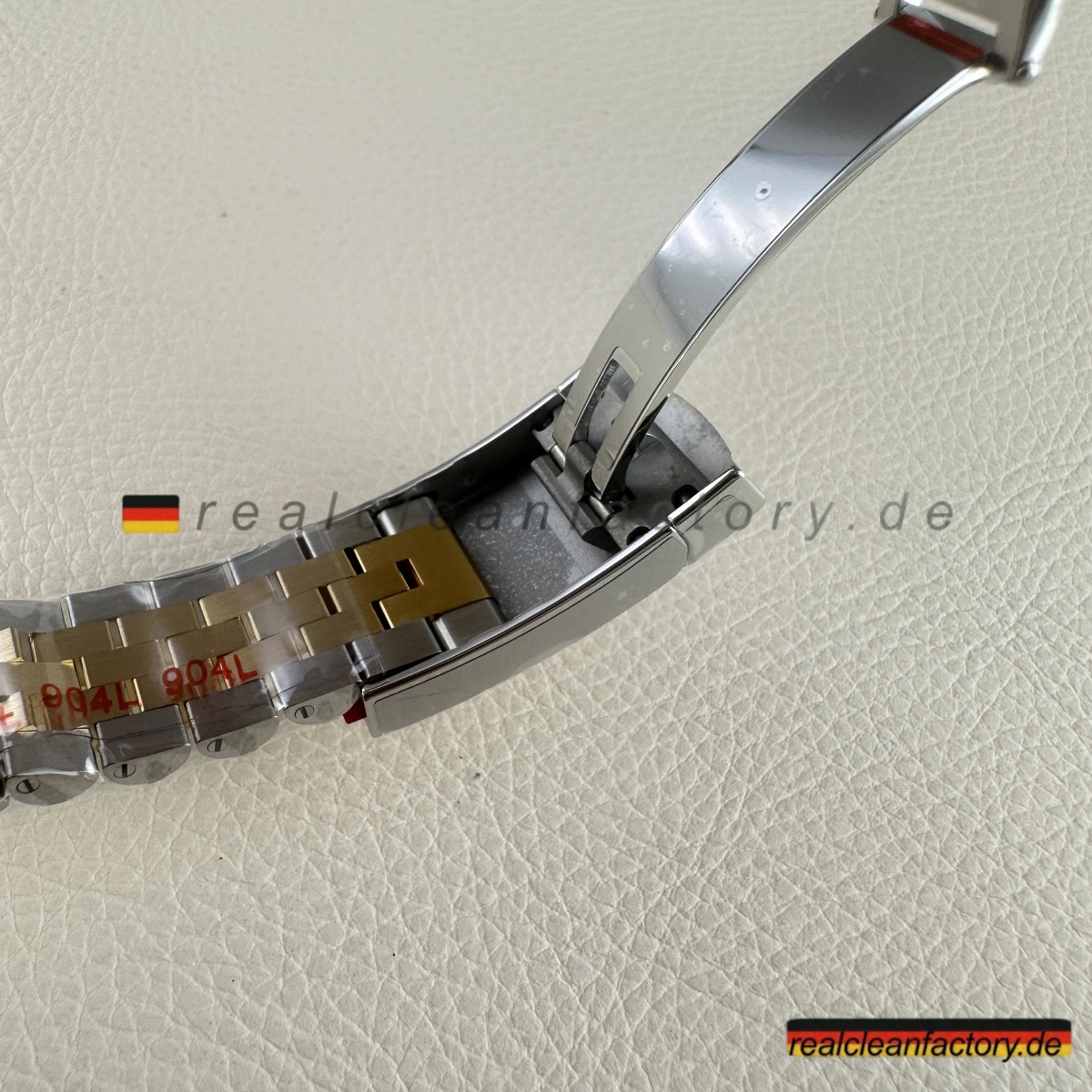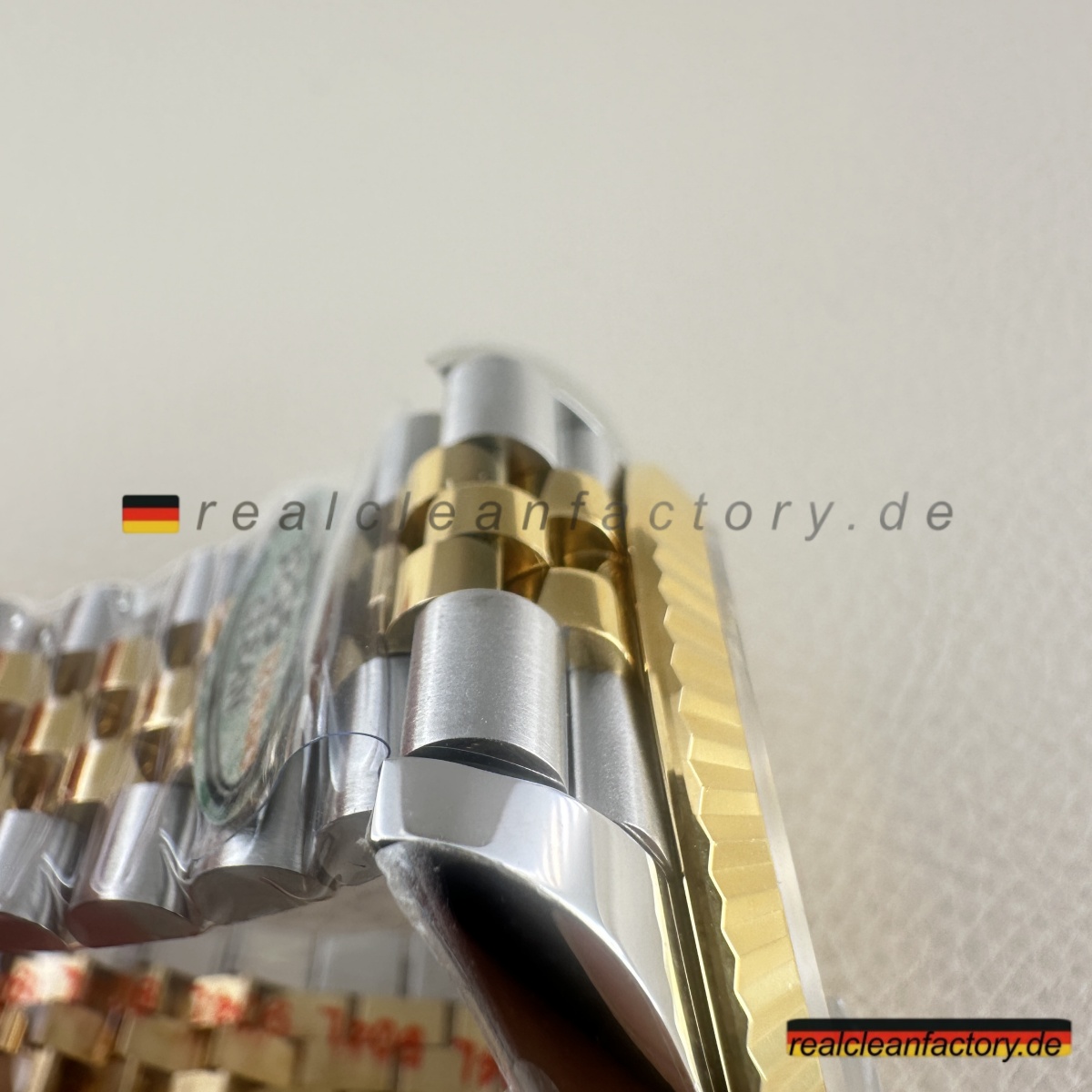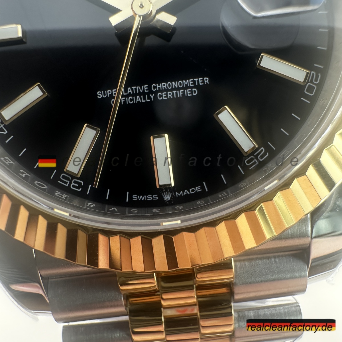 - Das Jubilee-Armband hebt diese Uhr in die Liga echter formeller Luxusikonen. Seine fünfteilige Gliederkonstruktion erfordert höchste Präzision – jedes einzelne Glied muss sich geschmeidig bewegen und den Goldton der Lünette exakt treffen. Die Herausforderung wächst durch das schwarze Zifferblatt, da jede Abweichung in Farbton oder Verarbeitung hier besonders stark auffällt. Clean Factory stellt durch aufwendige Prozesse sicher, dass alle Komponenten – von der Lünette bis zu jedem einzelnen Glied – perfekt zusammenpassen.