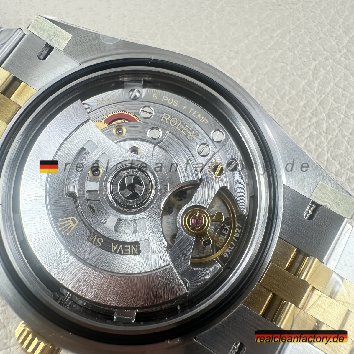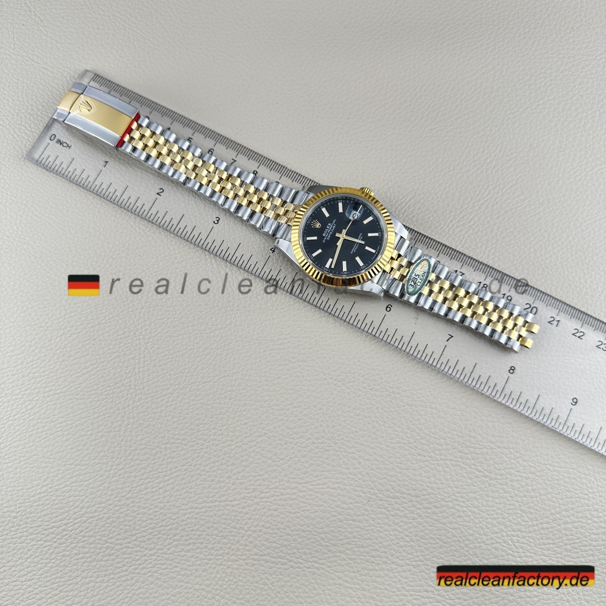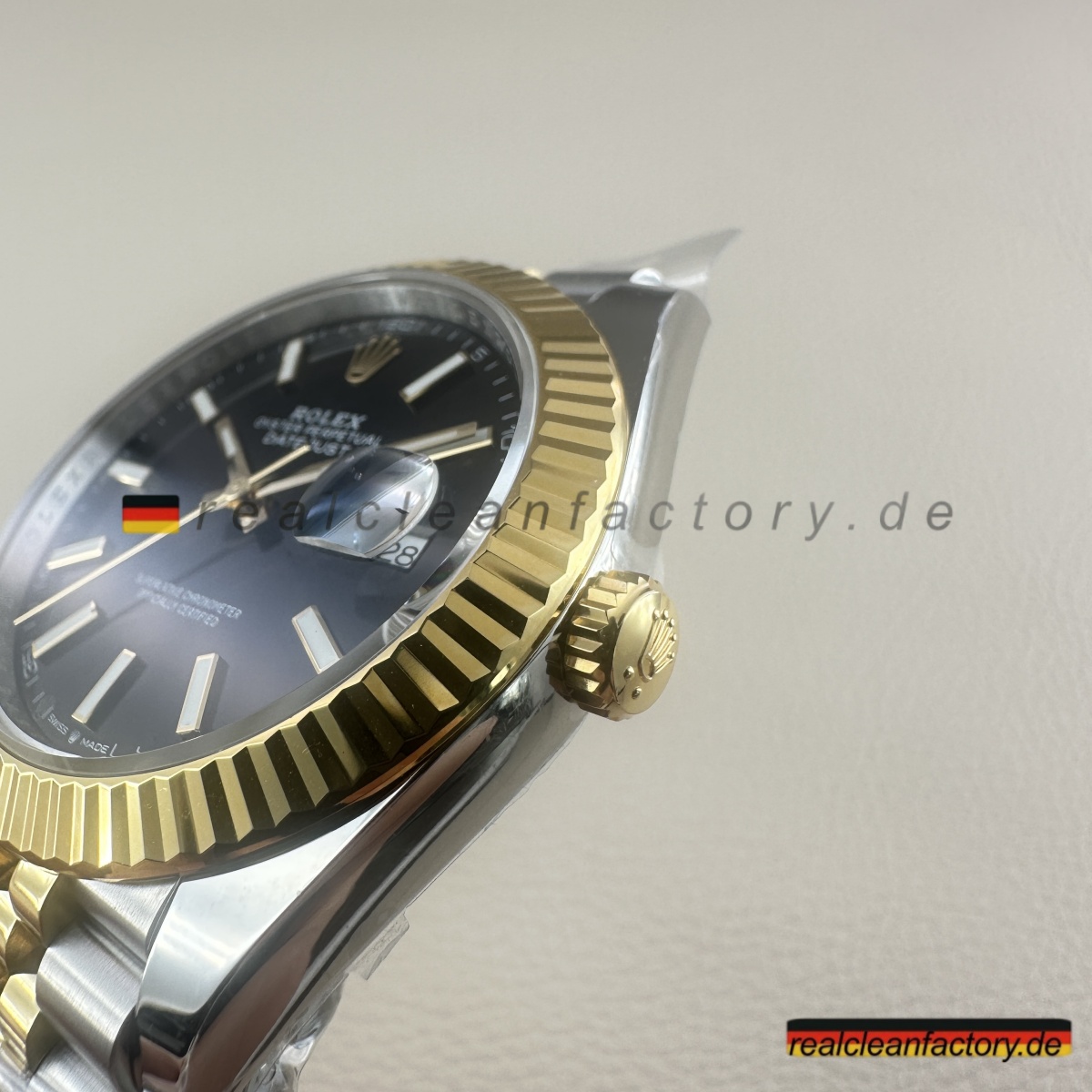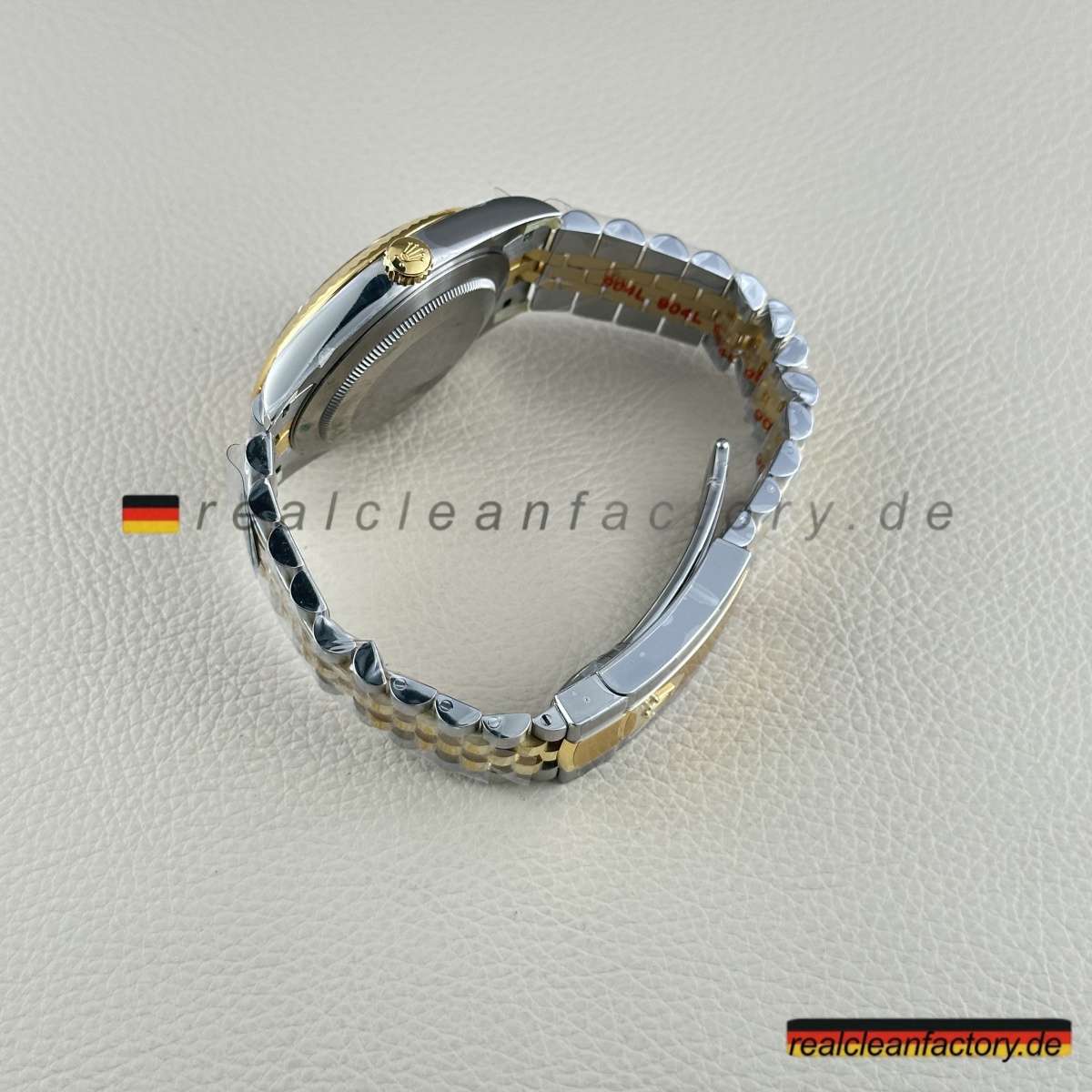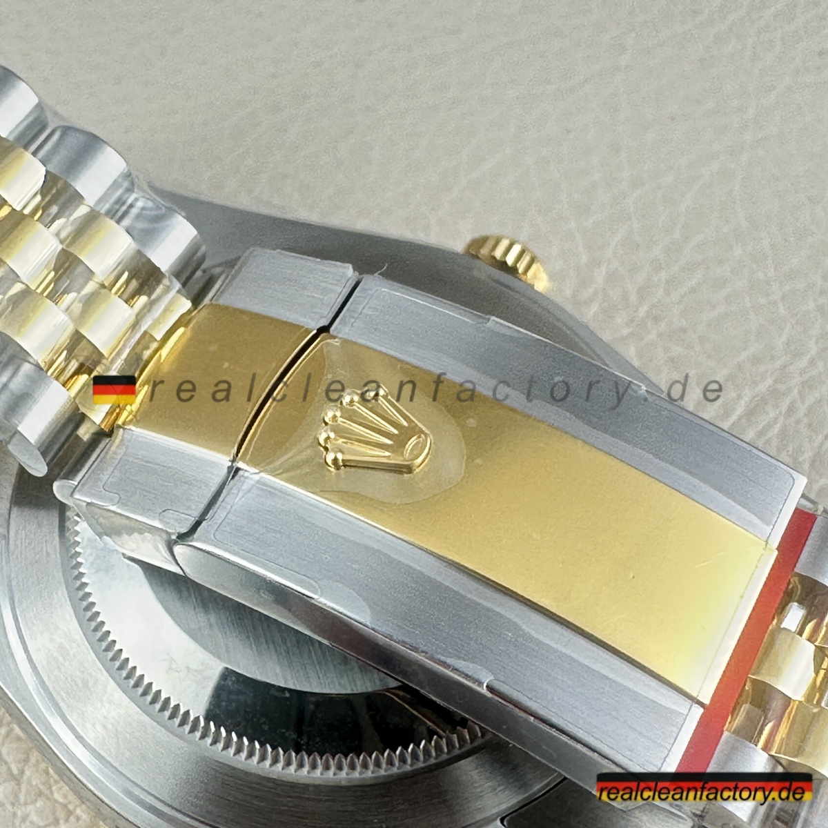 - Das Jubilee-Armband hebt diese Uhr in die Liga echter formeller Luxusikonen. Seine fünfteilige Gliederkonstruktion erfordert höchste Präzision – jedes einzelne Glied muss sich geschmeidig bewegen und den Goldton der Lünette exakt treffen. Die Herausforderung wächst durch das schwarze Zifferblatt, da jede Abweichung in Farbton oder Verarbeitung hier besonders stark auffällt. Clean Factory stellt durch aufwendige Prozesse sicher, dass alle Komponenten – von der Lünette bis zu jedem einzelnen Glied – perfekt zusammenpassen.