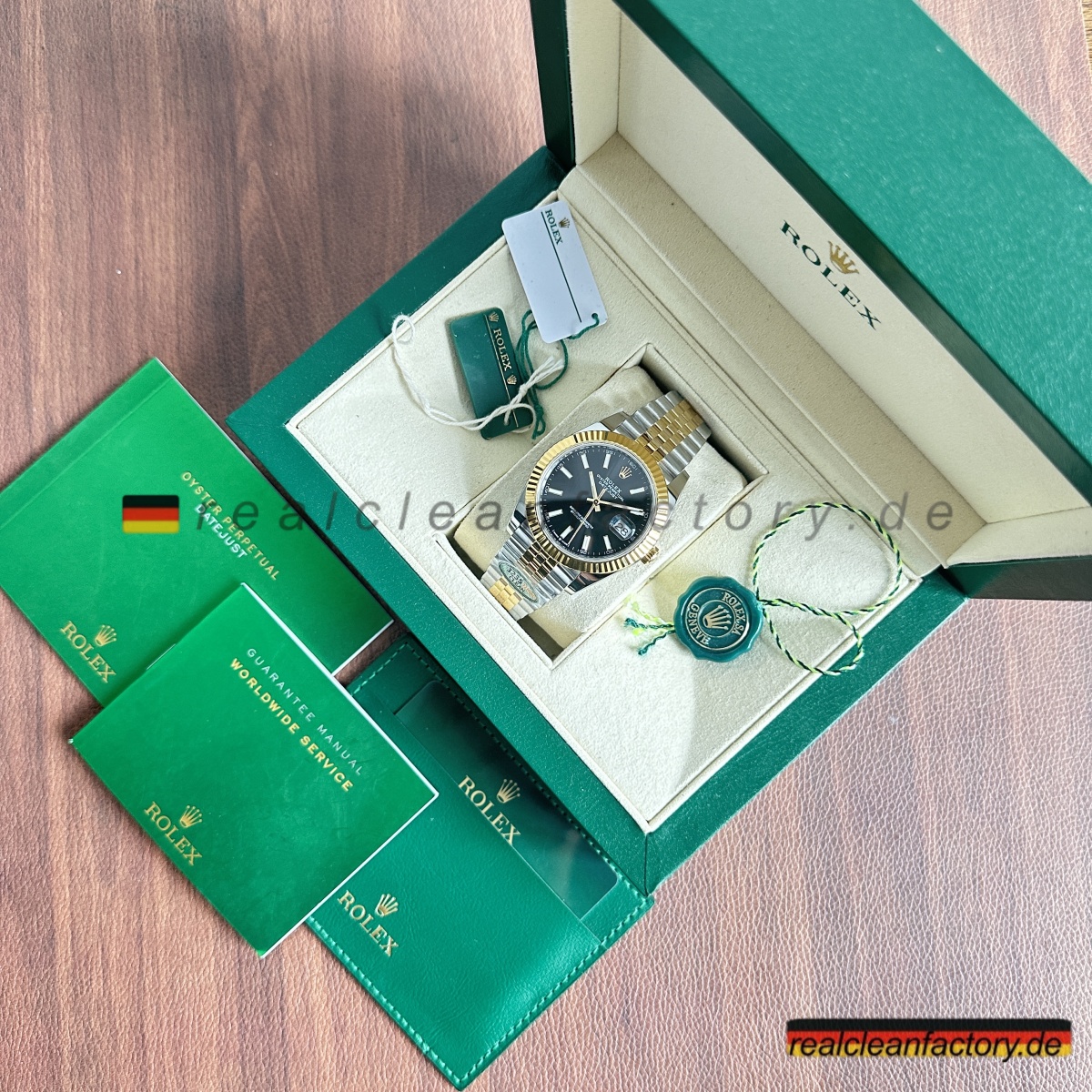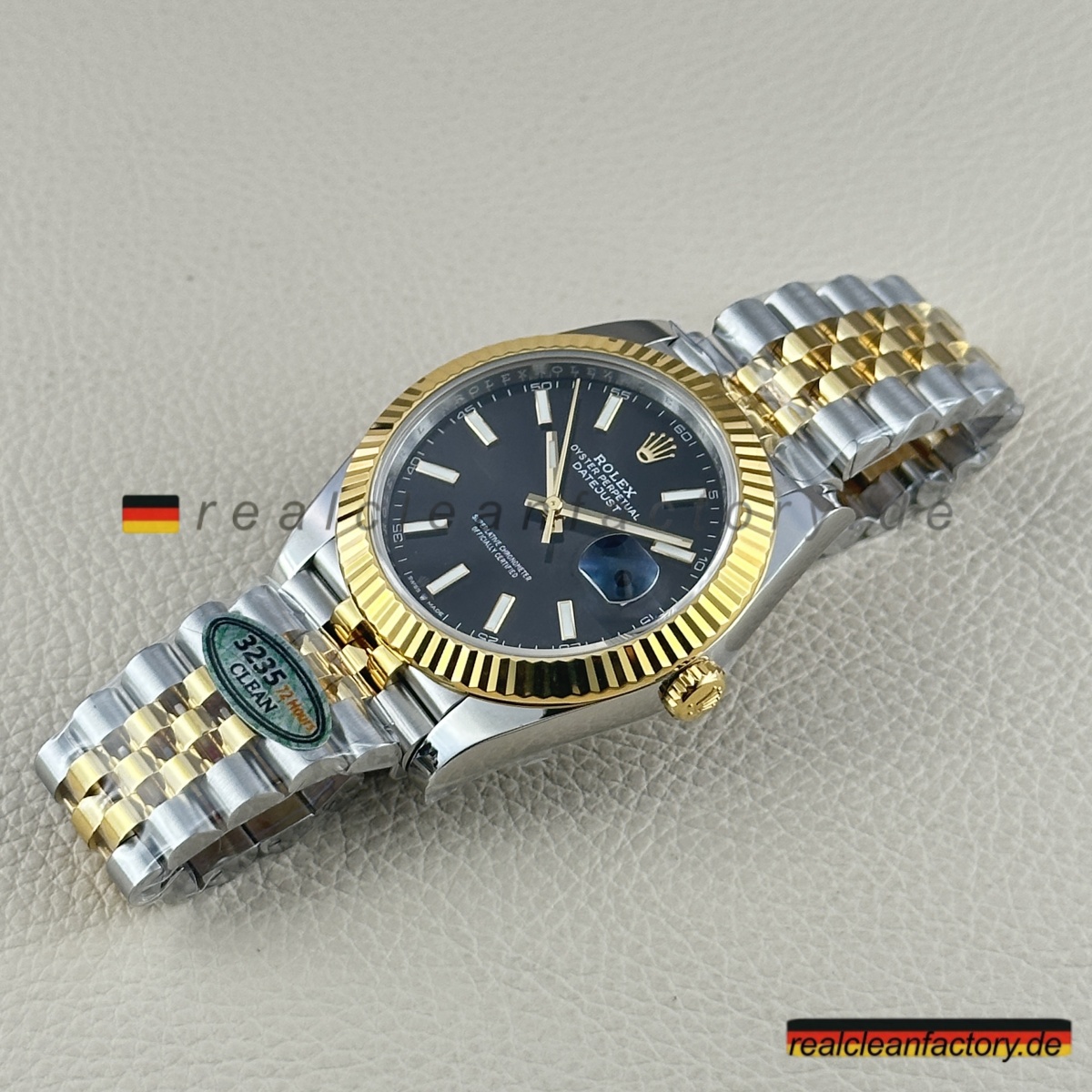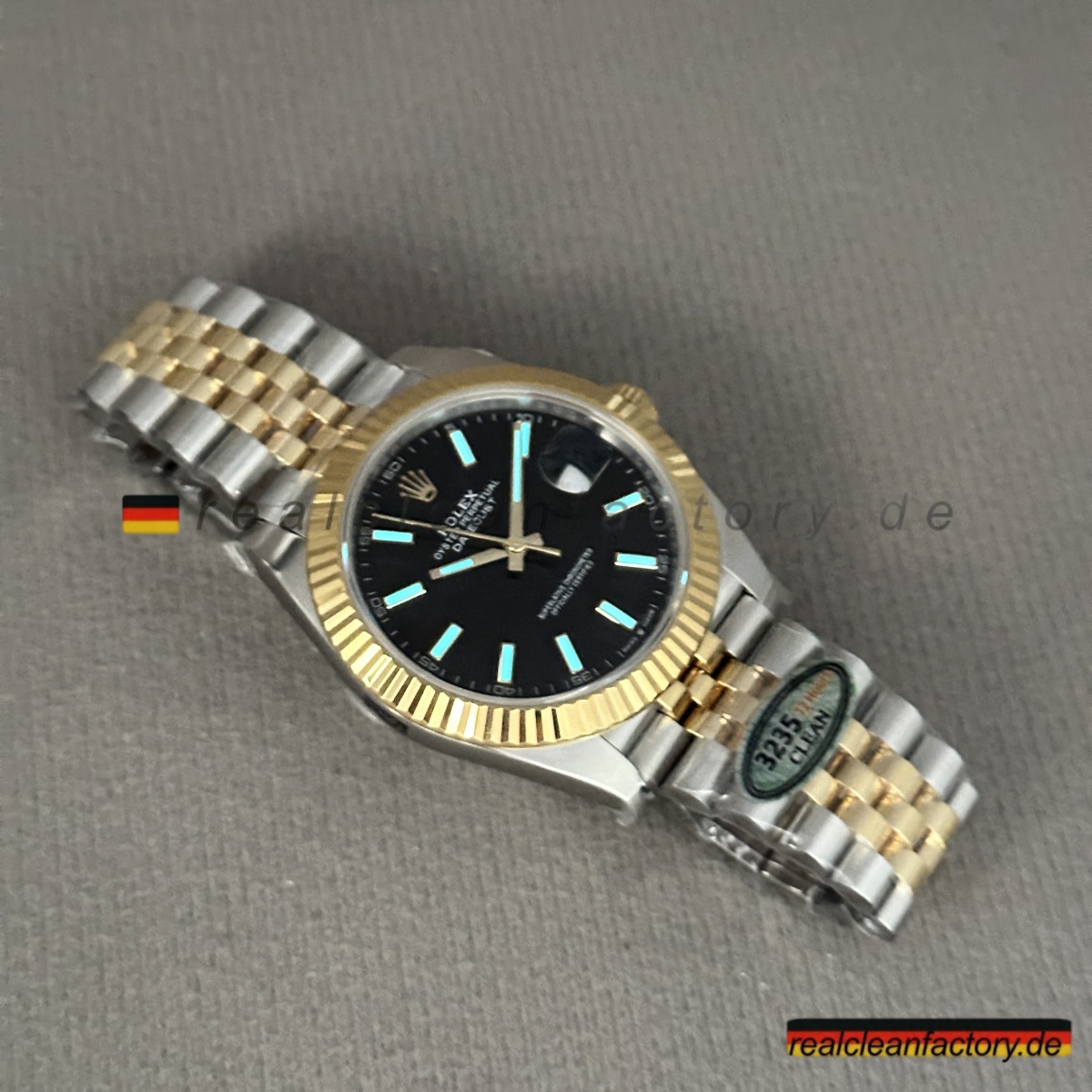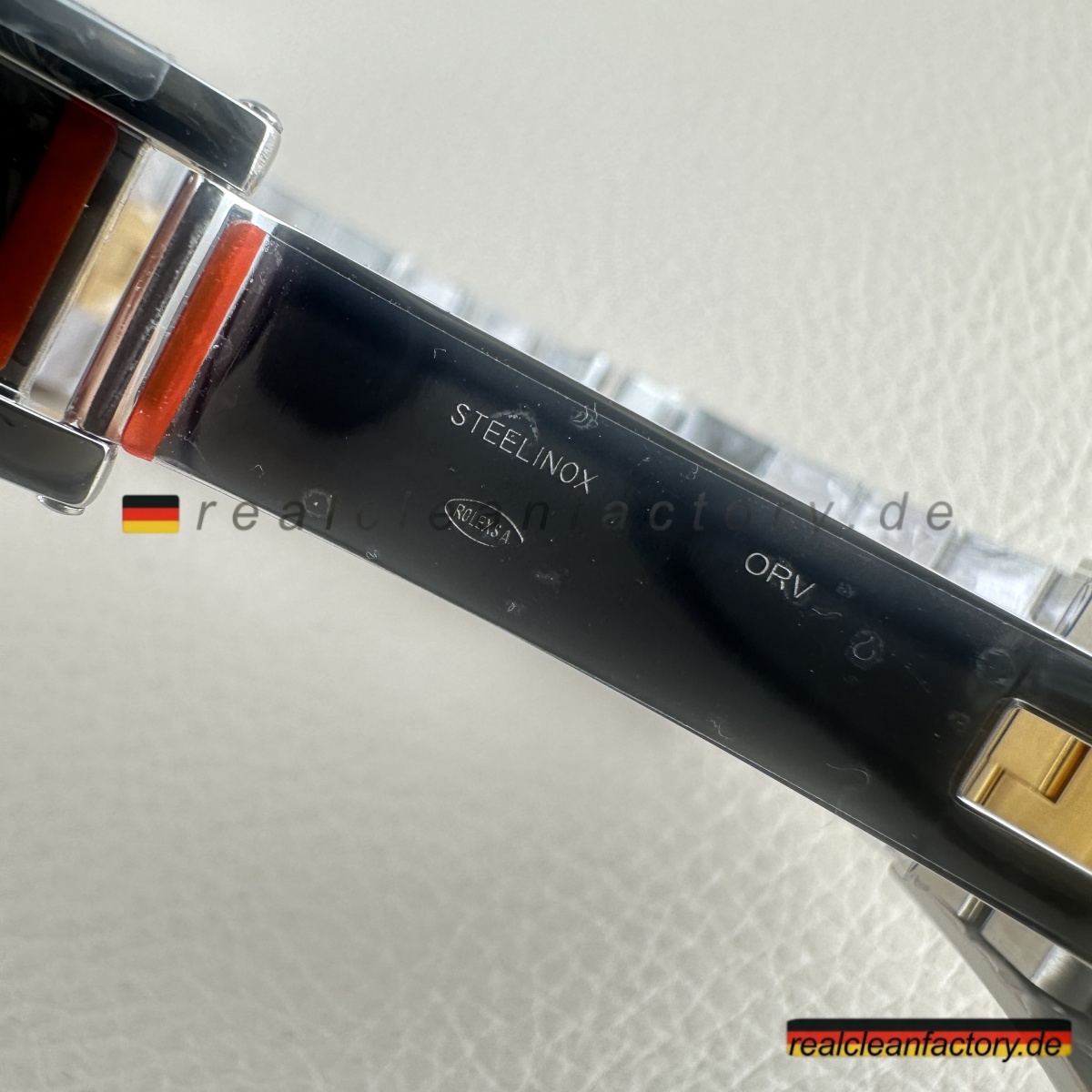- Das Jubilee-Armband hebt diese Uhr in die Liga echter formeller Luxusikonen. Seine fünfteilige Gliederkonstruktion erfordert höchste Präzision – jedes einzelne Glied muss sich geschmeidig bewegen und den Goldton der Lünette exakt treffen. Die Herausforderung wächst durch das schwarze Zifferblatt, da jede Abweichung in Farbton oder Verarbeitung hier besonders stark auffällt. Clean Factory stellt durch aufwendige Prozesse sicher, dass alle Komponenten – von der Lünette bis zu jedem einzelnen Glied – perfekt zusammenpassen.