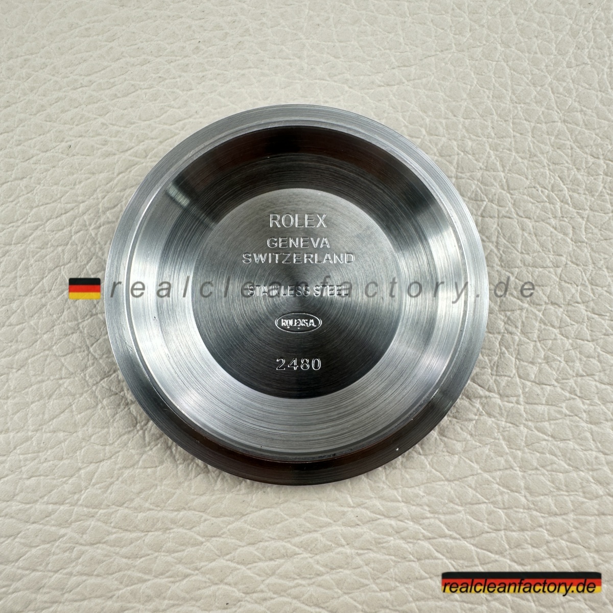 - Das Saphirglas trägt die charakteristische Laserkrone bei 6 Uhr, präzise positioniert und in korrekter Tiefe graviert. Die Zykloplupe bietet echte 2,5-fache Vergrößerung und zentriert das Datum perfekt, sodass es mühelos ablesbar bleibt. Die Datumsziffern entsprechen den originalen Rolex-Spezifikationen in Form, Gewicht und Dichte.