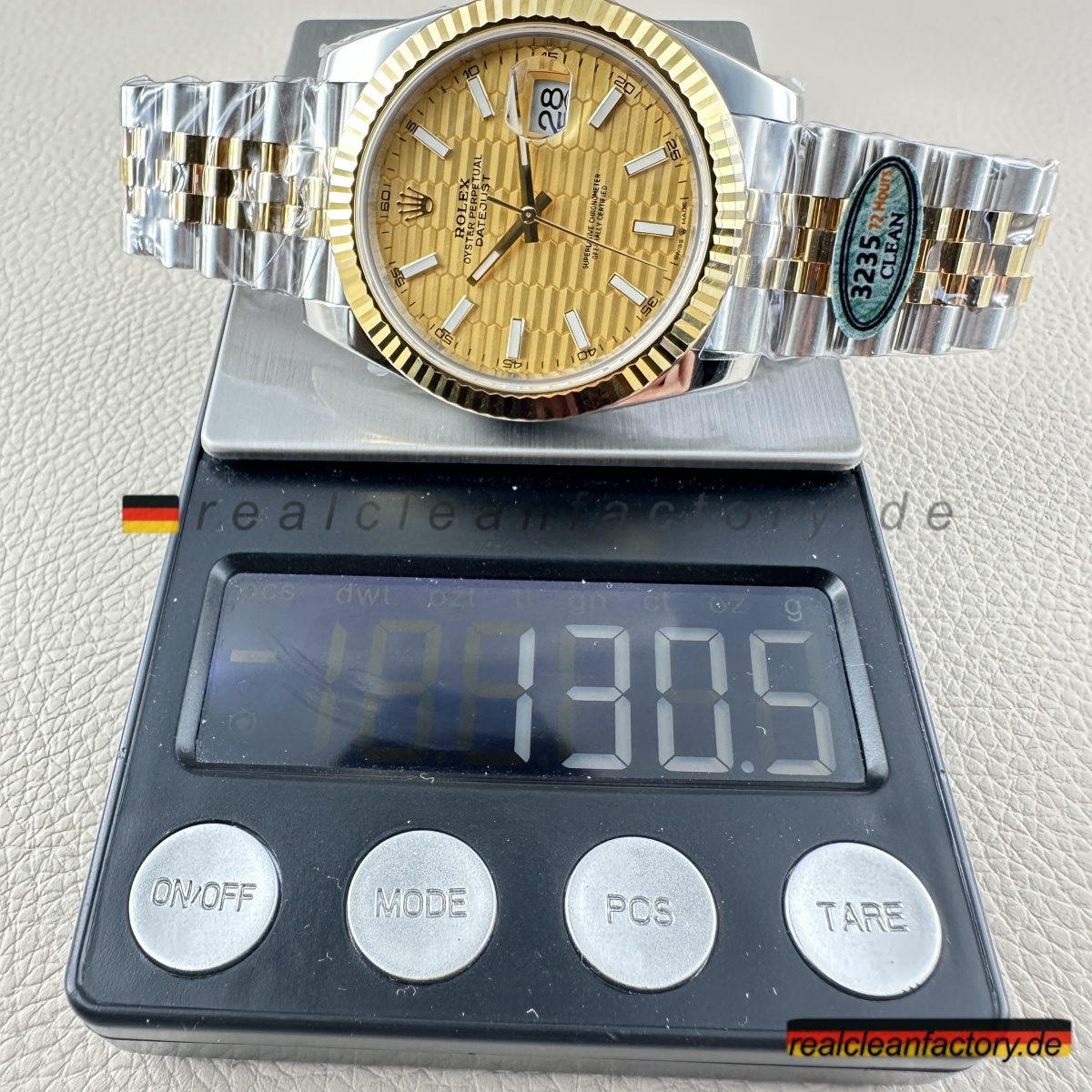 • Im Inneren arbeitet das 3235-Uhrwerk mit der für Clean Factory typischen Präzision. Der Datumswechsel erfolgt punktgenau um Mitternacht, die Krone lässt sich mit spürbarem Schweizer Widerstand bedienen, und die Gangreserve von 70 Stunden sorgt für zuverlässige Genauigkeit. Die Werkarchitektur wurde so angepasst, dass sie trotz des dickeren Zifferblatts stoßfest und stabil bleibt.