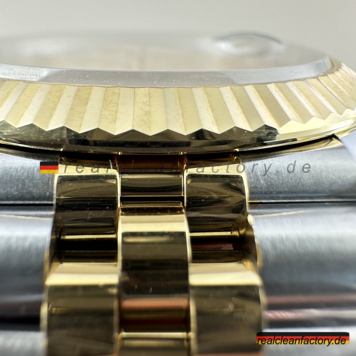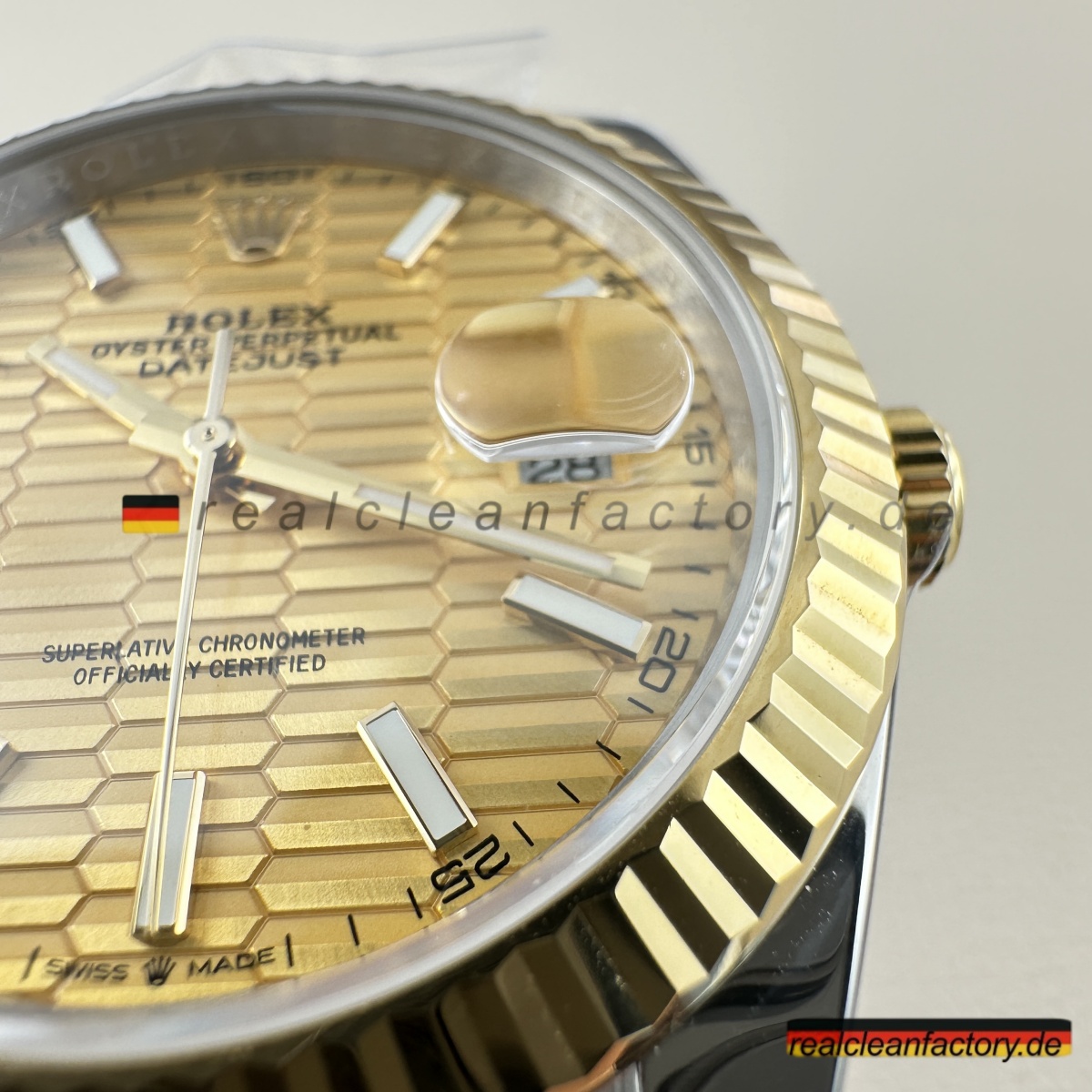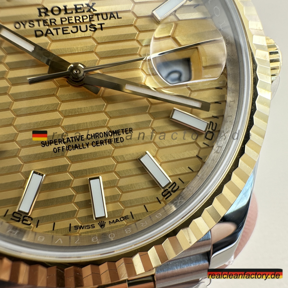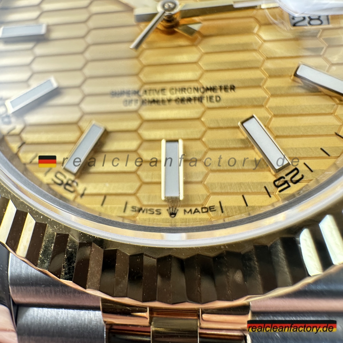 • Clean Factorys Super CLONE Rolex Datejust 126333-0022 schafft perfekte gestalterische Harmonie zwischen der geriffelten Lünette und dem Zifferblatt mit Riffelmotiv – etwas, das zwar einfach klingt, aber erhebliche Fertigungskomplexität erfordert. Ein Riffelmotiv-Zifferblatt zu produzieren, benötigt Präzisionsbearbeitung, die über die Möglichkeiten der meisten Hersteller hinausgeht. Dieses mit einer Gelbgold-Zweiton-Konstruktion und dem Jubilee-Armband zu kombinieren, stellt jede Facette moderner Uhrmacherkunst auf die Probe. Dieses Modell zeigt eindrucksvoll, wie Clean Factory es schafft, filigrane Elemente zu einem harmonischen Gesamtbild zu vereinen, ohne dass sie visuell konkurrieren.