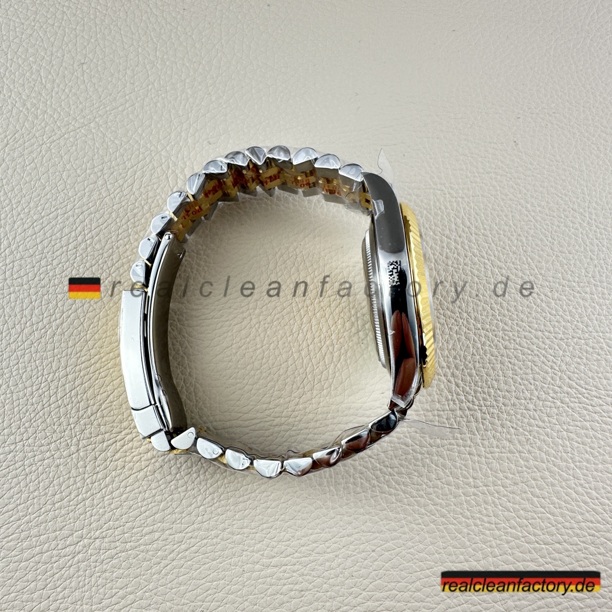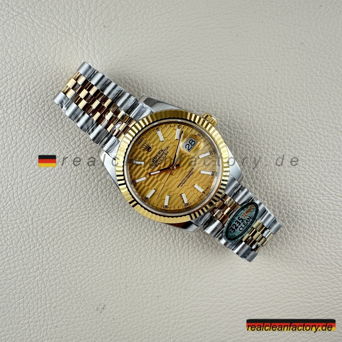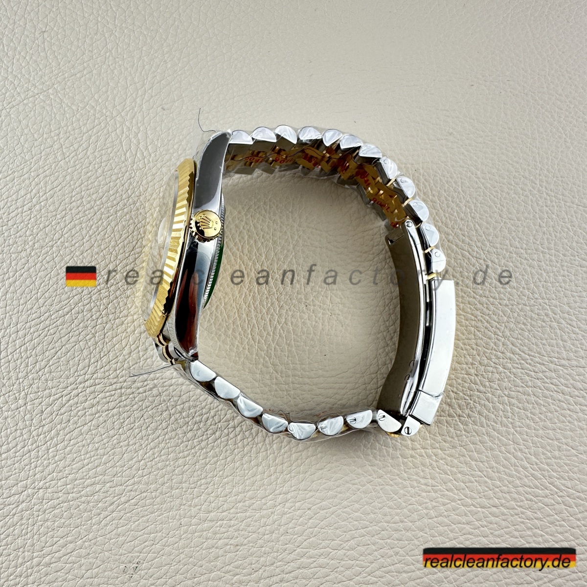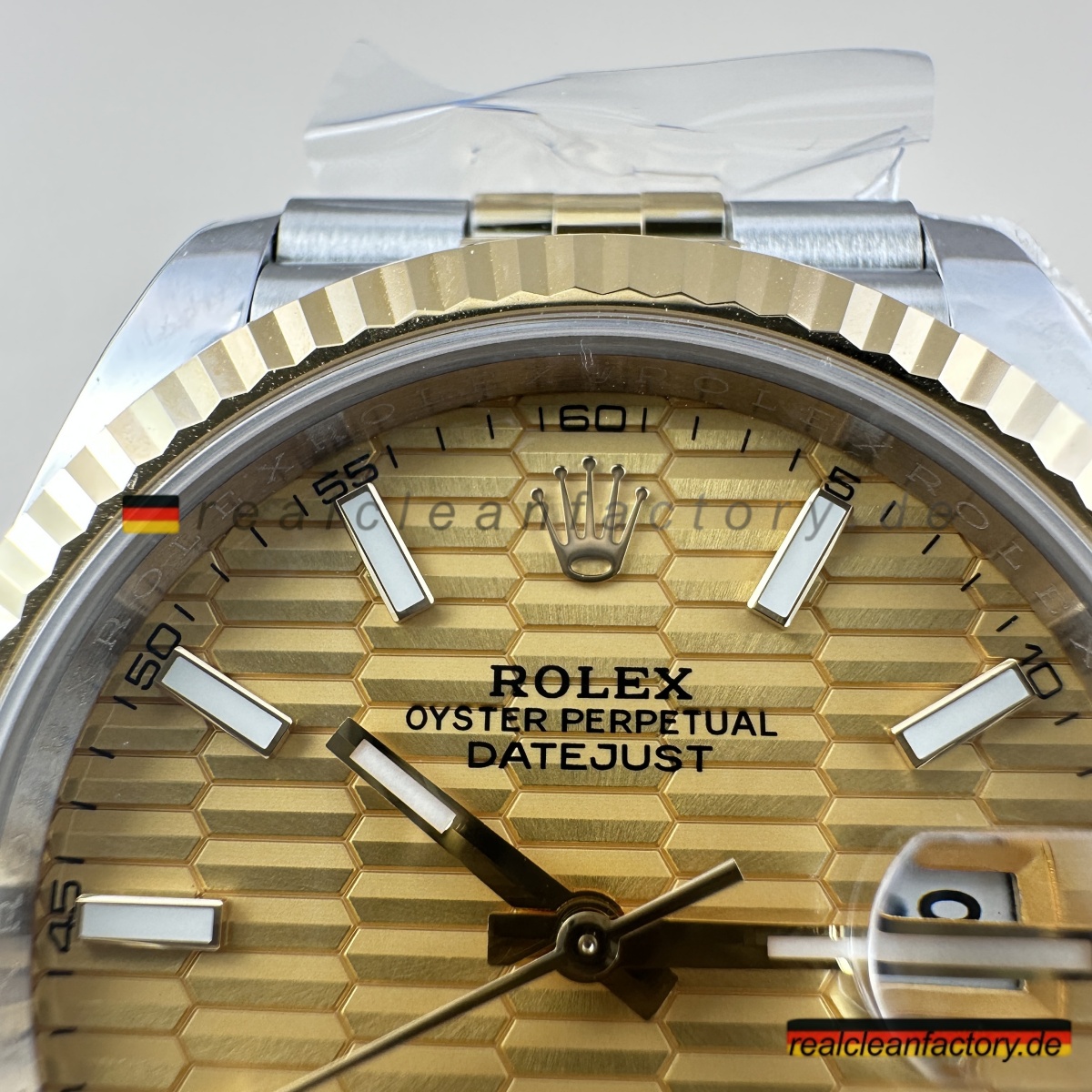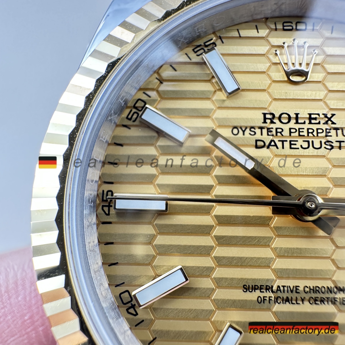 • Clean Factorys Super CLONE Rolex Datejust 126333-0022 schafft perfekte gestalterische Harmonie zwischen der geriffelten Lünette und dem Zifferblatt mit Riffelmotiv – etwas, das zwar einfach klingt, aber erhebliche Fertigungskomplexität erfordert. Ein Riffelmotiv-Zifferblatt zu produzieren, benötigt Präzisionsbearbeitung, die über die Möglichkeiten der meisten Hersteller hinausgeht. Dieses mit einer Gelbgold-Zweiton-Konstruktion und dem Jubilee-Armband zu kombinieren, stellt jede Facette moderner Uhrmacherkunst auf die Probe. Dieses Modell zeigt eindrucksvoll, wie Clean Factory es schafft, filigrane Elemente zu einem harmonischen Gesamtbild zu vereinen, ohne dass sie visuell konkurrieren.