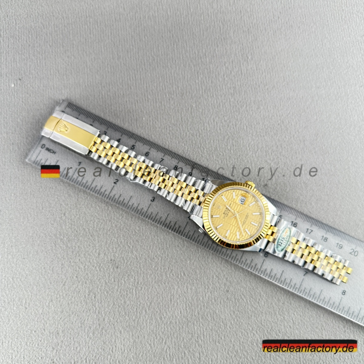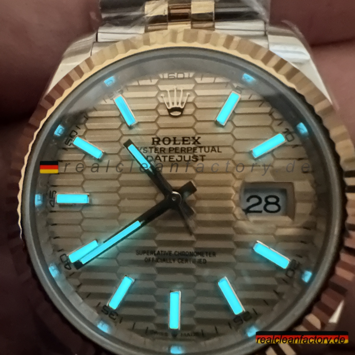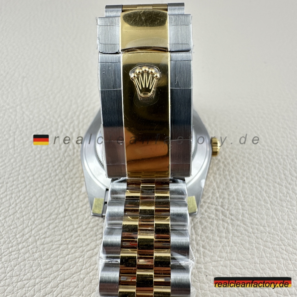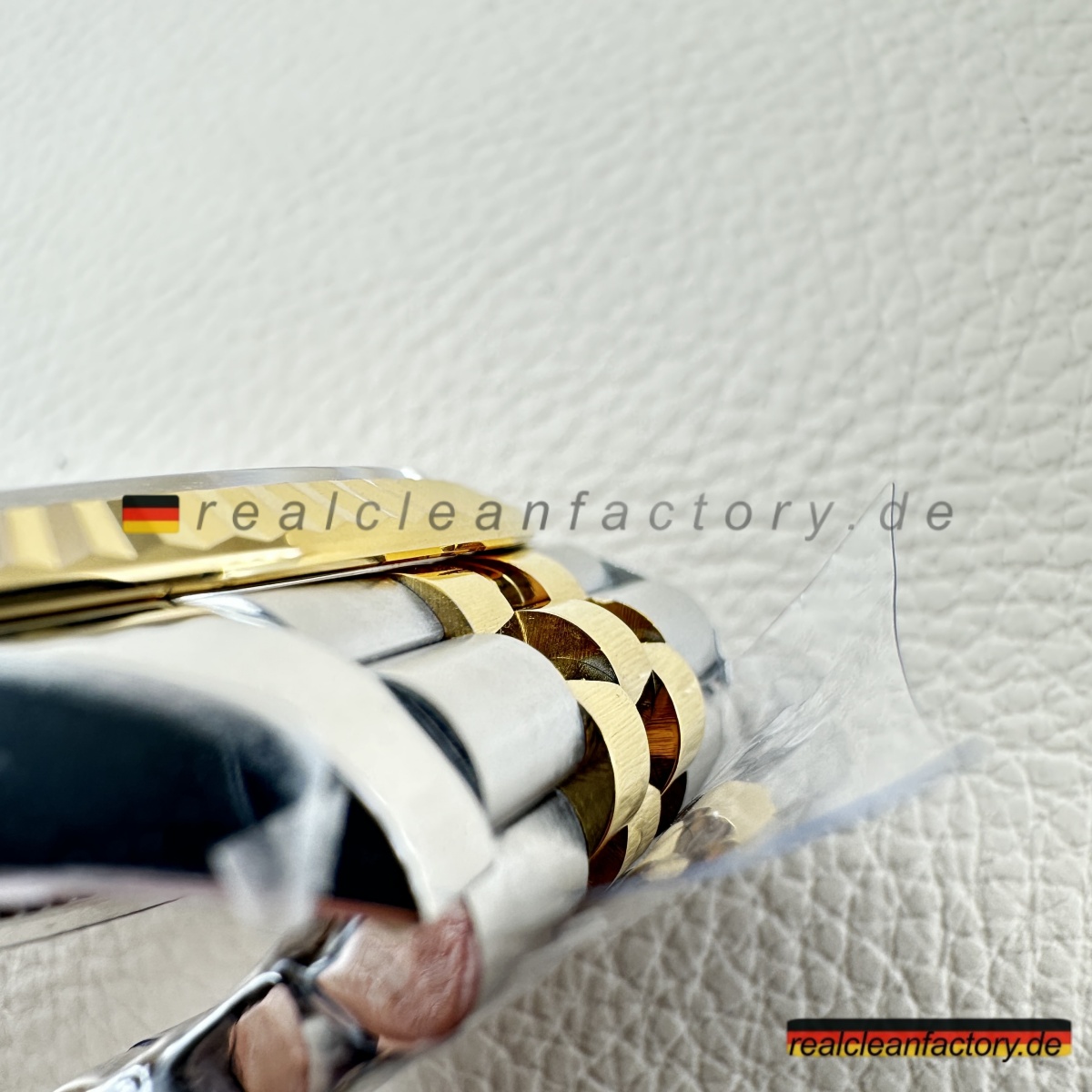 • Clean Factorys Super CLONE Rolex Datejust 126333-0022 schafft perfekte gestalterische Harmonie zwischen der geriffelten Lünette und dem Zifferblatt mit Riffelmotiv – etwas, das zwar einfach klingt, aber erhebliche Fertigungskomplexität erfordert. Ein Riffelmotiv-Zifferblatt zu produzieren, benötigt Präzisionsbearbeitung, die über die Möglichkeiten der meisten Hersteller hinausgeht. Dieses mit einer Gelbgold-Zweiton-Konstruktion und dem Jubilee-Armband zu kombinieren, stellt jede Facette moderner Uhrmacherkunst auf die Probe. Dieses Modell zeigt eindrucksvoll, wie Clean Factory es schafft, filigrane Elemente zu einem harmonischen Gesamtbild zu vereinen, ohne dass sie visuell konkurrieren.