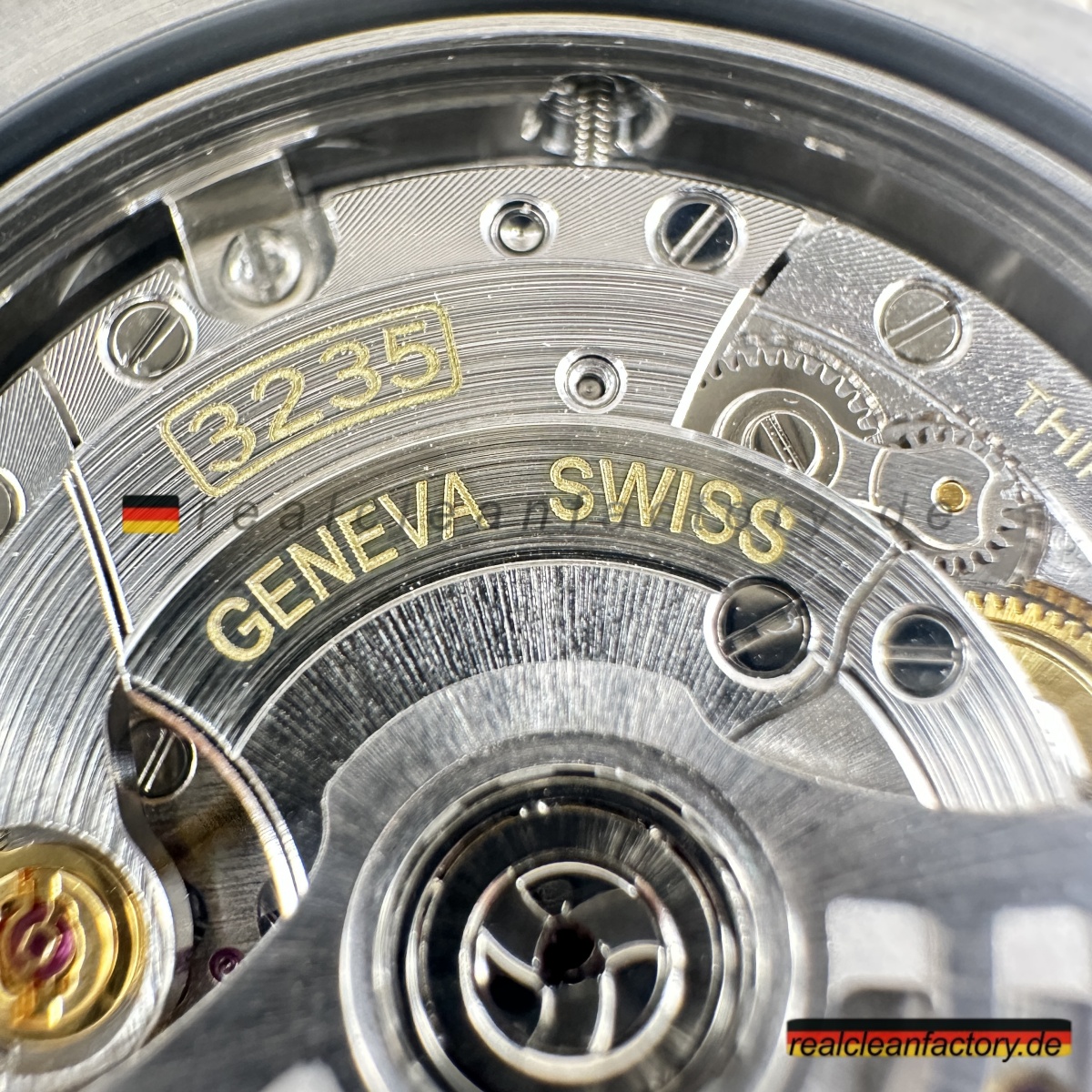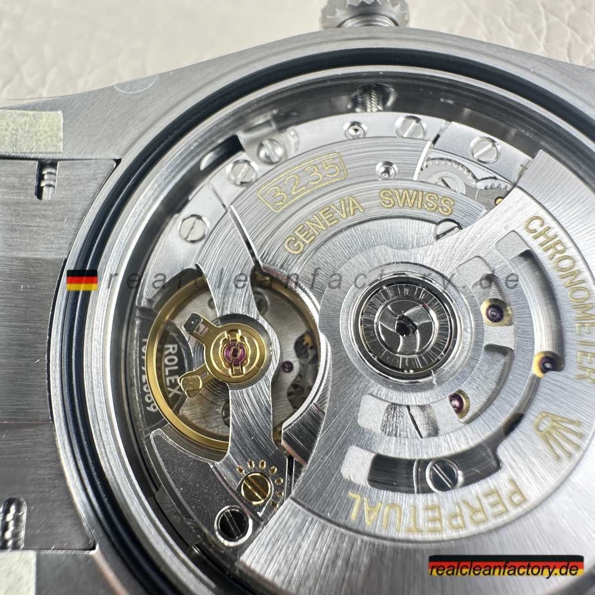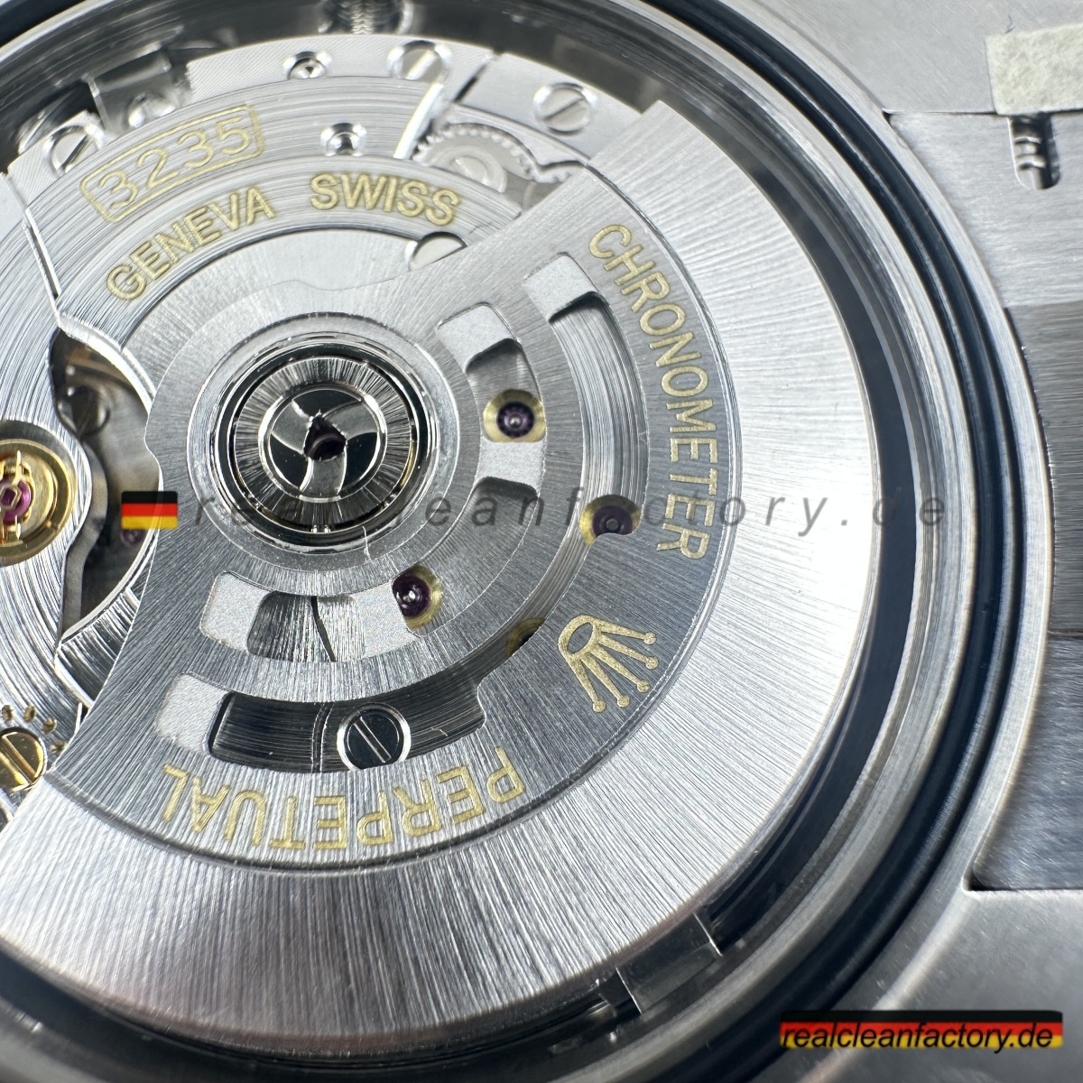 - Im Inneren arbeitet das Super Clone 3235 Uhrwerk, das für seine Zuverlässigkeit bekannt ist. Es bietet eine Gangreserve von 70 Stunden, einen präzisen Datumswechsel um Mitternacht und ein geschmeidiges Aufzugsgefühl. Die Krone funktioniert mit dem charakteristischen Widerstand, der hochwertige Mechanik sofort erkennbar macht.