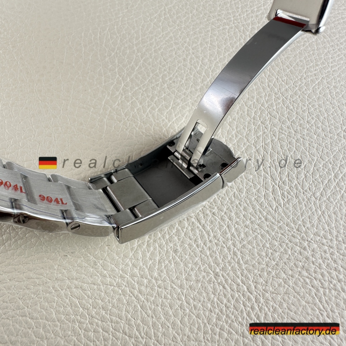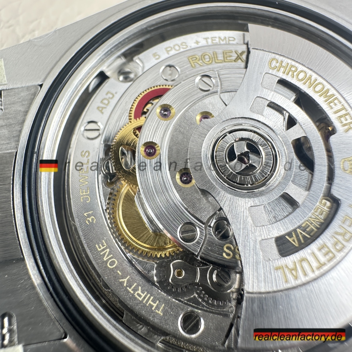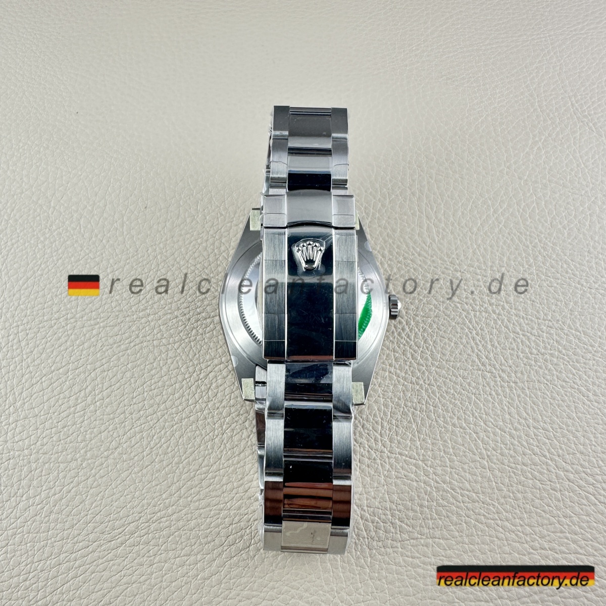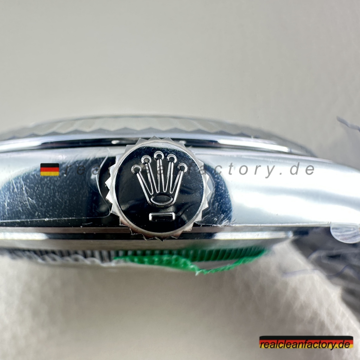 - Im Inneren arbeitet das Super Clone 3235 Uhrwerk, das für seine Zuverlässigkeit bekannt ist. Es bietet eine Gangreserve von 70 Stunden, einen präzisen Datumswechsel um Mitternacht und ein geschmeidiges Aufzugsgefühl. Die Krone funktioniert mit dem charakteristischen Widerstand, der hochwertige Mechanik sofort erkennbar macht.