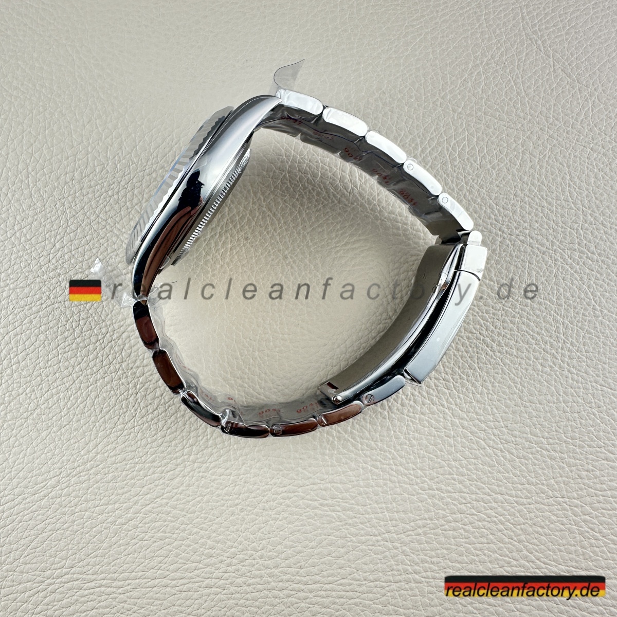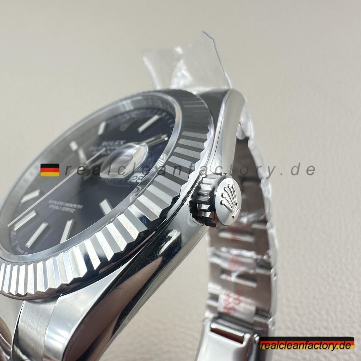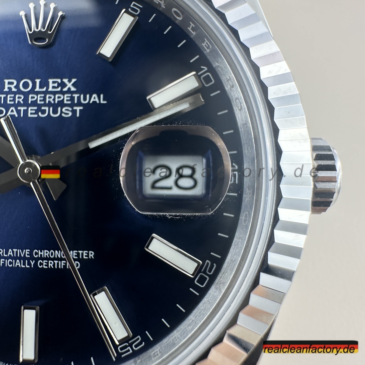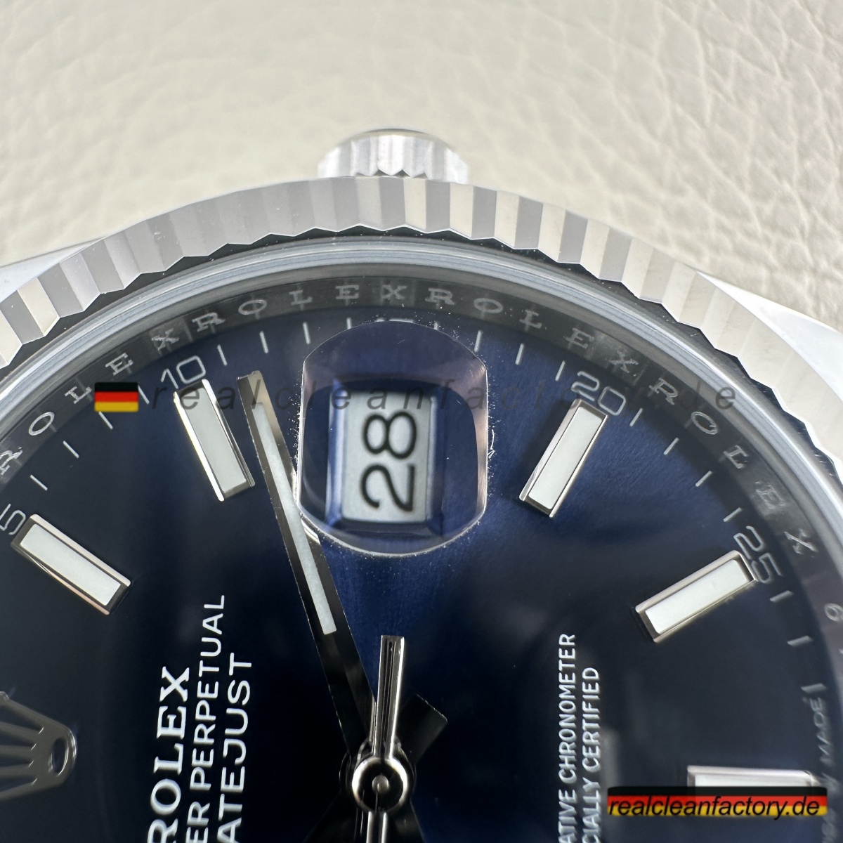 - Clean Factorys Super Clone Rolex Datejust 126334-0001 vereint ein weißgoldenes Riffel-Lünettenprofil mit einem blauen Sunburst-Zifferblatt und schafft so eine Optik, die modern, edel und angenehm unaufdringlich wirkt. Auch wenn diese Kombination schlicht erscheinen mag, erfordert sie höchste Präzision in der Fertigung: Weißgold ist härter zu bearbeiten als andere Edelmetalle, und jeder kleinste Fehler fällt sofort vor dem klaren blauen Hintergrund auf.