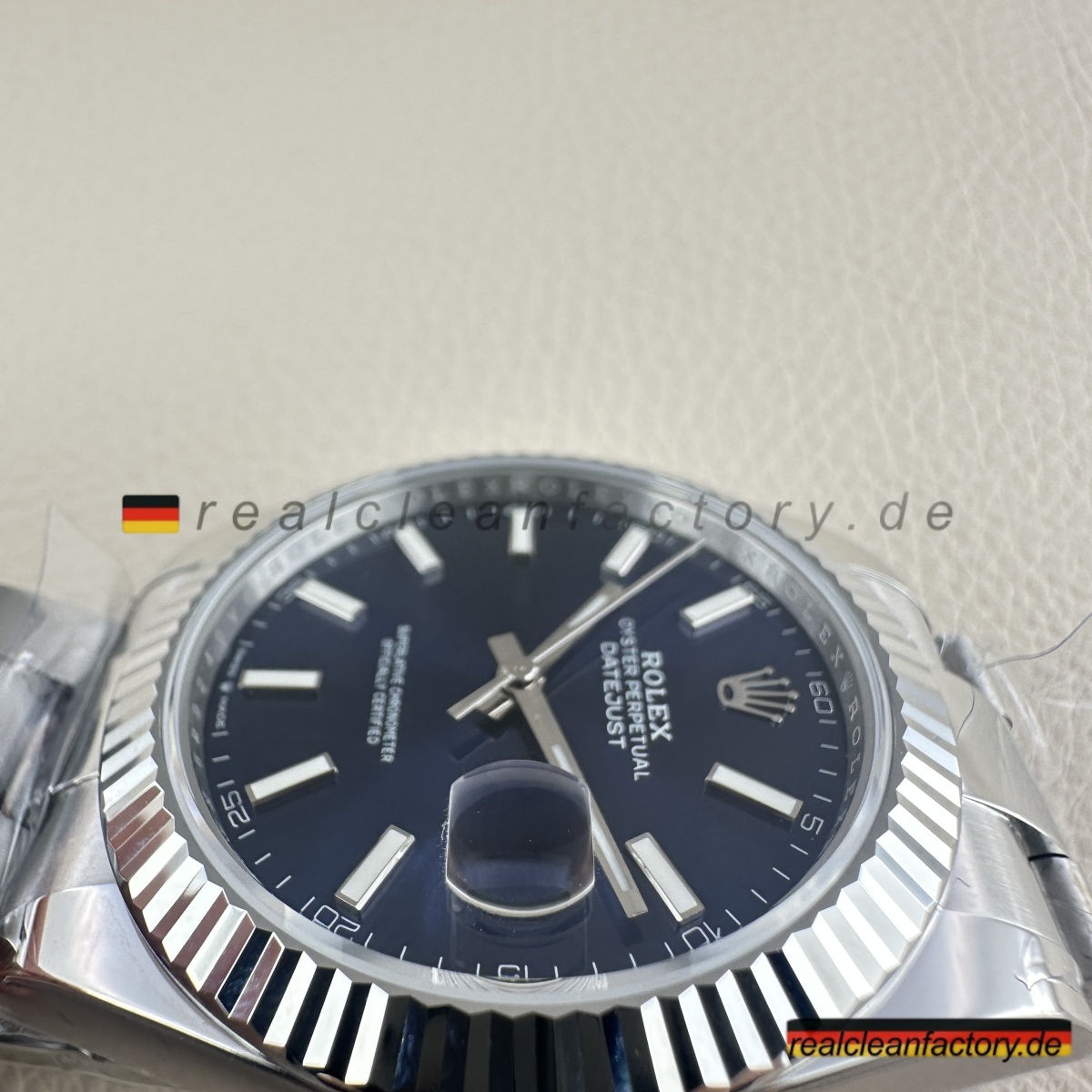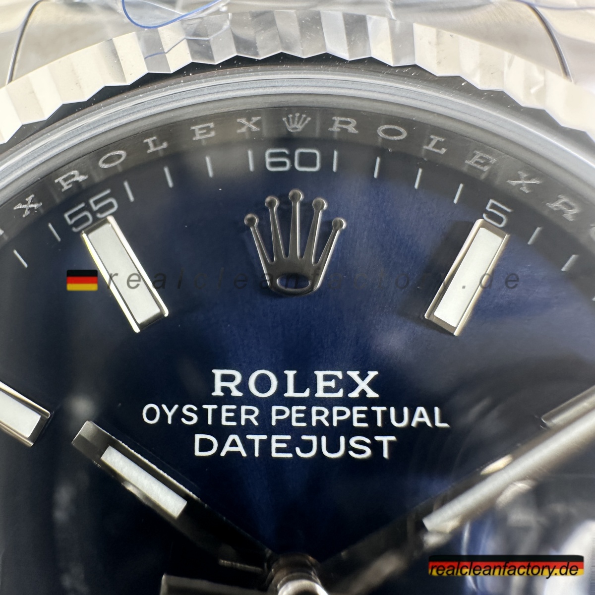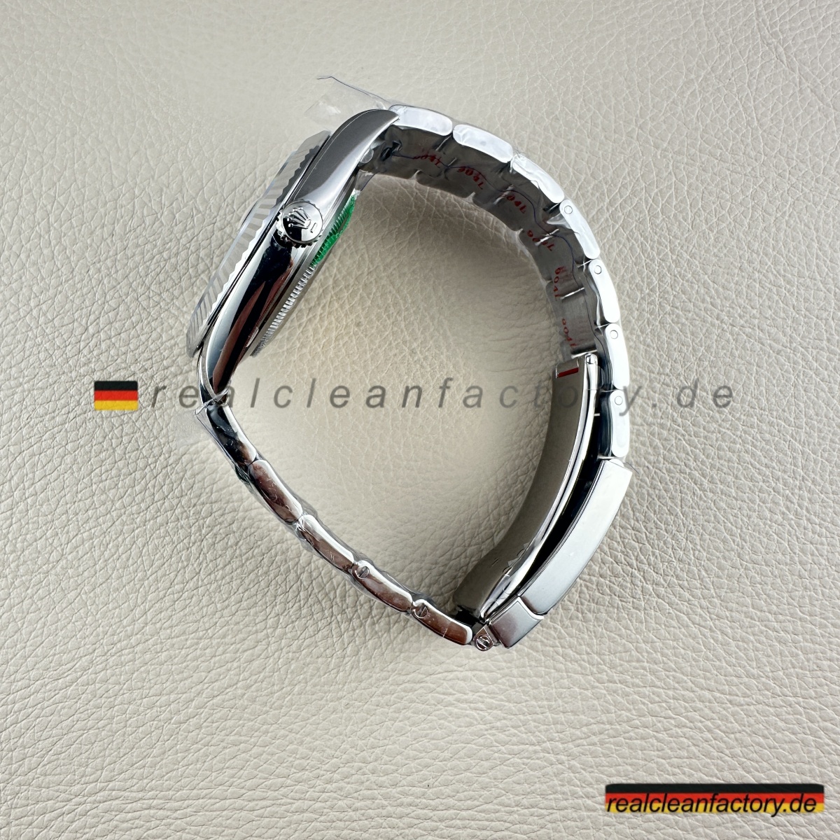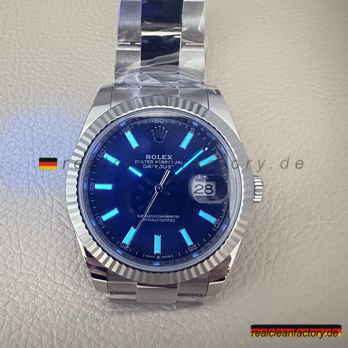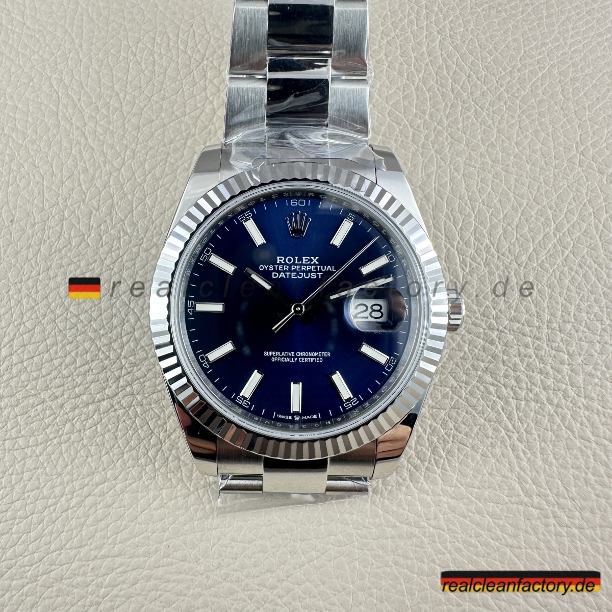 - Clean Factorys Super Clone Rolex Datejust 126334-0001 vereint ein weißgoldenes Riffel-Lünettenprofil mit einem blauen Sunburst-Zifferblatt und schafft so eine Optik, die modern, edel und angenehm unaufdringlich wirkt. Auch wenn diese Kombination schlicht erscheinen mag, erfordert sie höchste Präzision in der Fertigung: Weißgold ist härter zu bearbeiten als andere Edelmetalle, und jeder kleinste Fehler fällt sofort vor dem klaren blauen Hintergrund auf.