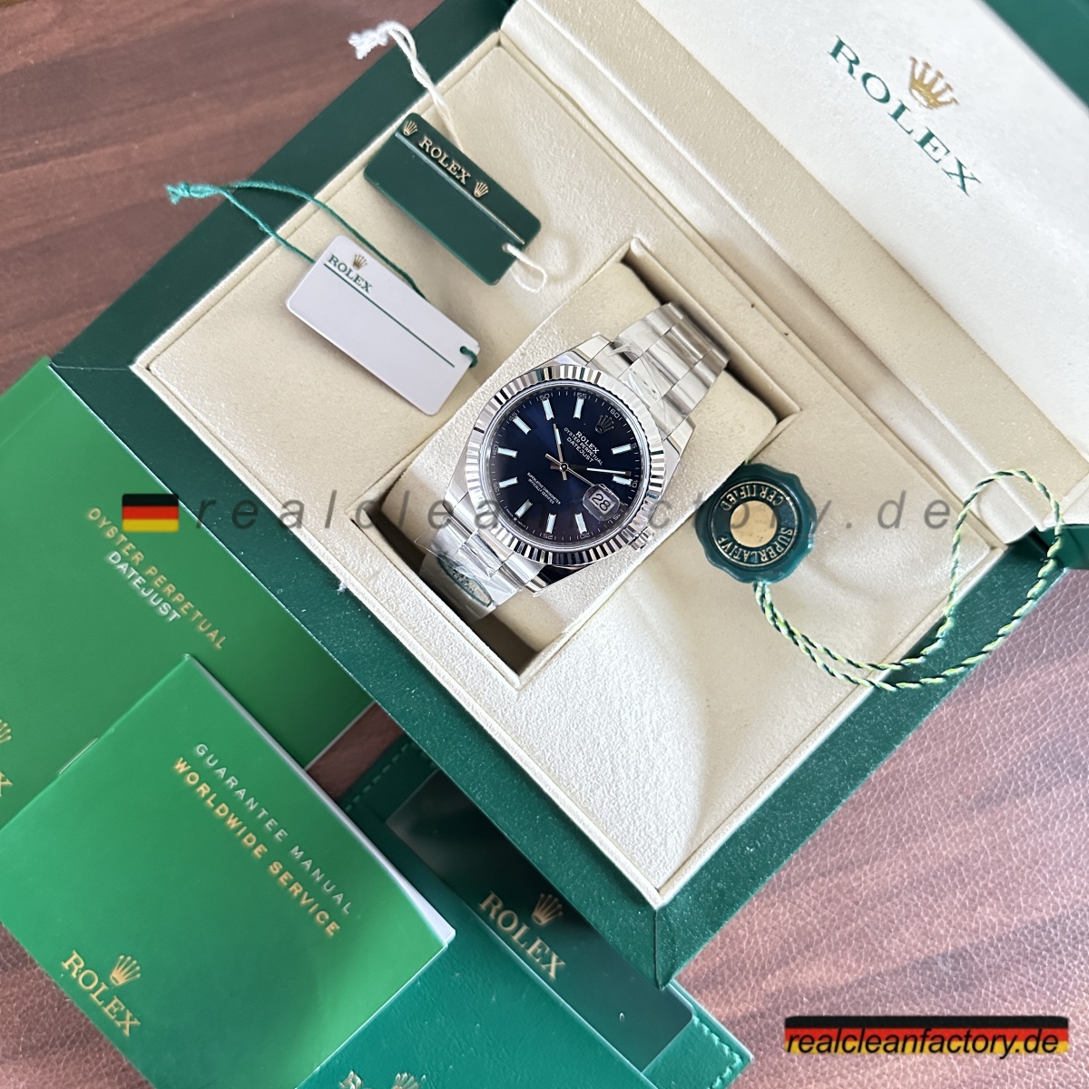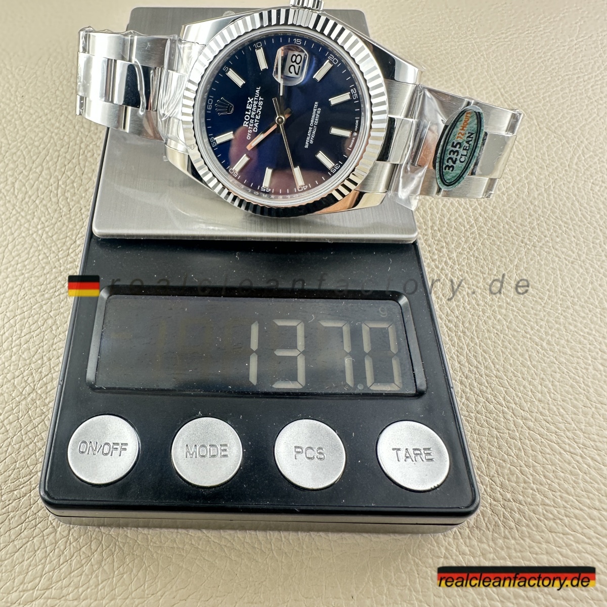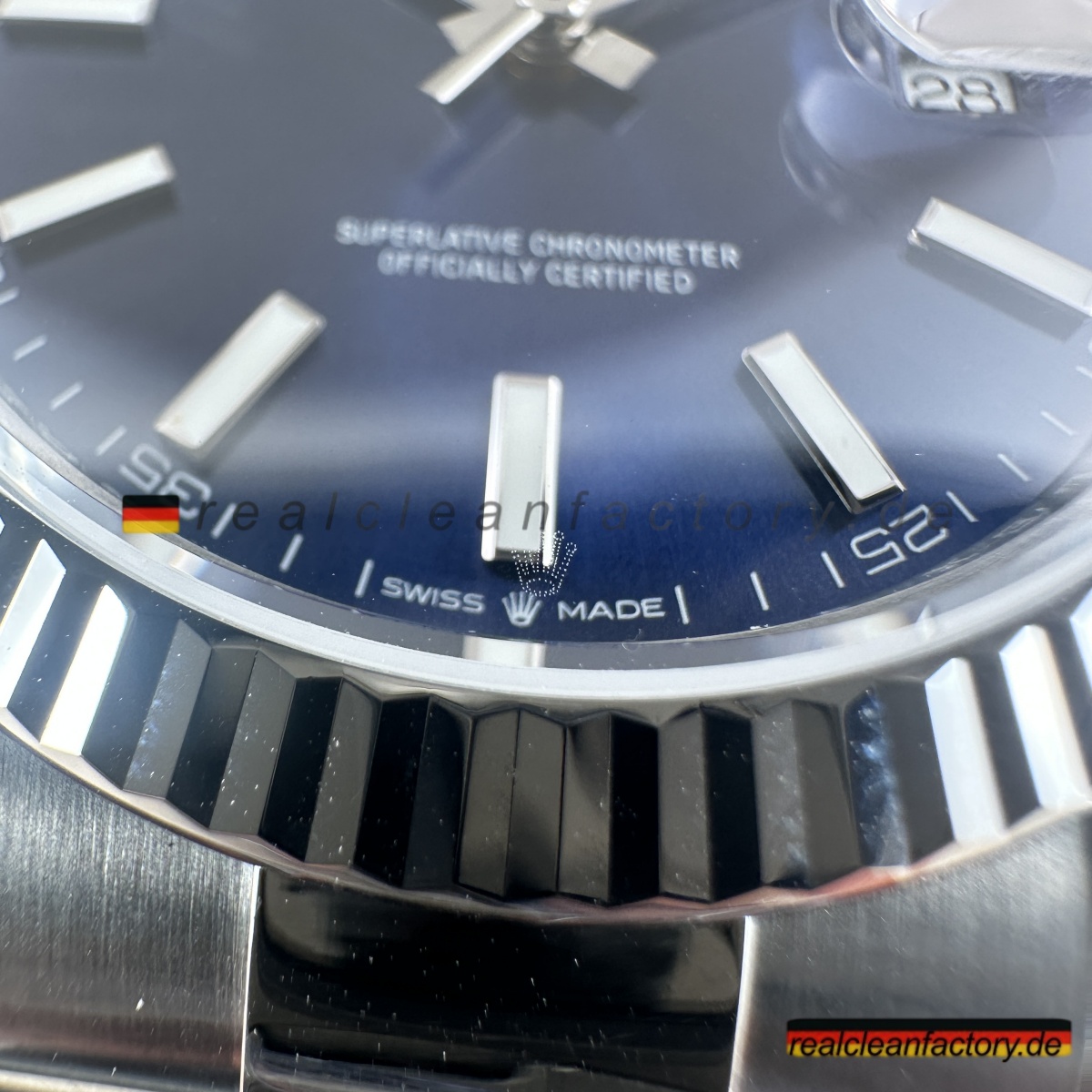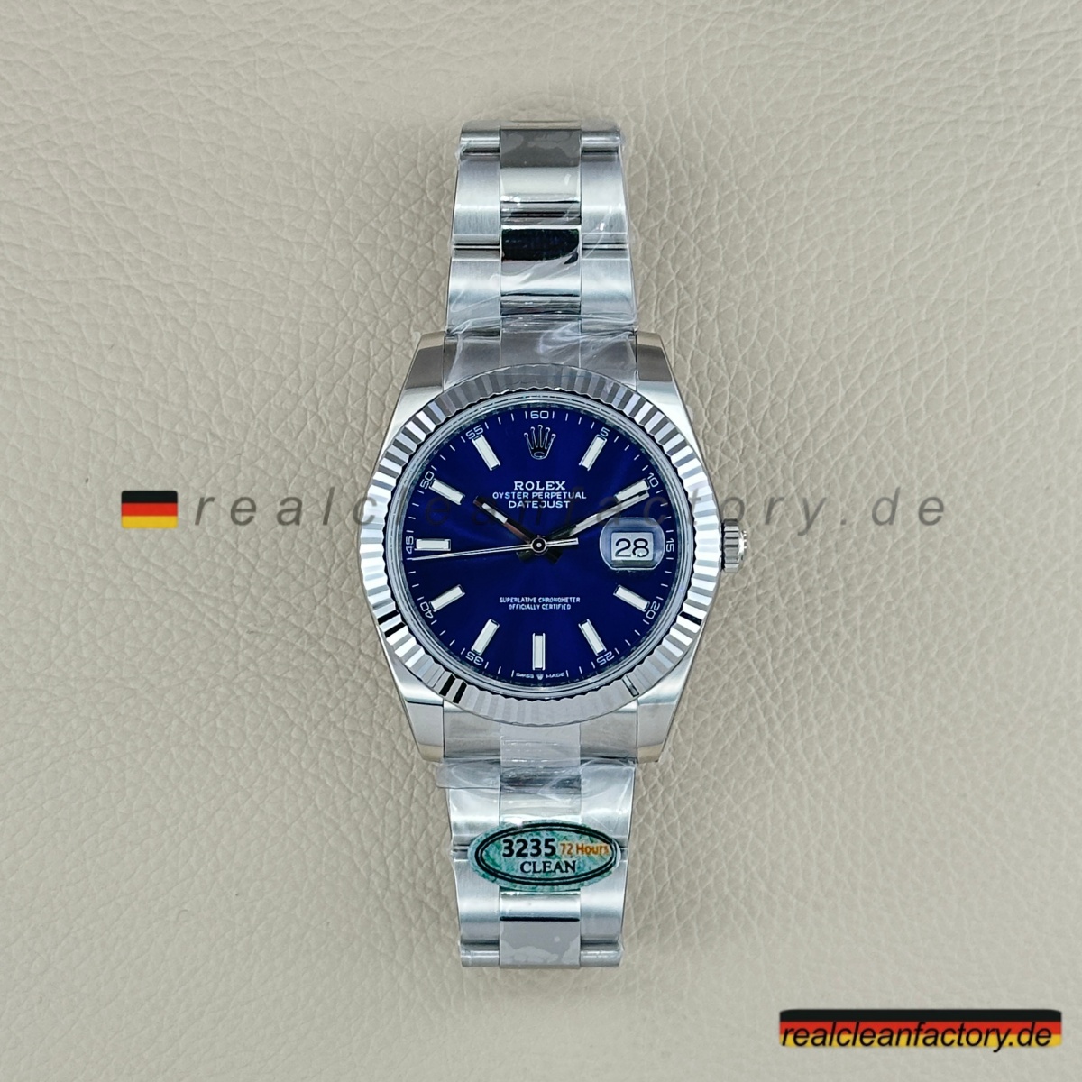 - Clean Factorys Super Clone Rolex Datejust 126334-0001 vereint ein weißgoldenes Riffel-Lünettenprofil mit einem blauen Sunburst-Zifferblatt und schafft so eine Optik, die modern, edel und angenehm unaufdringlich wirkt. Auch wenn diese Kombination schlicht erscheinen mag, erfordert sie höchste Präzision in der Fertigung: Weißgold ist härter zu bearbeiten als andere Edelmetalle, und jeder kleinste Fehler fällt sofort vor dem klaren blauen Hintergrund auf.
