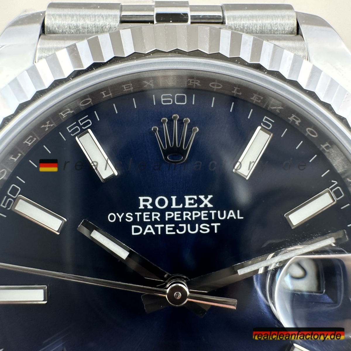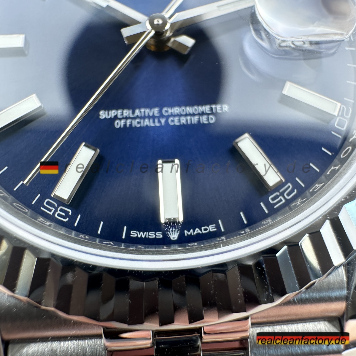 - Das blaue Sunburst-Zifferblatt gewinnt durch das Jubilee-Armband noch mehr Charakter. Clean Factorys Veredelung erzielt genau die Tiefe und Lebendigkeit, die im Licht dezent wechseln, während die formale Optik des Armbands die Raffinesse der Uhr unterstreicht. Die kühle Farbpalette – blaues Zifferblatt und Weißgold-Lünette – harmoniert perfekt mit den polierten und gebürsteten Flächen des Jubilee. Im Bürolicht entsteht ein ruhiger, professioneller Eindruck; im Tageslicht entfaltet das Blau seine volle Leuchtkraft, eingerahmt von der luxuriösen Kombination aus Weißgold und Jubilee.