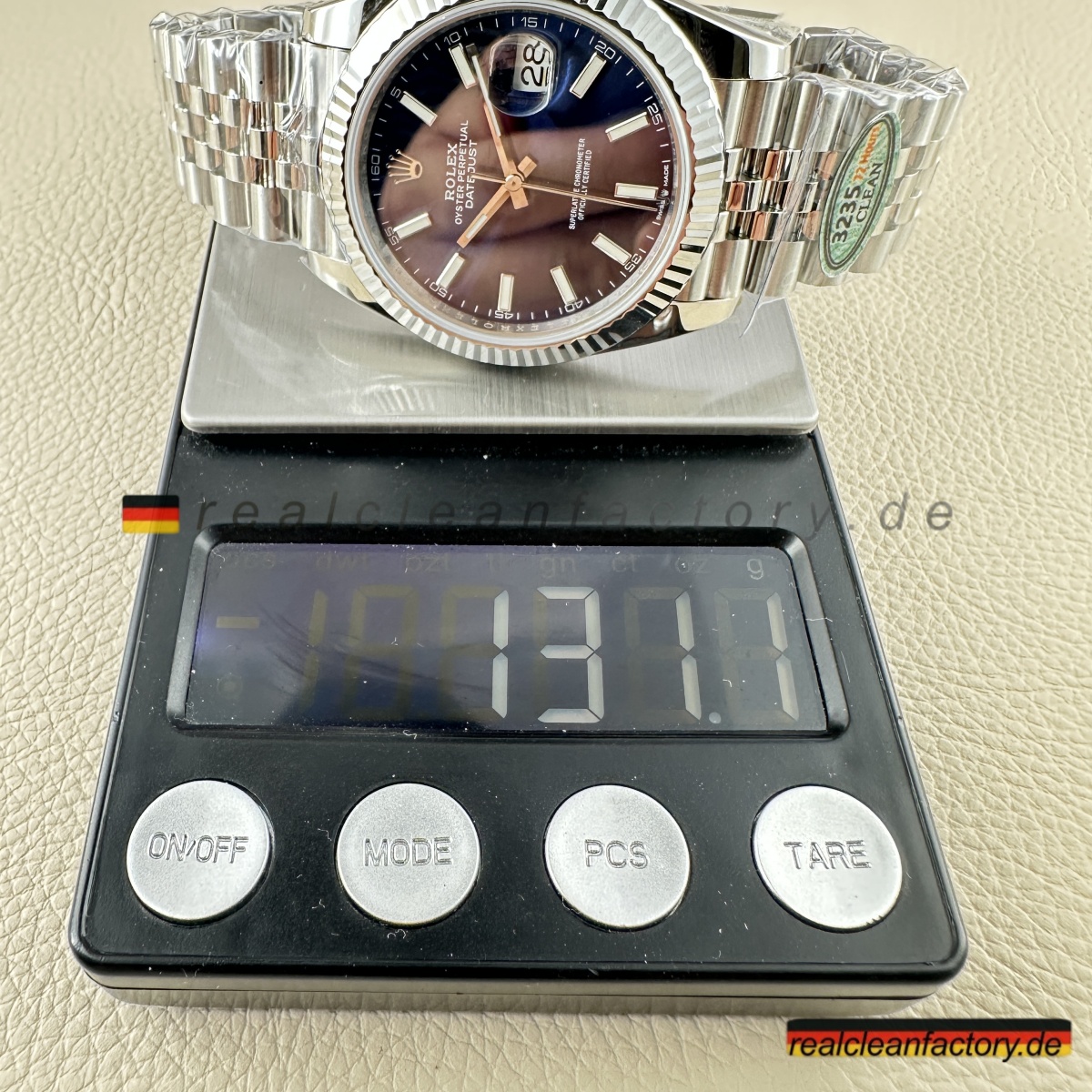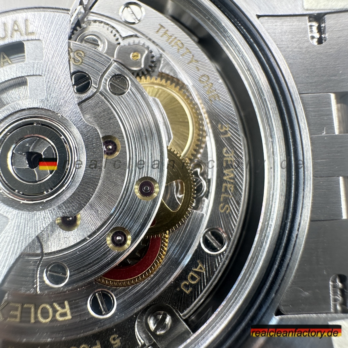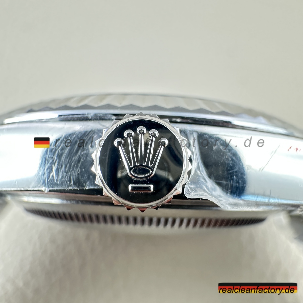 - Das Saphirglas bietet eine perfekt ausgerichtete Zykloplupe mit 2,5-facher Vergrößerung. Die Datumsziffern entsprechen in Form und Proportion genau den Rolex-Vorgaben. Die Laserkrone bei 6 Uhr ist präzise positioniert und in originalgetreuer Tiefe ausgeführt.