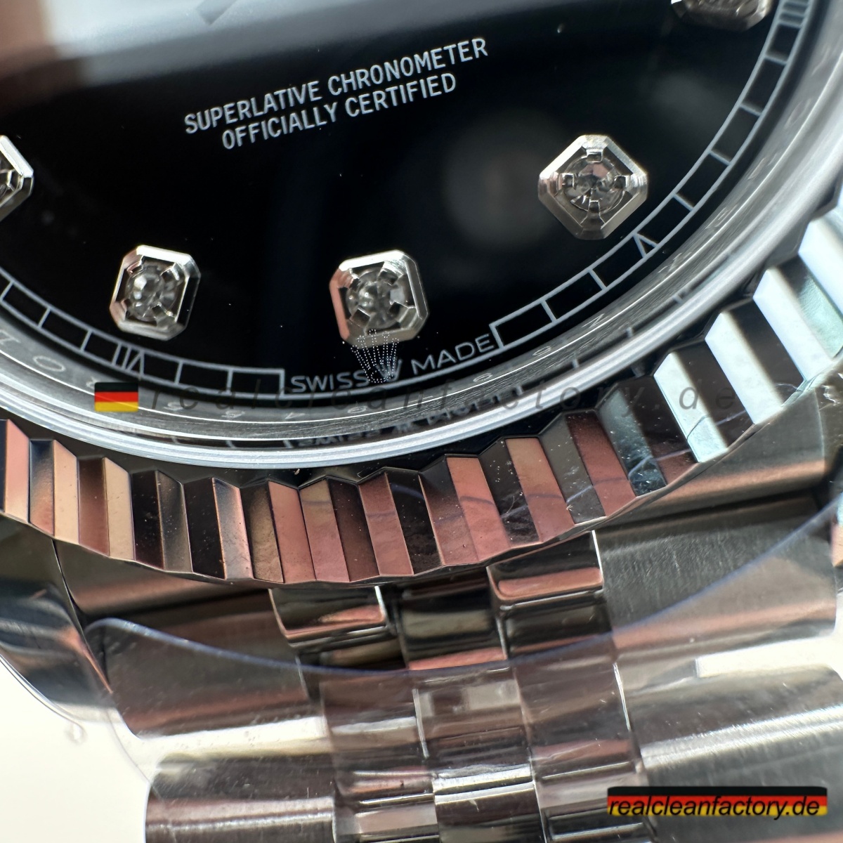 • Schwarze Zifferblätter lassen Diamanten besonders brillant wirken, da der dunkle Hintergrund jede Ablenkung eliminiert und das Feuer der Steine maximal zur Geltung bringt. Diese Ausführung perfekt umzusetzen, erfordert die Beherrschung von vier hochanspruchsvollen Disziplinen: tiefes Schwarz-Finish, präzise Weißgold-Verarbeitung, makellose Moissanit-Fassung und die komplexe Fertigung des fünfteiligen Jubilee-Armbands. Die meisten Hersteller scheitern schon an einem dieser Punkte – Clean Factory hingegen vereint sie alle kompromisslos.