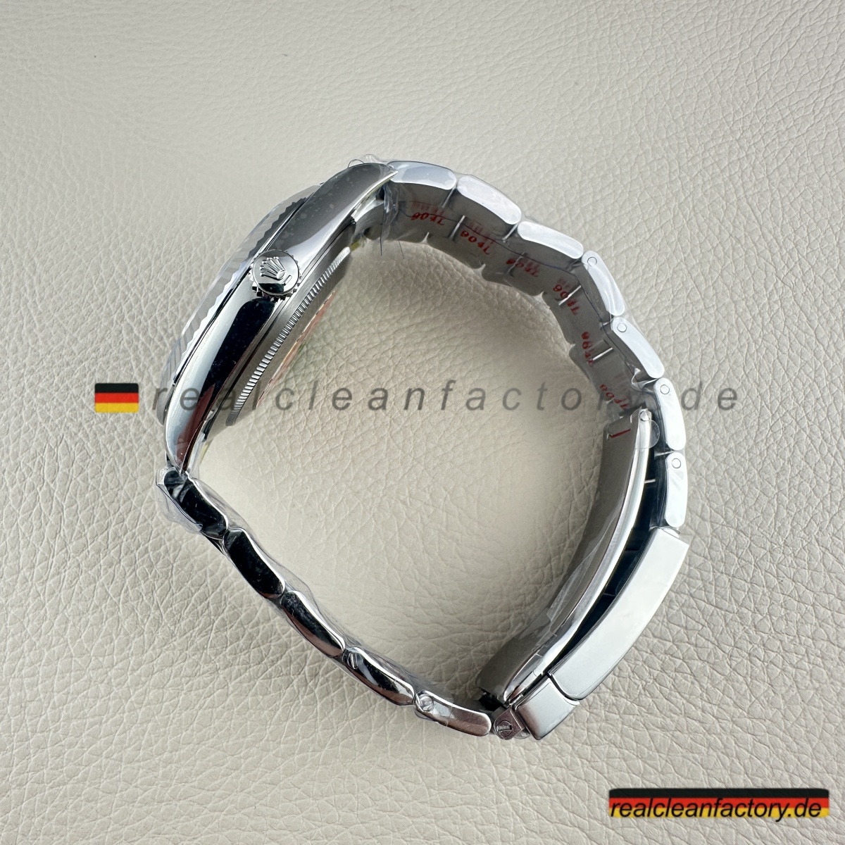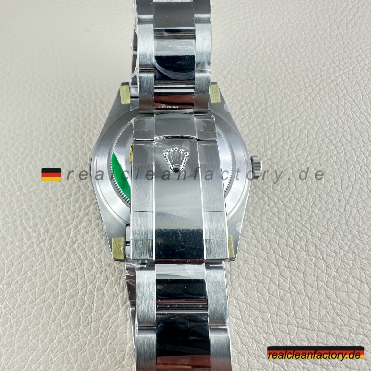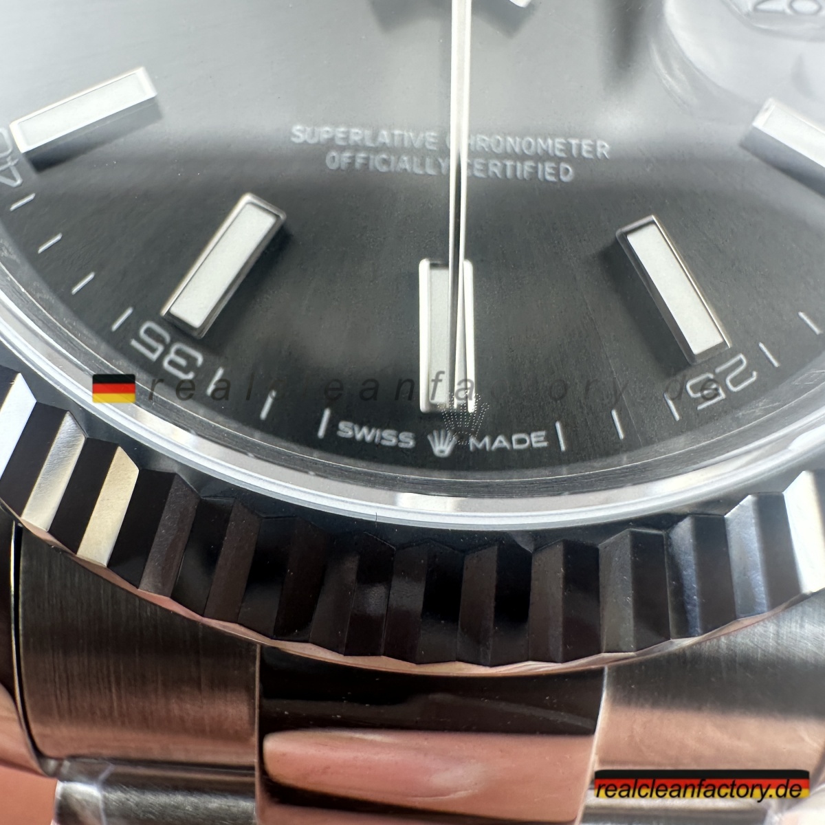 Dieses Modell kombiniert das anspruchsvolle graue Zifferblatt mit einer weißgoldenen, geriffelten Lünette und setzt auf das Oyster-Armband anstelle des Jubilee. Legt man es neben eine echte Rolex, muss man schon ganz genau hinsehen, um einen Unterschied zu erkennen – die Qualität ist wirklich so überzeugend. - Das graue Sunburst-Zifferblatt ist der Punkt, an dem die meisten Hersteller scheitern. Entweder wird es zu dunkel und wirkt wie stumpfes Gunmetal, oder zu hell, wodurch es billig und ausgewaschen aussieht. Clean Factory hat exakt den silbergrauen Ton getroffen, den Rolex verwendet – mit der metallischen Nuance, die sich je nach Lichteinfall subtil verändert. Die feine Sonnenschliff-Struktur strahlt perfekt vom Zentrum aus, mit der richtigen Körnung – nicht zu grob wie bei günstigen Nachbauten, aber auch nicht so schwach, dass es an Tiefe fehlt.