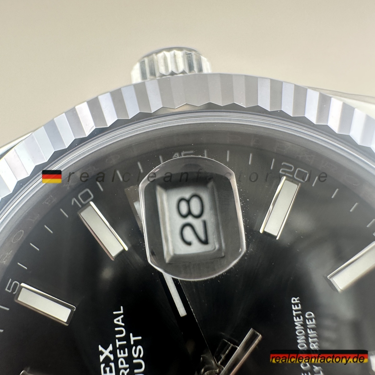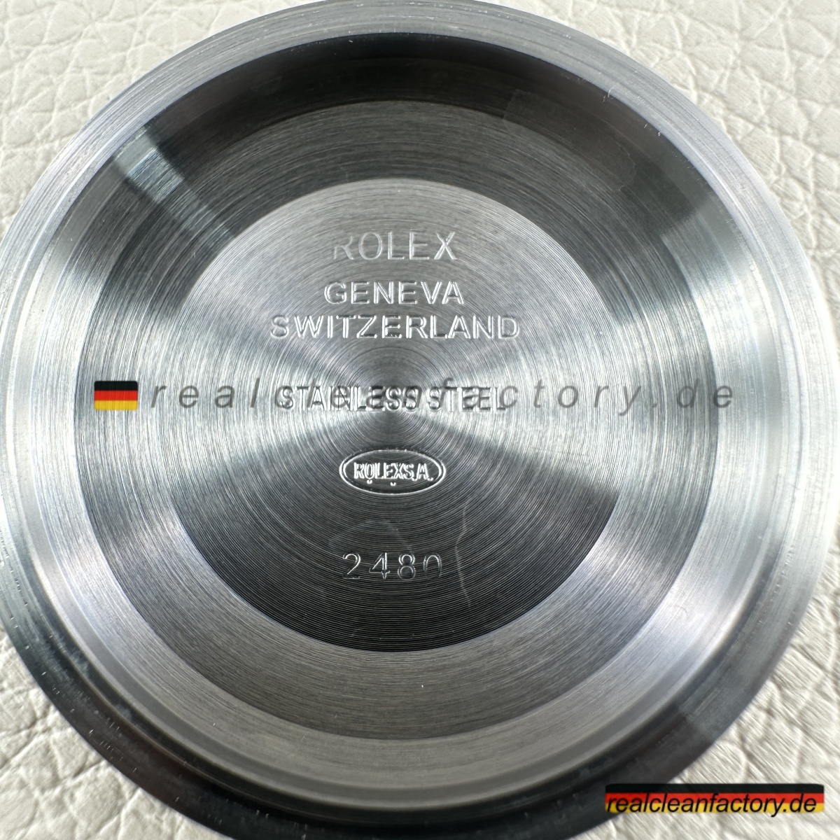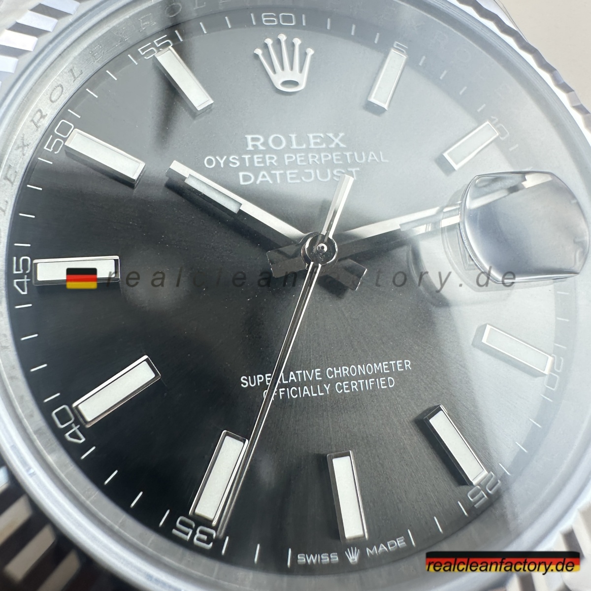 Dieses Modell kombiniert das anspruchsvolle graue Zifferblatt mit einer weißgoldenen, geriffelten Lünette und setzt auf das Oyster-Armband anstelle des Jubilee. Legt man es neben eine echte Rolex, muss man schon ganz genau hinsehen, um einen Unterschied zu erkennen – die Qualität ist wirklich so überzeugend. - Das graue Sunburst-Zifferblatt ist der Punkt, an dem die meisten Hersteller scheitern. Entweder wird es zu dunkel und wirkt wie stumpfes Gunmetal, oder zu hell, wodurch es billig und ausgewaschen aussieht. Clean Factory hat exakt den silbergrauen Ton getroffen, den Rolex verwendet – mit der metallischen Nuance, die sich je nach Lichteinfall subtil verändert. Die feine Sonnenschliff-Struktur strahlt perfekt vom Zentrum aus, mit der richtigen Körnung – nicht zu grob wie bei günstigen Nachbauten, aber auch nicht so schwach, dass es an Tiefe fehlt.