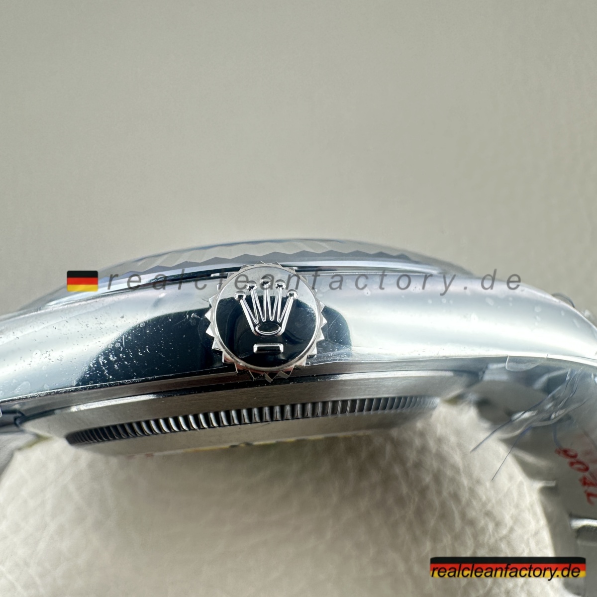 - Die weißgoldene, geriffelte Lünette hebt Clean Factory noch weiter hervor. Viele Nachbauten haben Rillen, die zu flach oder rundlich sind, aber hier sind die Rillen exakt so tief und scharf definiert, wie man es beim Original fühlt, wenn man mit dem Finger darüberstreicht. Das Kronensystem reproduziert das echte Triplock-Design perfekt: Das Coronet-Logo hat die korrekte Tiefe und Schärfe, die Kronenschützer sind präzise proportioniert, und das Gewinde greift genauso wie beim Original.