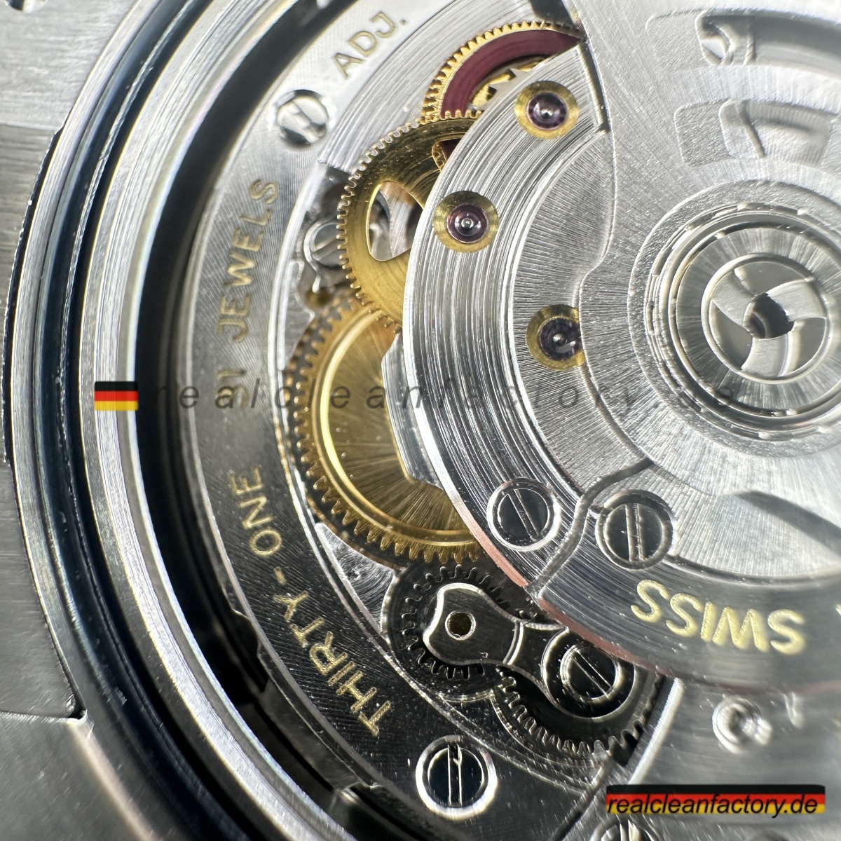 Das 3235 Super Clone Werk ist nicht nur optisch identisch – es hat den Sofort-Datumswechsel um Mitternacht, den originalen Aufzugswiderstand und Rotor- sowie Brücken-Gravuren, die dem Original bis ins Detail gleichen.