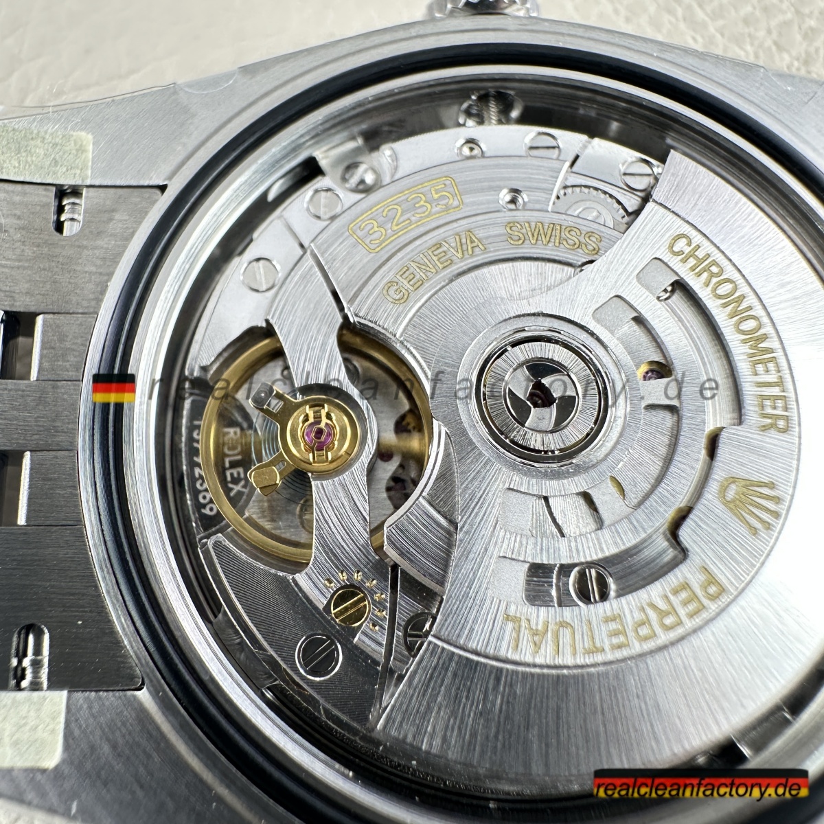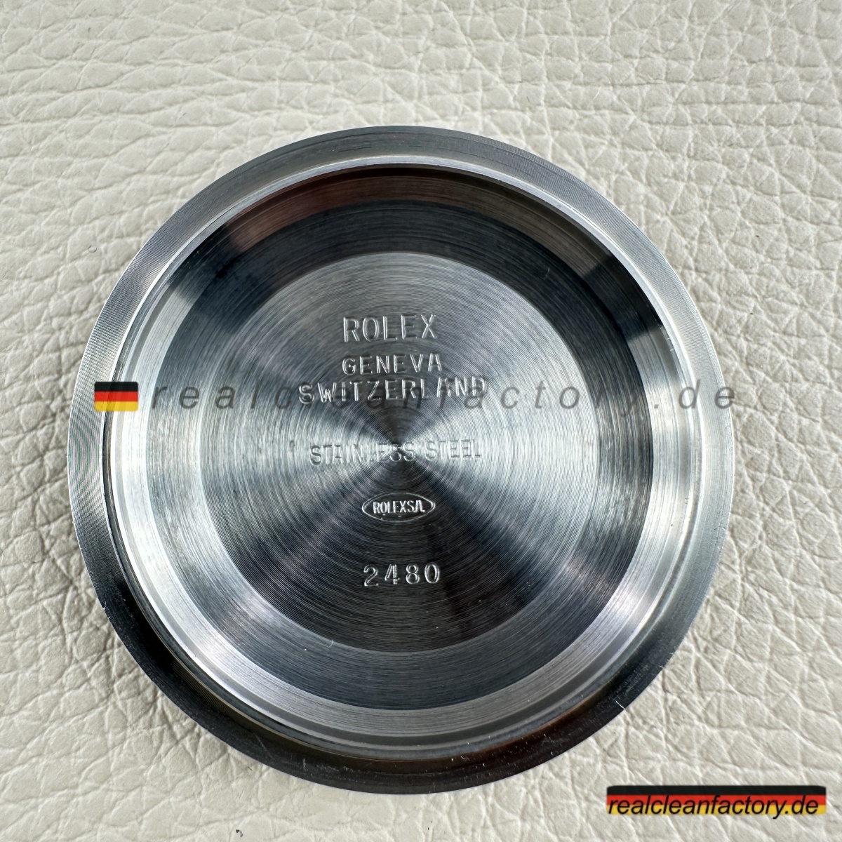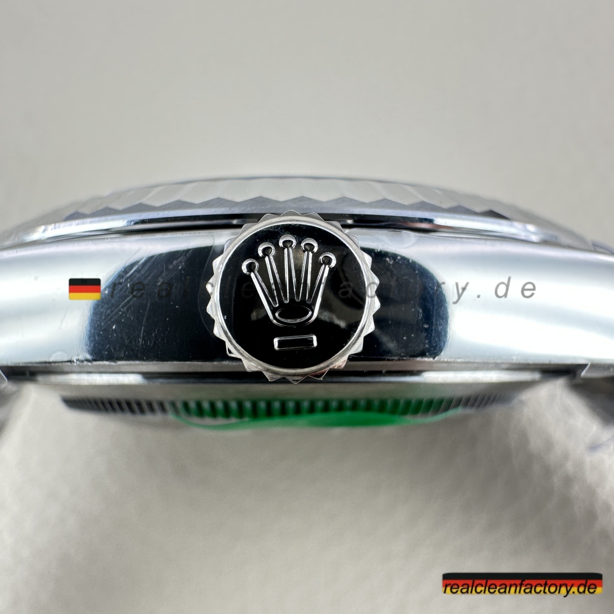 - Die Cyclops-Lupe vergrößert das Datum exakt 2,5-fach und sitzt perfekt zentriert über dem Fenster. Die Datumsziffern entsprechen in Form, Stärke und Dichte genau den Rolex-Vorgaben. Das Saphirglas trägt die feine Laserkrone bei 6 Uhr – ein Detail, das die Sorgfalt der Fertigung bis ins Kleinste belegt.