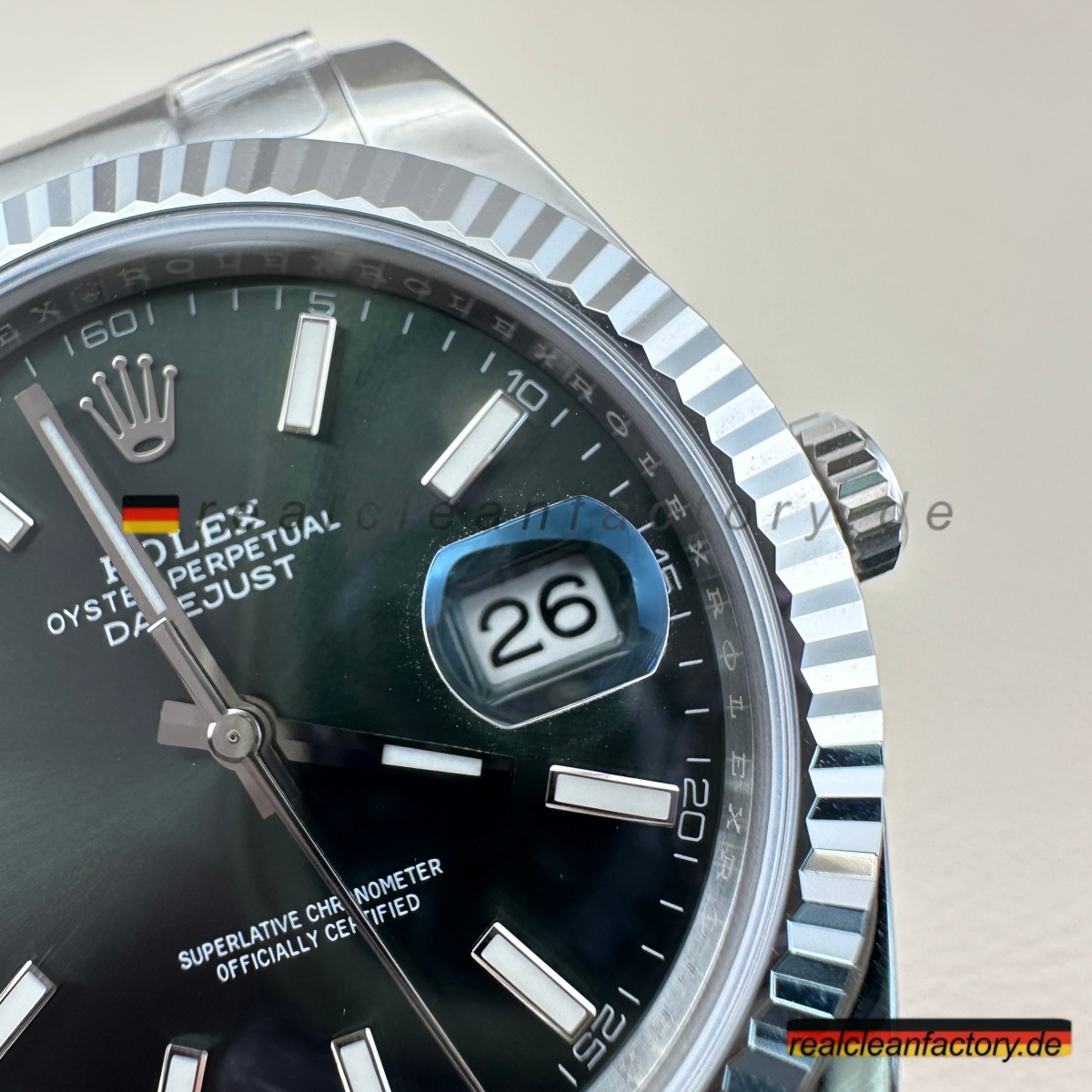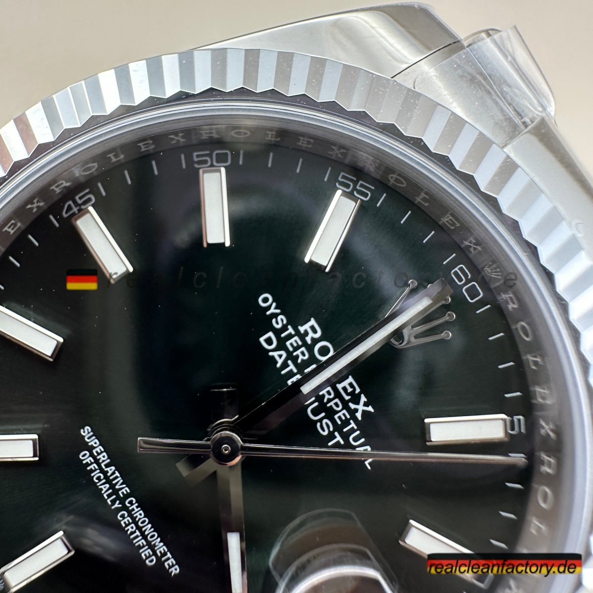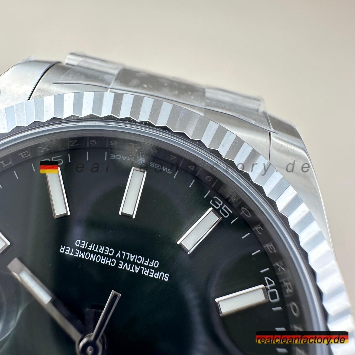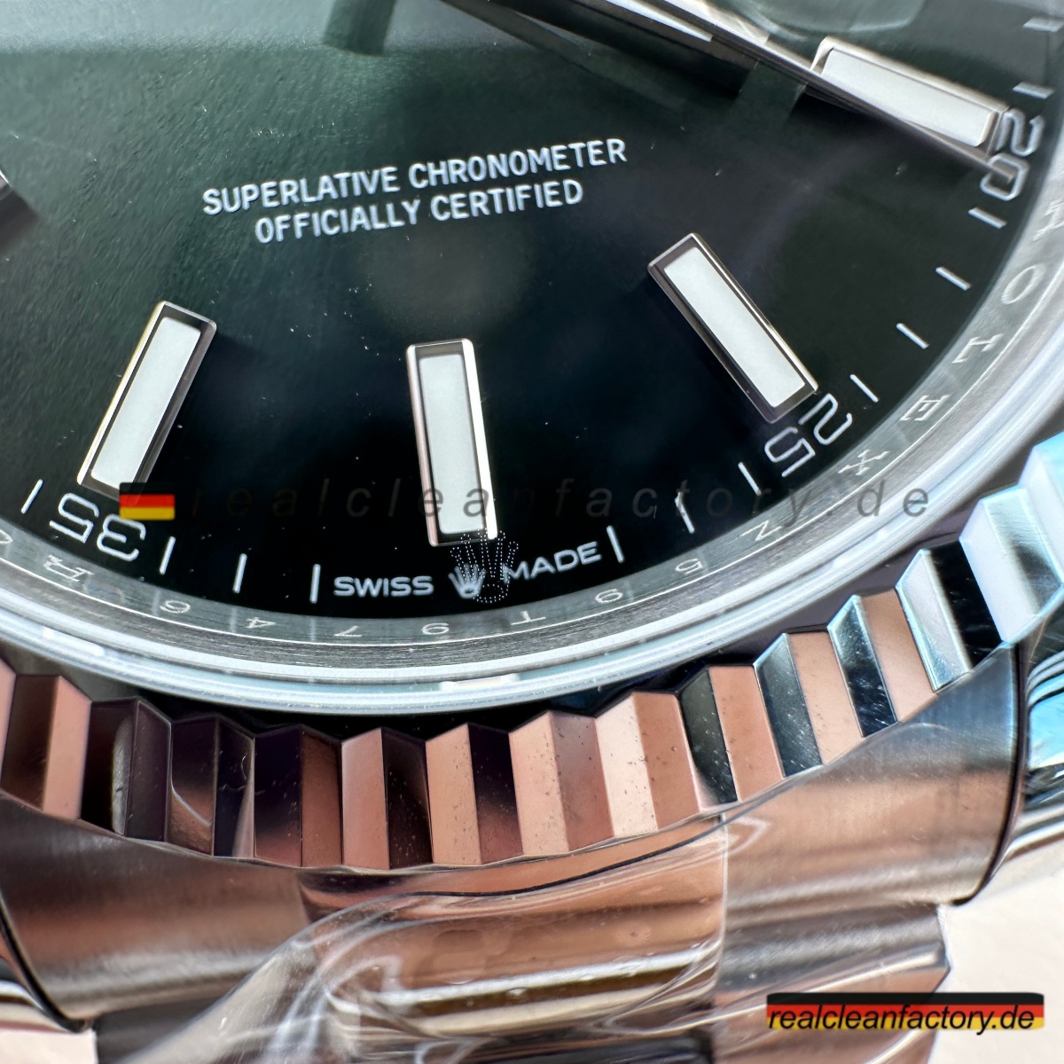 - Die Drucke auf einem grünen Zifferblatt sind ein weiteres Detail, das überraschend schwer zu meistern ist. Der Text "OYSTER PERPETUAL" und "SUPERLATIVE CHRONOMETER" muss scharfe Kanten und die richtige Opazität aufweisen, andernfalls verschmilzt der Text mit der Farbe oder wirkt dick und billig. Hier zeigt Clean Factory, dass sie den gleichen Schweizer Druckprozess verwenden, den Rolex nutzt – der Text sitzt perfekt auf dem Zifferblatt, scharf und gleichmäßig.