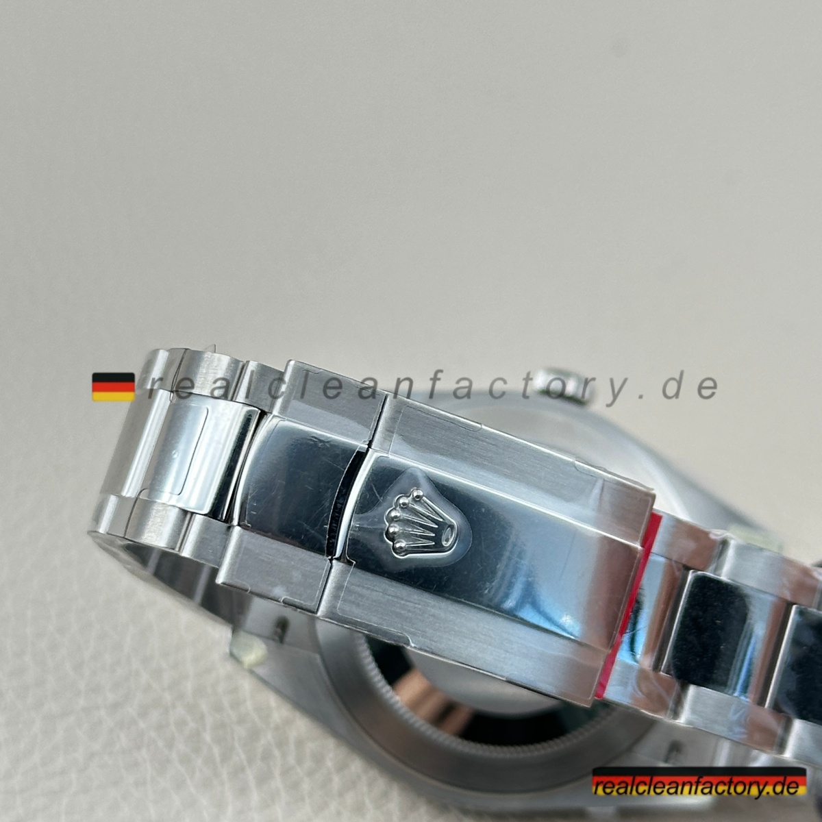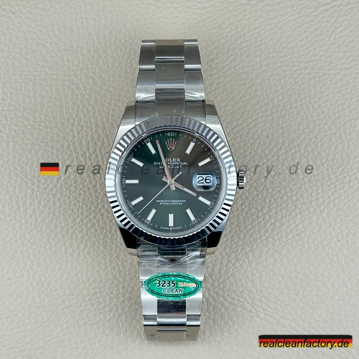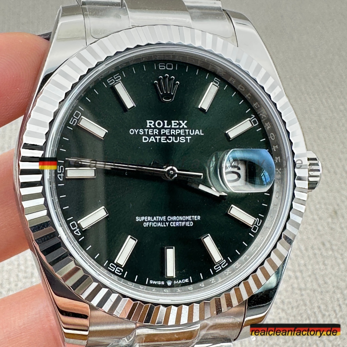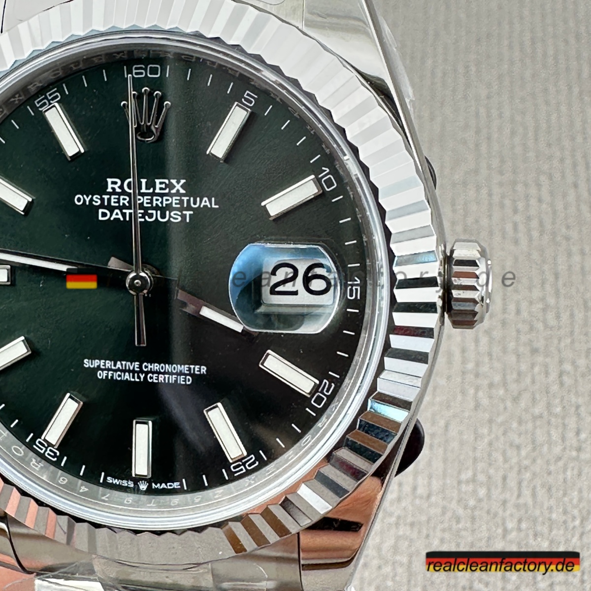 - Die Drucke auf einem grünen Zifferblatt sind ein weiteres Detail, das überraschend schwer zu meistern ist. Der Text "OYSTER PERPETUAL" und "SUPERLATIVE CHRONOMETER" muss scharfe Kanten und die richtige Opazität aufweisen, andernfalls verschmilzt der Text mit der Farbe oder wirkt dick und billig. Hier zeigt Clean Factory, dass sie den gleichen Schweizer Druckprozess verwenden, den Rolex nutzt – der Text sitzt perfekt auf dem Zifferblatt, scharf und gleichmäßig.