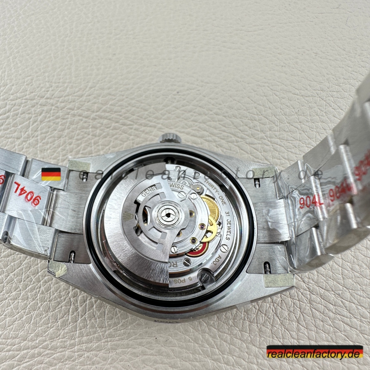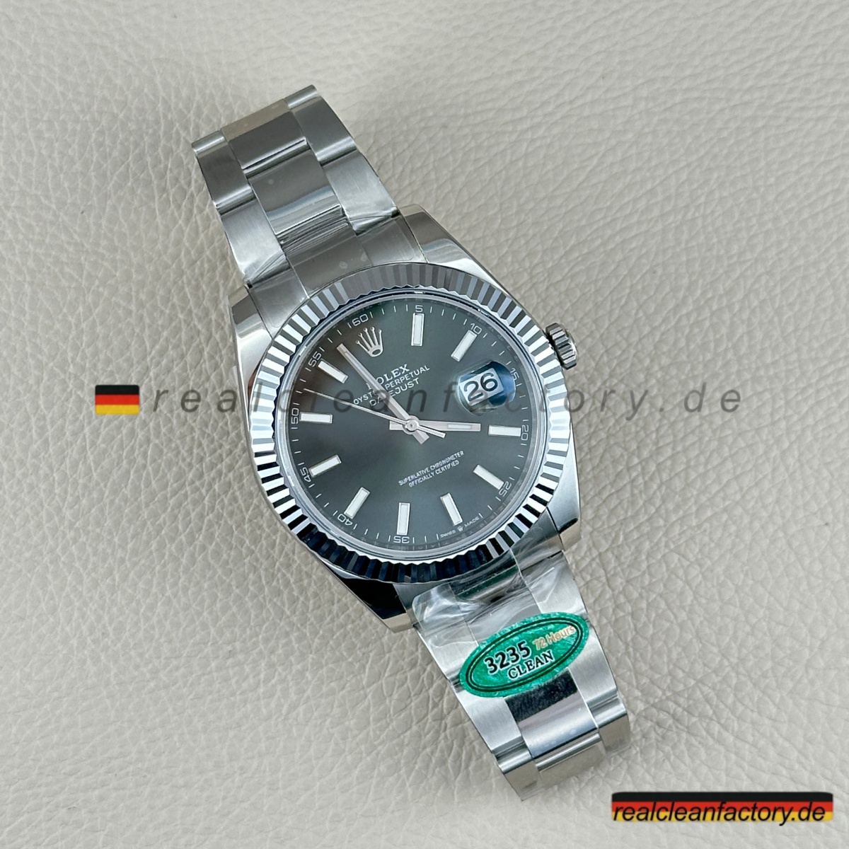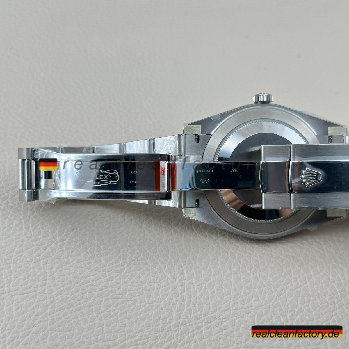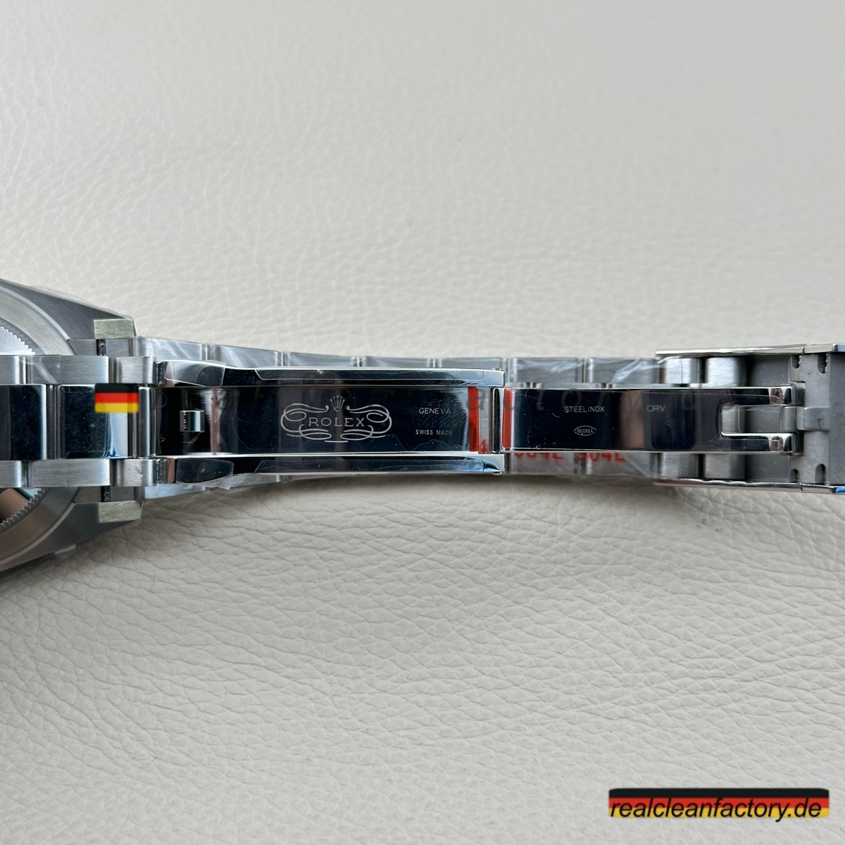 - Die Drucke auf einem grünen Zifferblatt sind ein weiteres Detail, das überraschend schwer zu meistern ist. Der Text "OYSTER PERPETUAL" und "SUPERLATIVE CHRONOMETER" muss scharfe Kanten und die richtige Opazität aufweisen, andernfalls verschmilzt der Text mit der Farbe oder wirkt dick und billig. Hier zeigt Clean Factory, dass sie den gleichen Schweizer Druckprozess verwenden, den Rolex nutzt – der Text sitzt perfekt auf dem Zifferblatt, scharf und gleichmäßig.