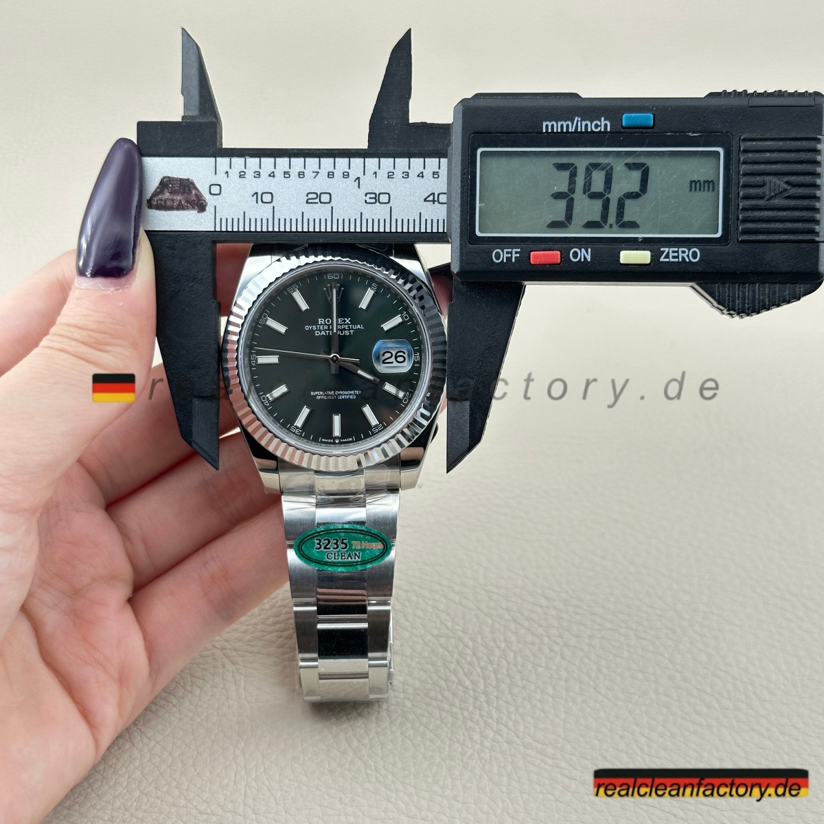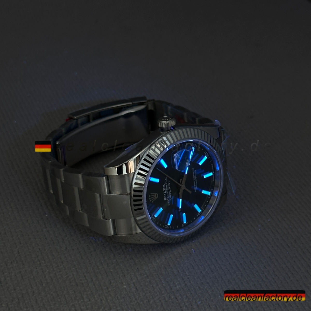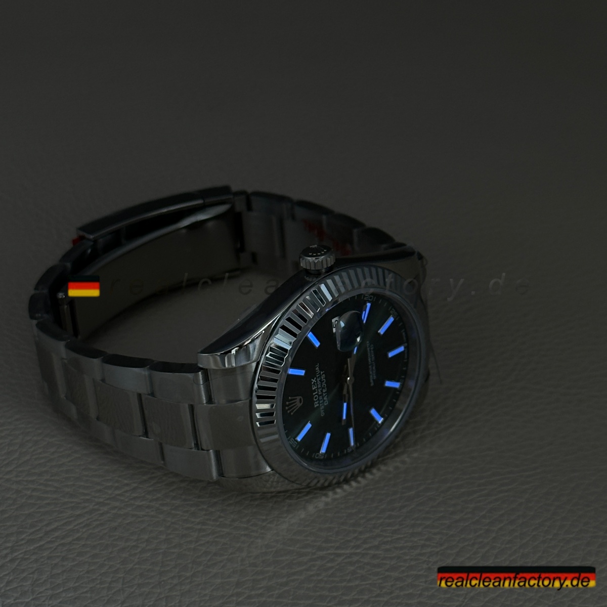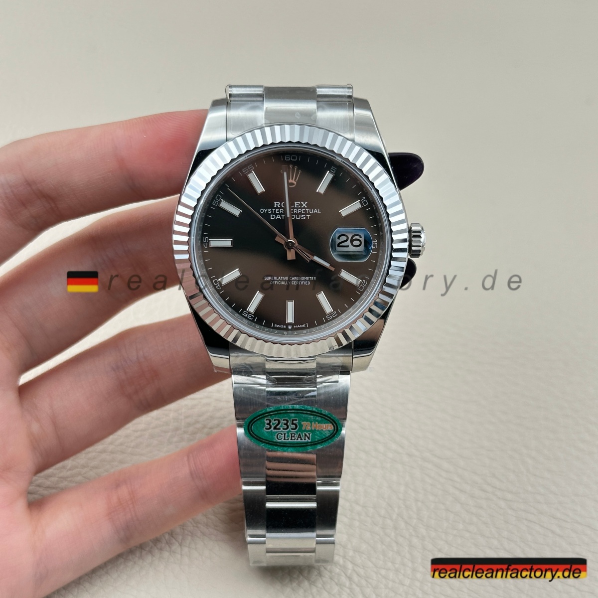 - Die Drucke auf einem grünen Zifferblatt sind ein weiteres Detail, das überraschend schwer zu meistern ist. Der Text "OYSTER PERPETUAL" und "SUPERLATIVE CHRONOMETER" muss scharfe Kanten und die richtige Opazität aufweisen, andernfalls verschmilzt der Text mit der Farbe oder wirkt dick und billig. Hier zeigt Clean Factory, dass sie den gleichen Schweizer Druckprozess verwenden, den Rolex nutzt – der Text sitzt perfekt auf dem Zifferblatt, scharf und gleichmäßig.