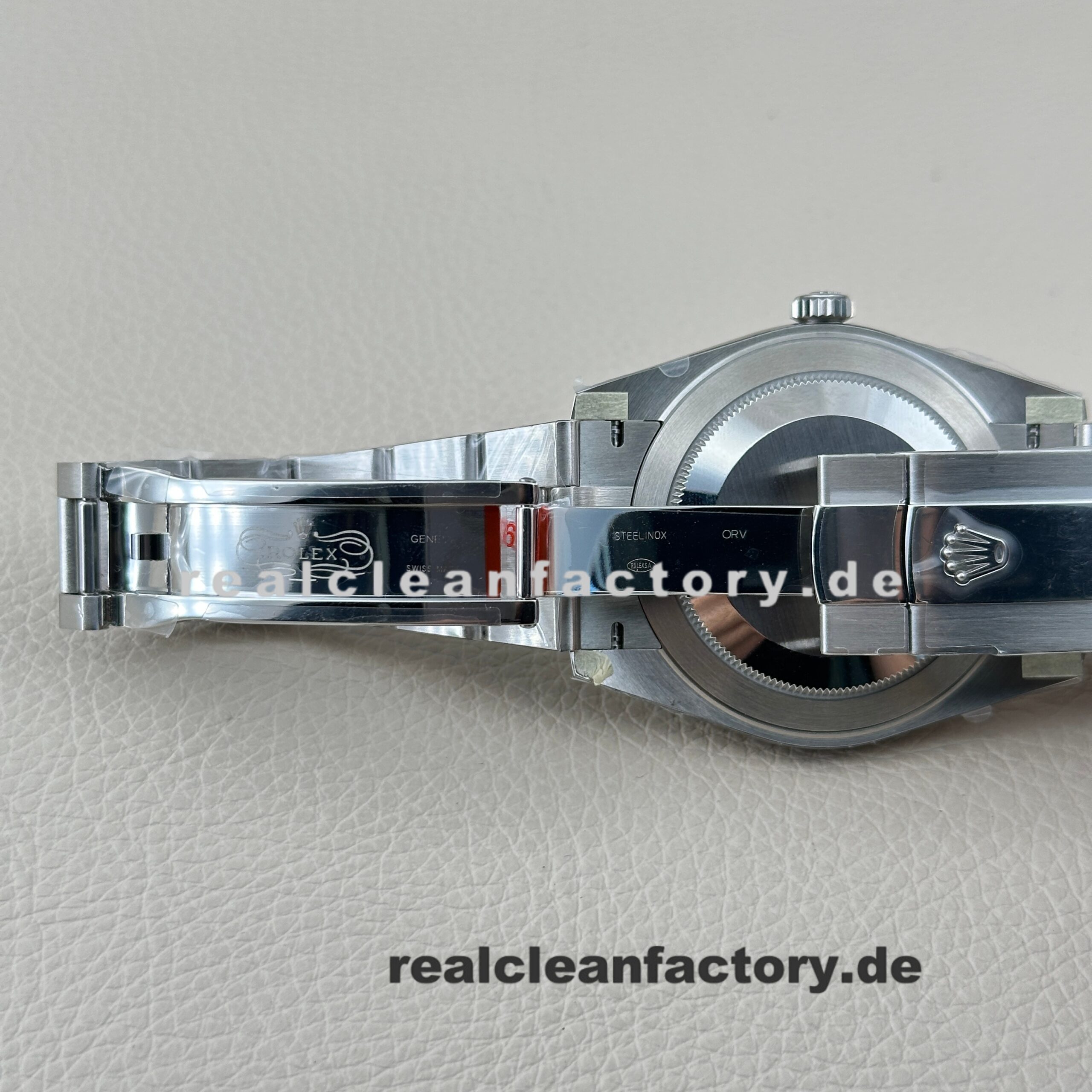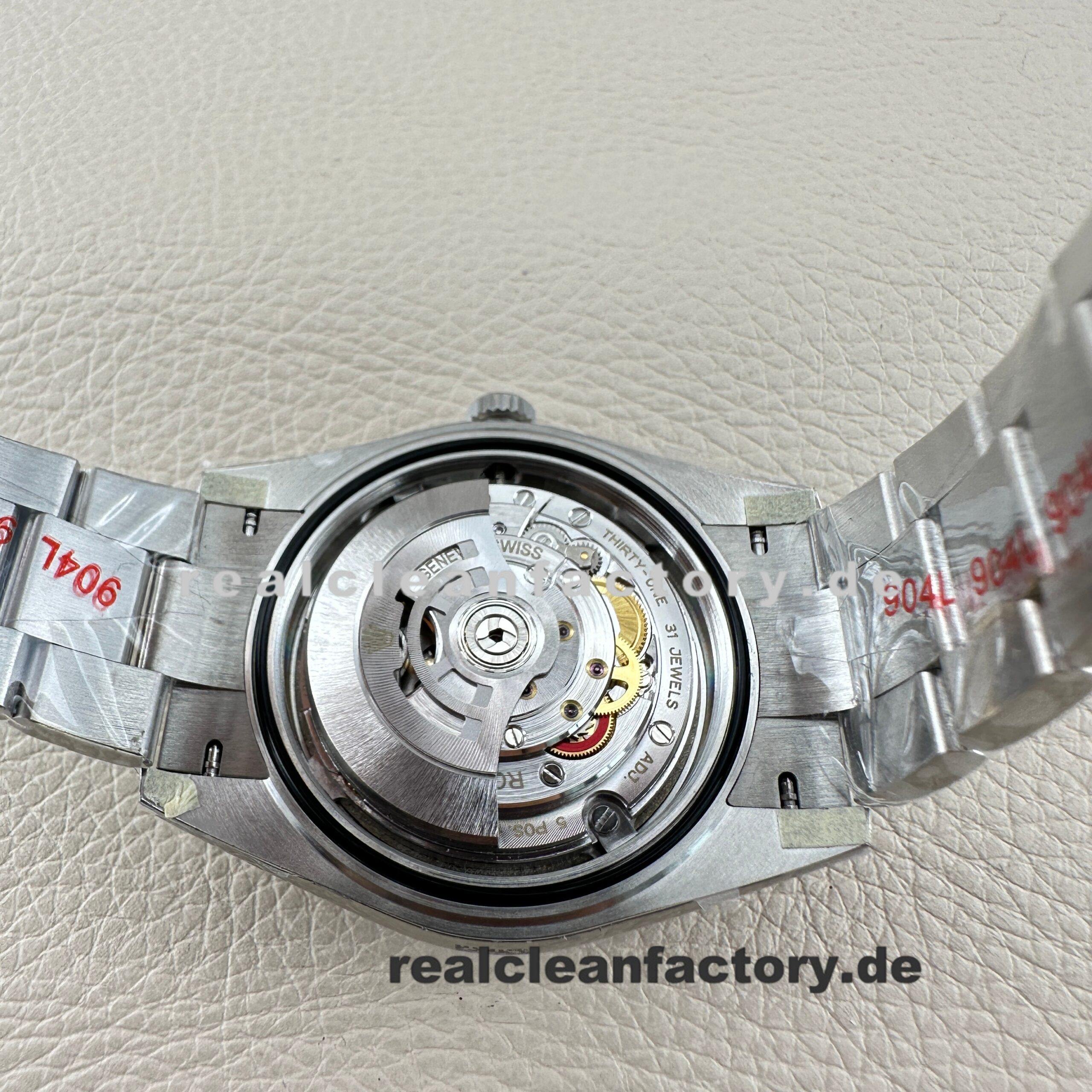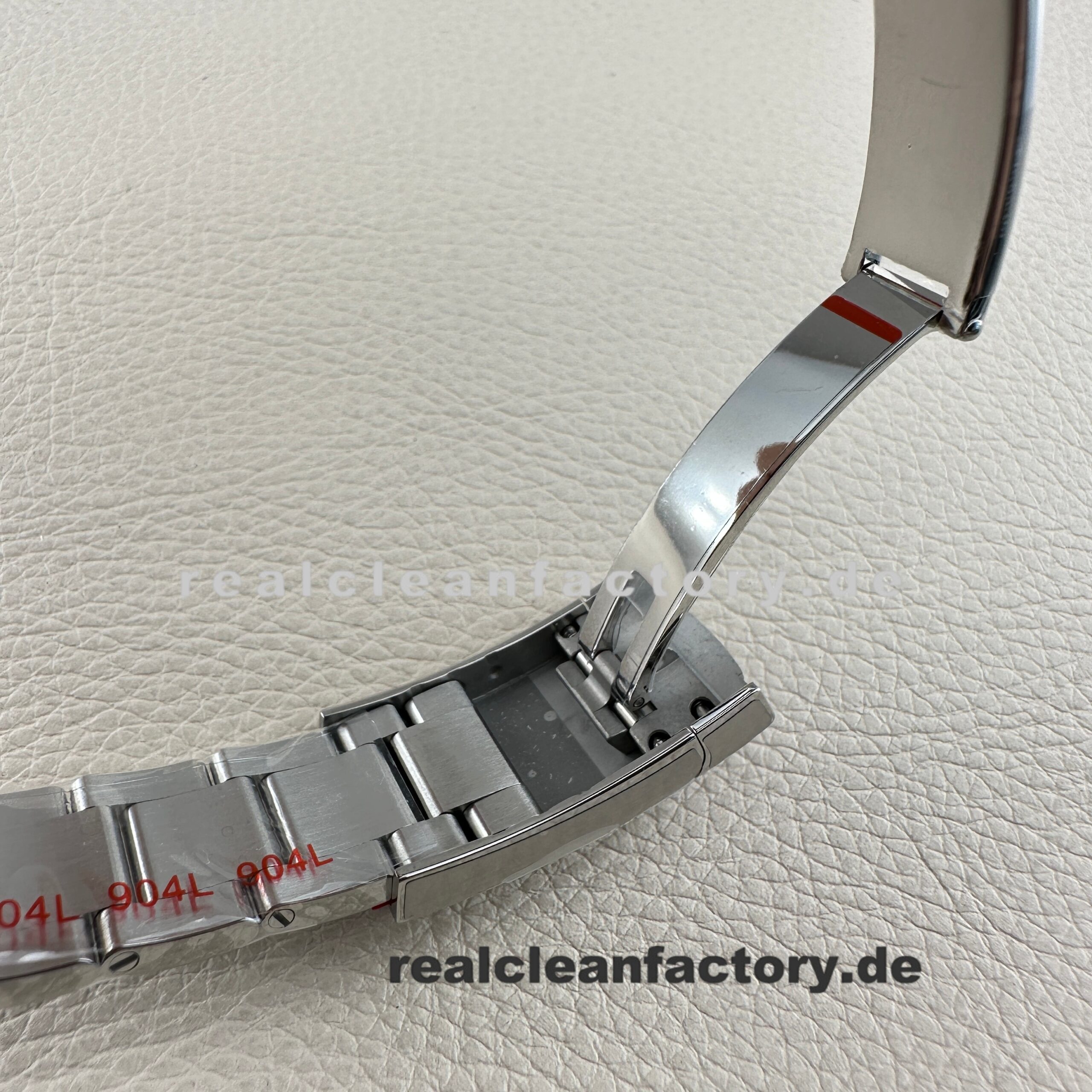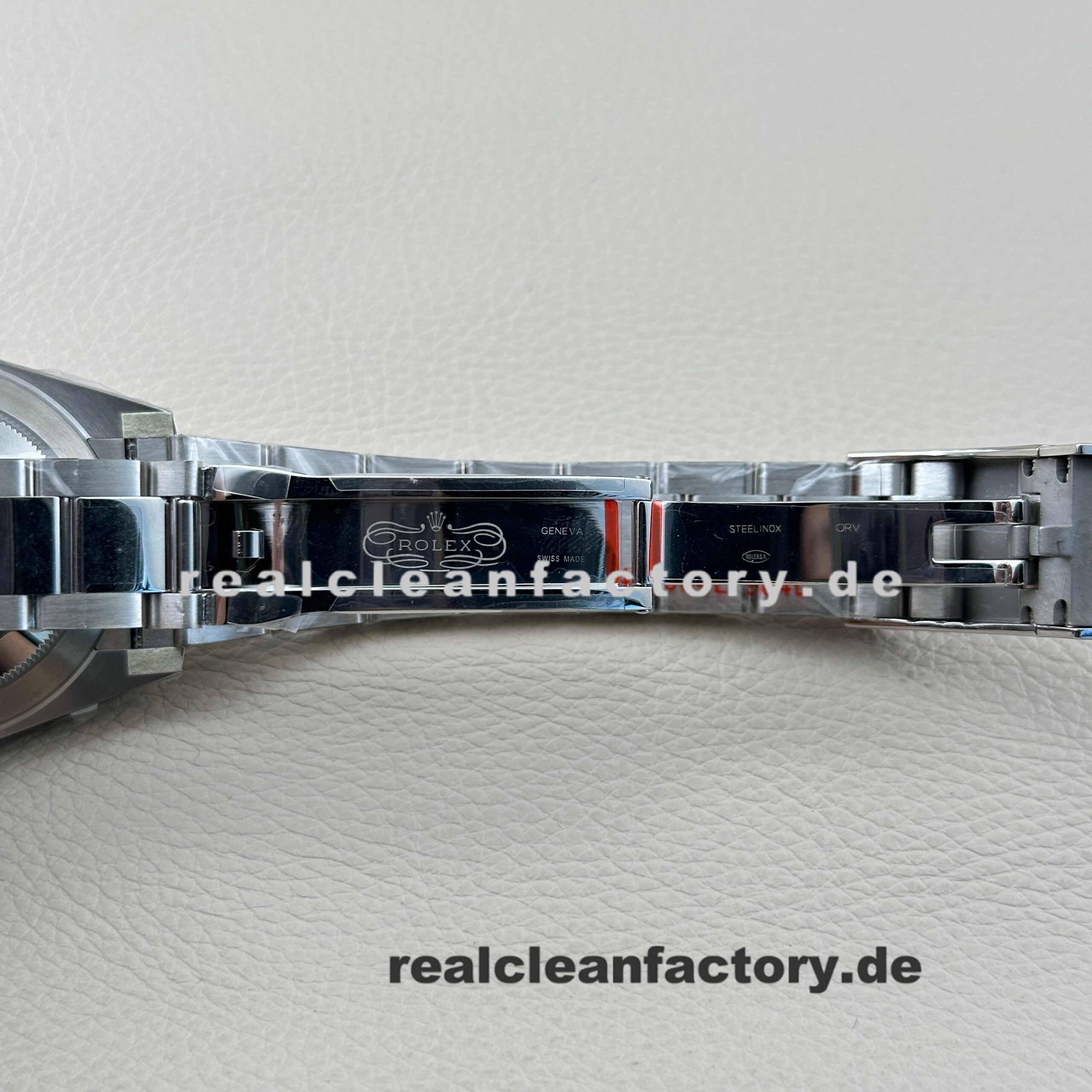 • Das Oyster-Armband passt perfekt zu diesem Zifferblatt. Es hat das sportliche, zielgerichtete Gefühl, das die abenteuerlichere Farbe ausgleicht. Jedes Glied wird aus echtem 904L-Stahl gefertigt, nicht aus dem weicheren 316L, den viele Klone verwenden. Die gebürsteten Mittelglieder und die polierten Außenkanten sind sauber verarbeitet, mit scharfen Übergängen, und die Easylink-Erweiterung funktioniert reibungslos – keine billige Steifheit hier. Schon beim Handling merkt man sofort, dass das Armband das gleiche Gewicht und die gleiche Flüssigkeit wie ein Rolex-Armband hat.