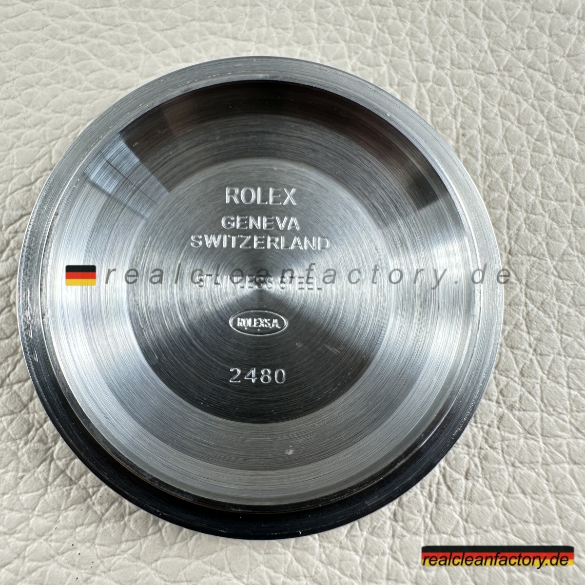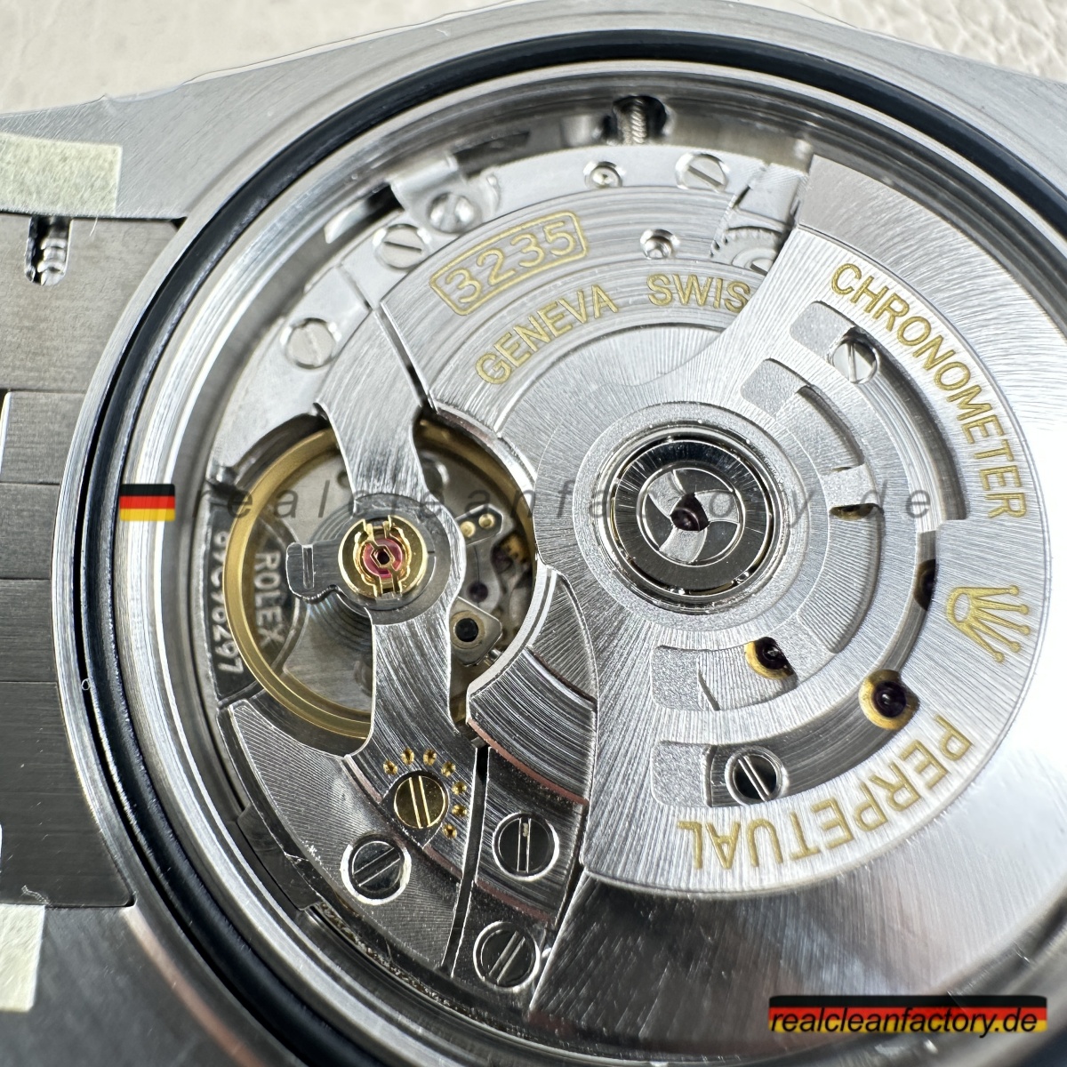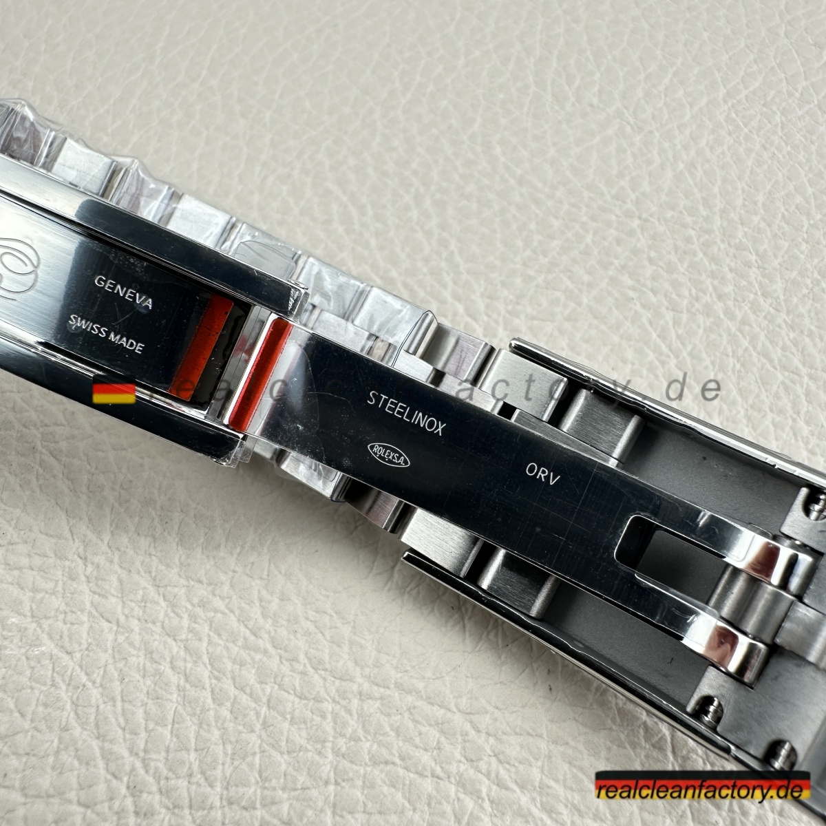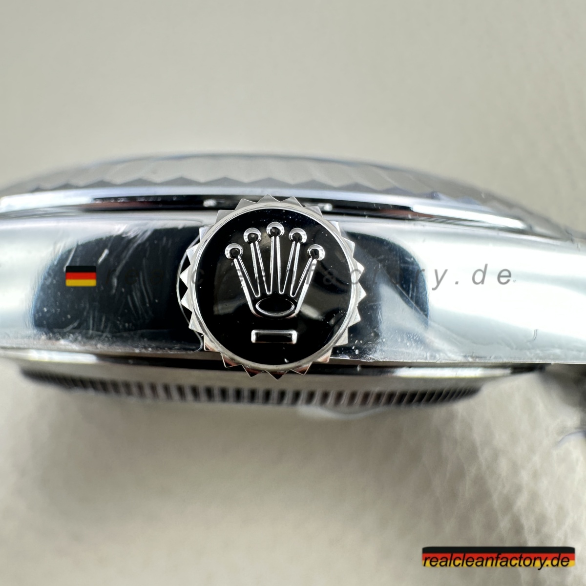 - Die Cyclops-Lupe bietet die korrekte 2,5-fache Vergrößerung, perfekt zentriert über dem Datumsfenster. Die Datumsziffern selbst entsprechen in allen Details den Rolex-Spezifikationen. Das Saphirglas trägt die winzige Laserkrone bei 6 Uhr – genau da, wo sie hingehört.