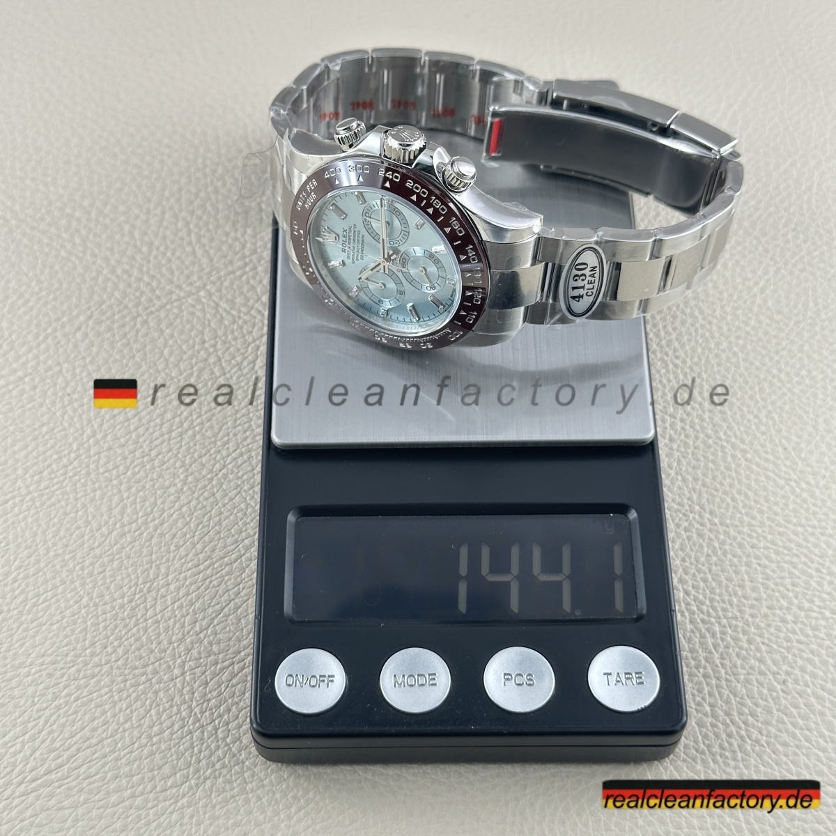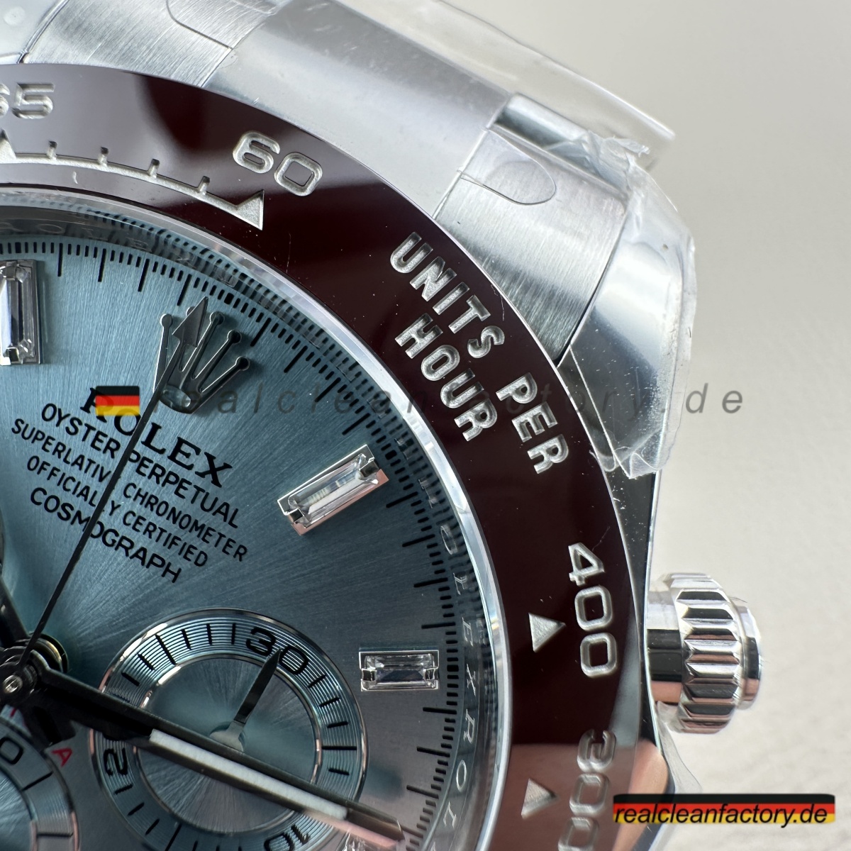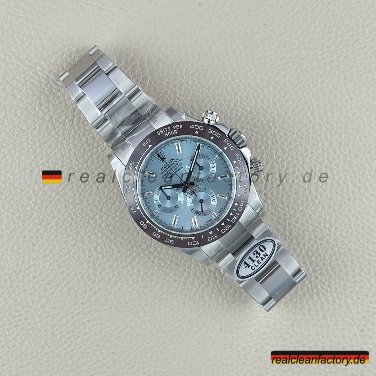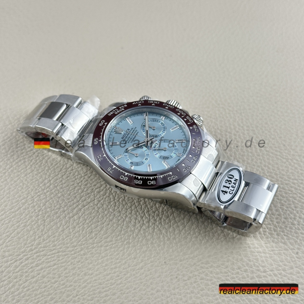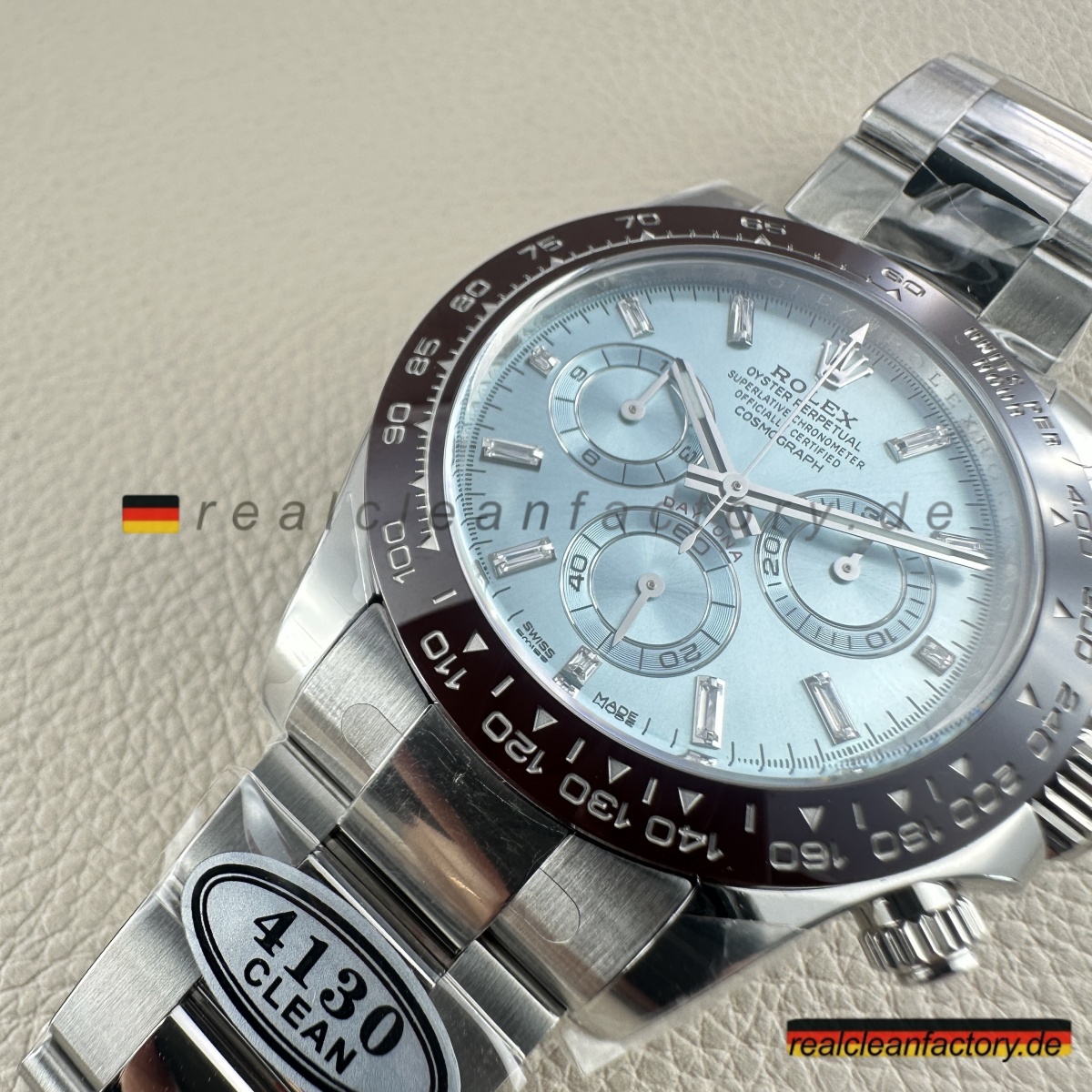 • Clean Factory gibt volle Garantie, weil sie wissen, dass die Qualität stimmt. Für alle, die die seltenste Daytona-Konfiguration suchen – Ice-Blue-Zifferblatt, braune Keramiklünette und Baguette-Brillanz – ist dies die beste Alternative, ohne sechsstellige Summen auszugeben.
