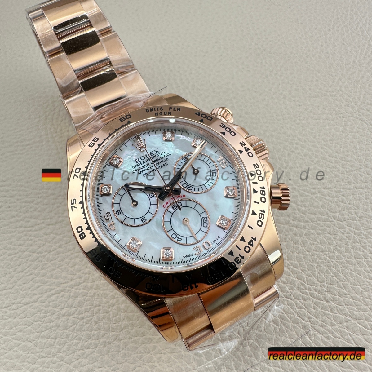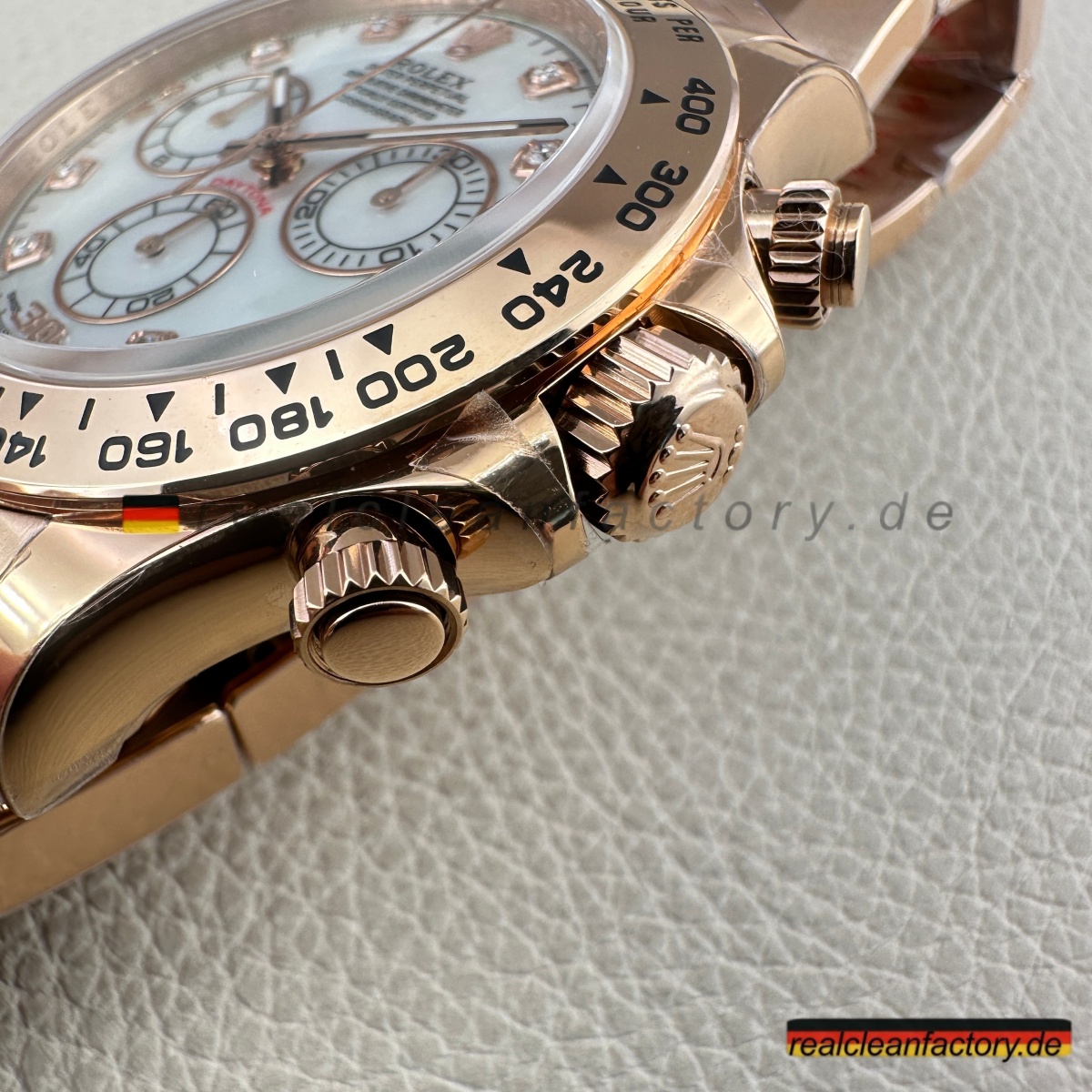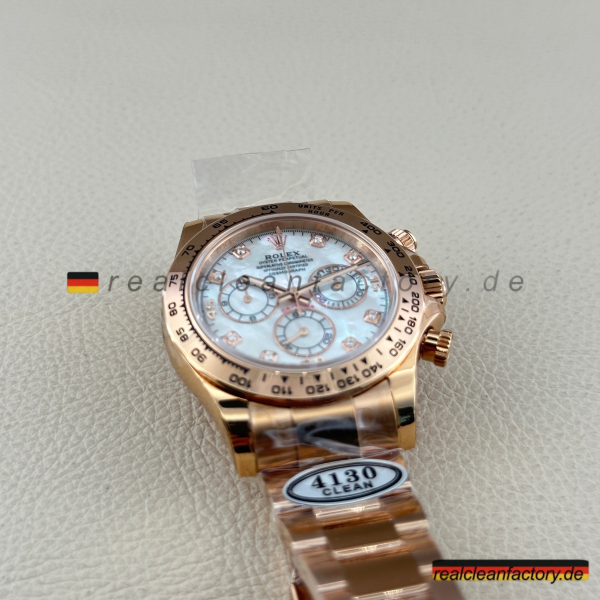 - Unsere Clean Factory Rolex Daytona 116508-0007 in Vollgelbgold mit weißem Perlmutt-Zifferblatt und Diamant-Indizes ist der Inbegriff von Luxus, der von innen heraus leuchtet. Das ist raffinierte Opulenz – wo ein schwarzes Zifferblatt Respekt einfordert und ein Champagner-Zifferblatt leise Eleganz vermittelt, singt das Perlmutt-Zifferblatt mit strahlender Anmut. Es ist die Uhr, die man trägt, wenn man längst aufgehört hat, beeindrucken zu wollen – weil man einfach großartig ist.