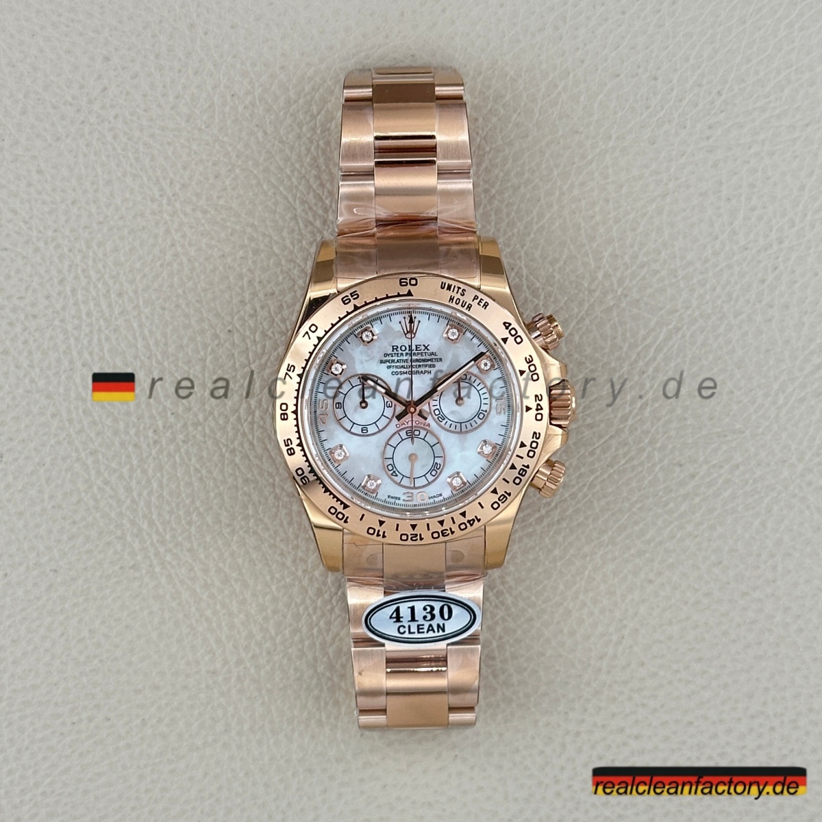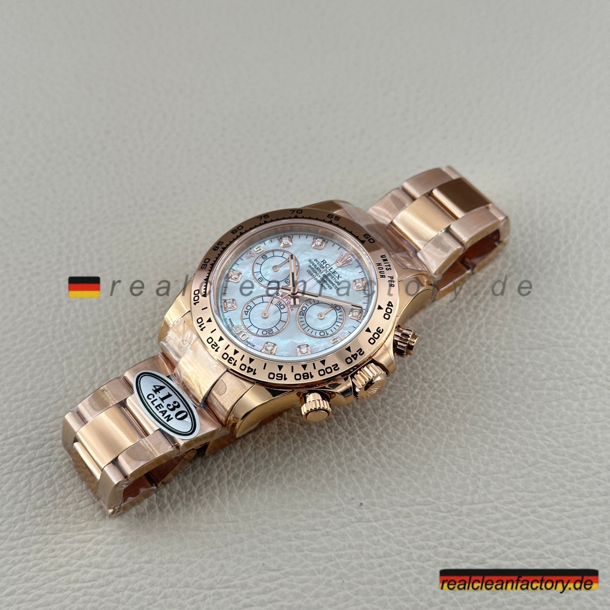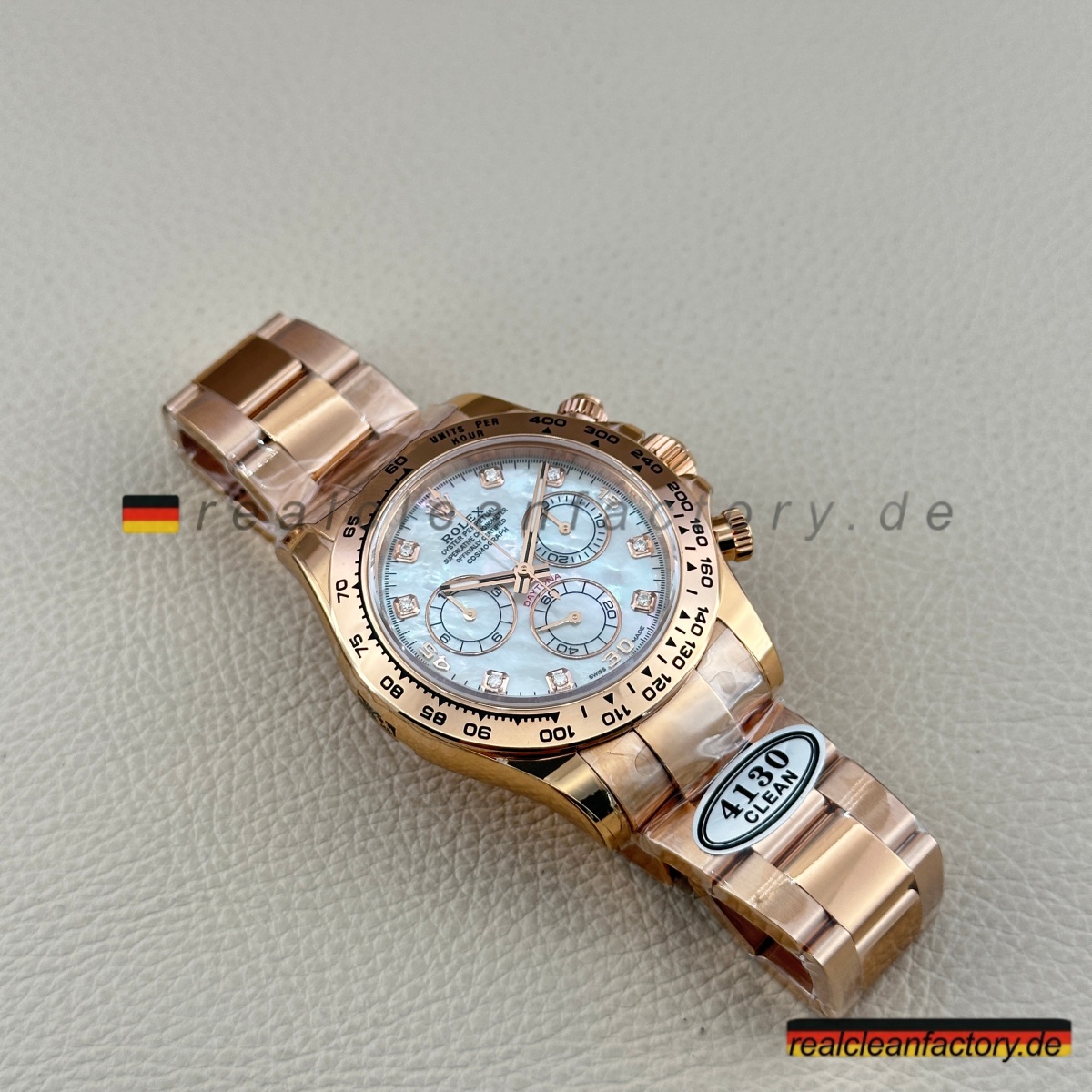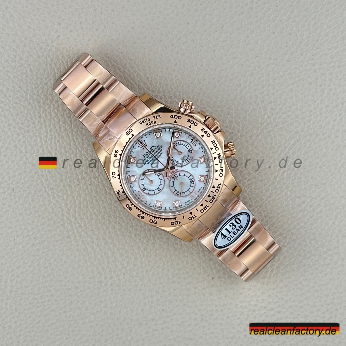 - Unsere Clean Factory Rolex Daytona 116508-0007 in Vollgelbgold mit weißem Perlmutt-Zifferblatt und Diamant-Indizes ist der Inbegriff von Luxus, der von innen heraus leuchtet. Das ist raffinierte Opulenz – wo ein schwarzes Zifferblatt Respekt einfordert und ein Champagner-Zifferblatt leise Eleganz vermittelt, singt das Perlmutt-Zifferblatt mit strahlender Anmut. Es ist die Uhr, die man trägt, wenn man längst aufgehört hat, beeindrucken zu wollen – weil man einfach großartig ist.
