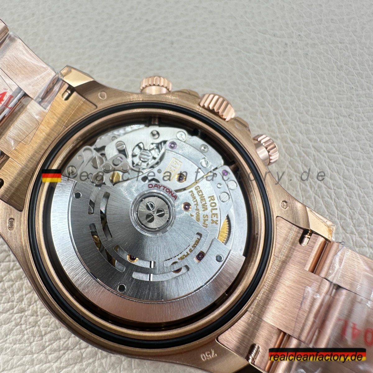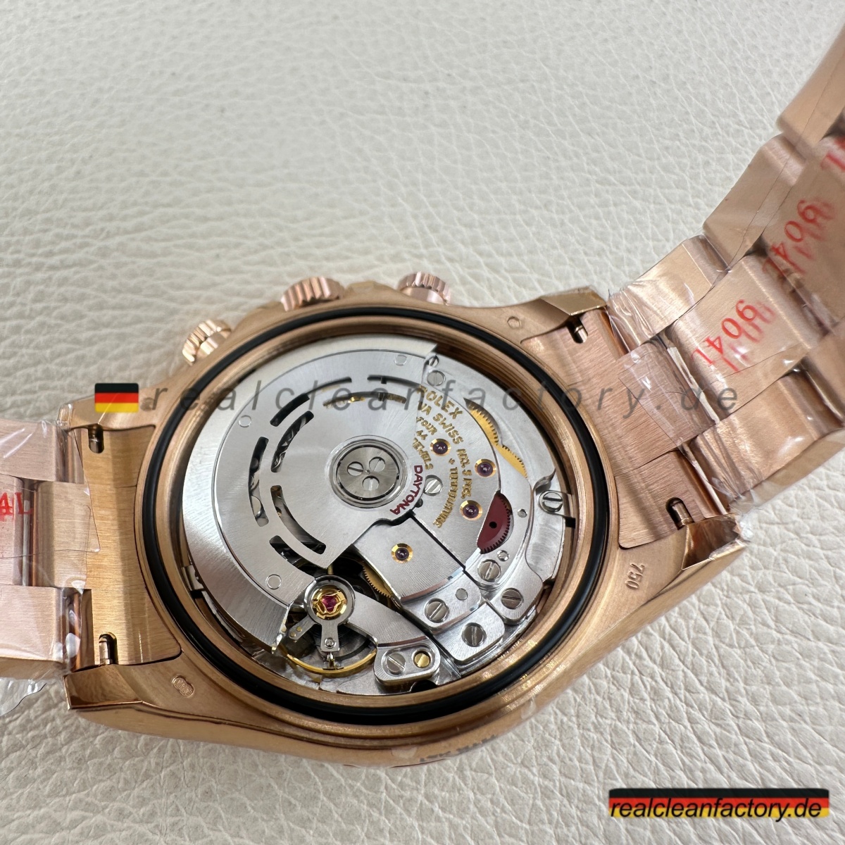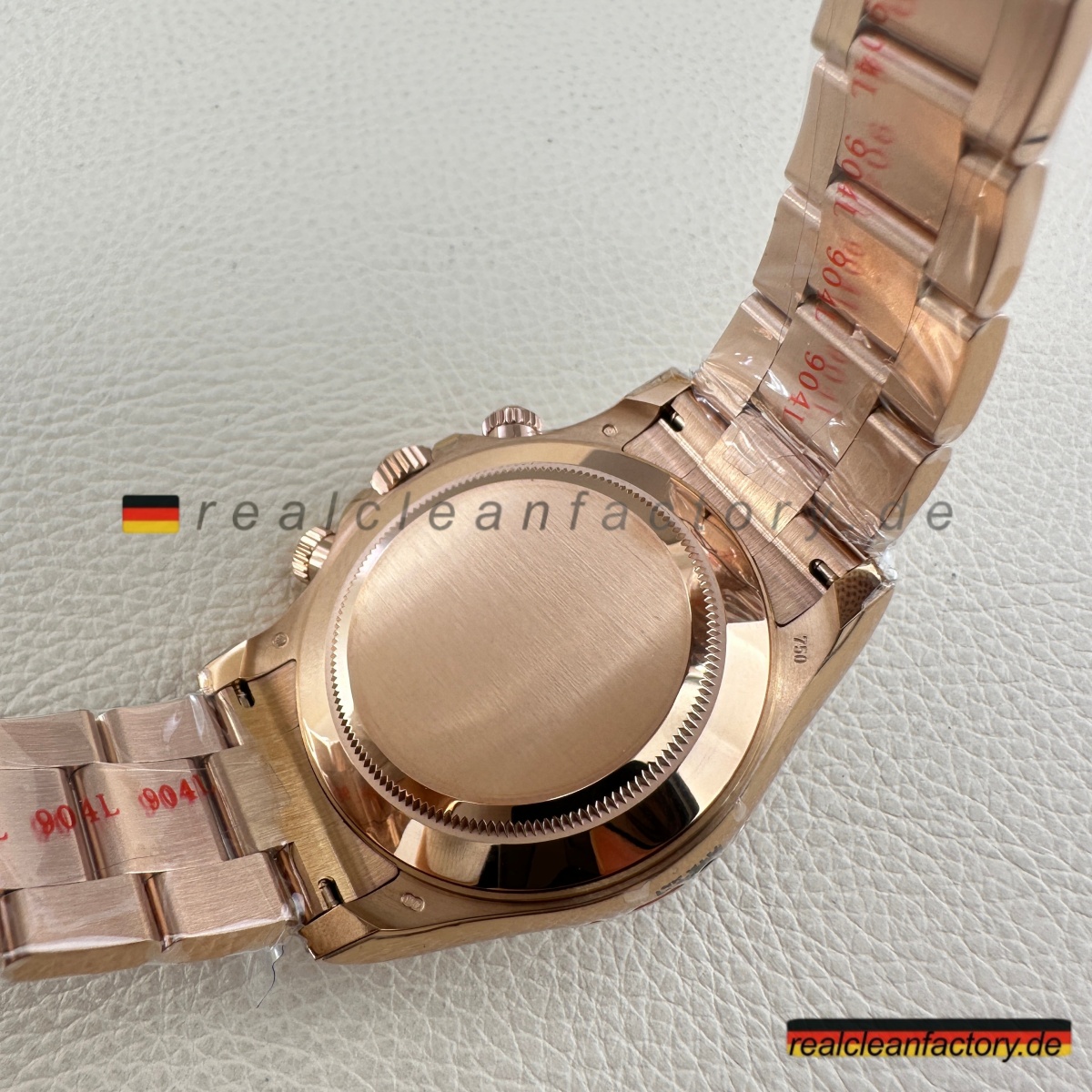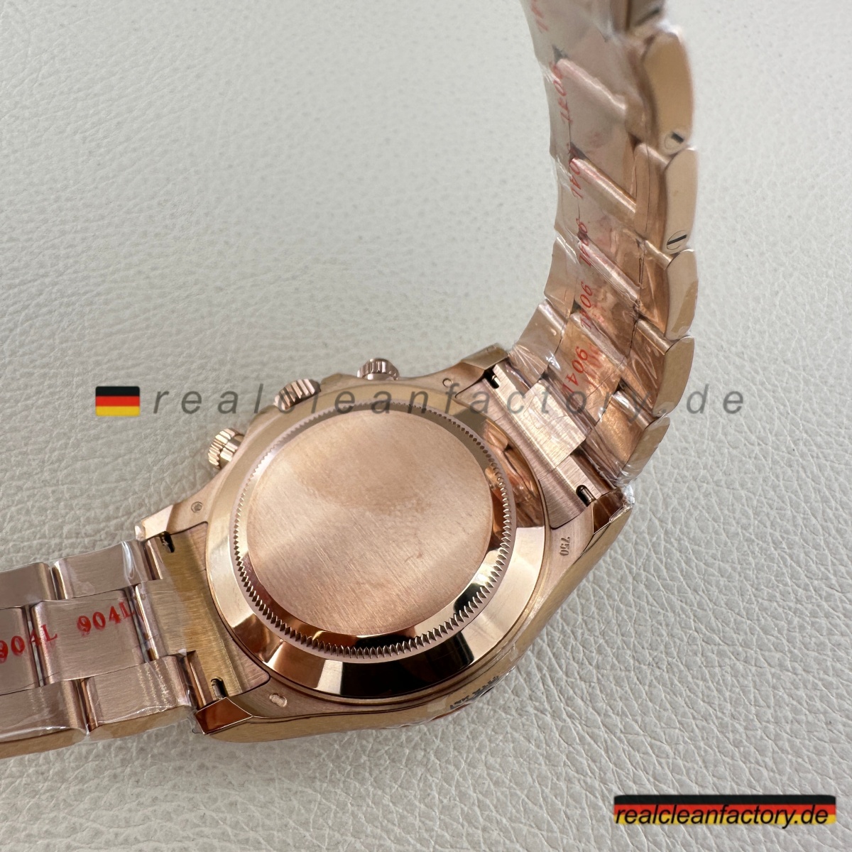 - Clean Factorys massive Goldplattierung ist hier entscheidend. Schon kleinste Verfärbungen oder Abnutzungen würden die filigrane Ästhetik ruinieren. Deshalb wird diese Daytona mit dicker 18k Gold-Ummantelung und molekularer Bindung gefertigt. Mit 144 g verzichtet sie auf billige Füllmetalle, die nur Gewicht vortäuschen. Stattdessen bekommt man echtes Rolex-Gold, das dauerhaft strahlt – ohne schwarze Flecken, ohne grünen Belag, ohne Enttäuschung.