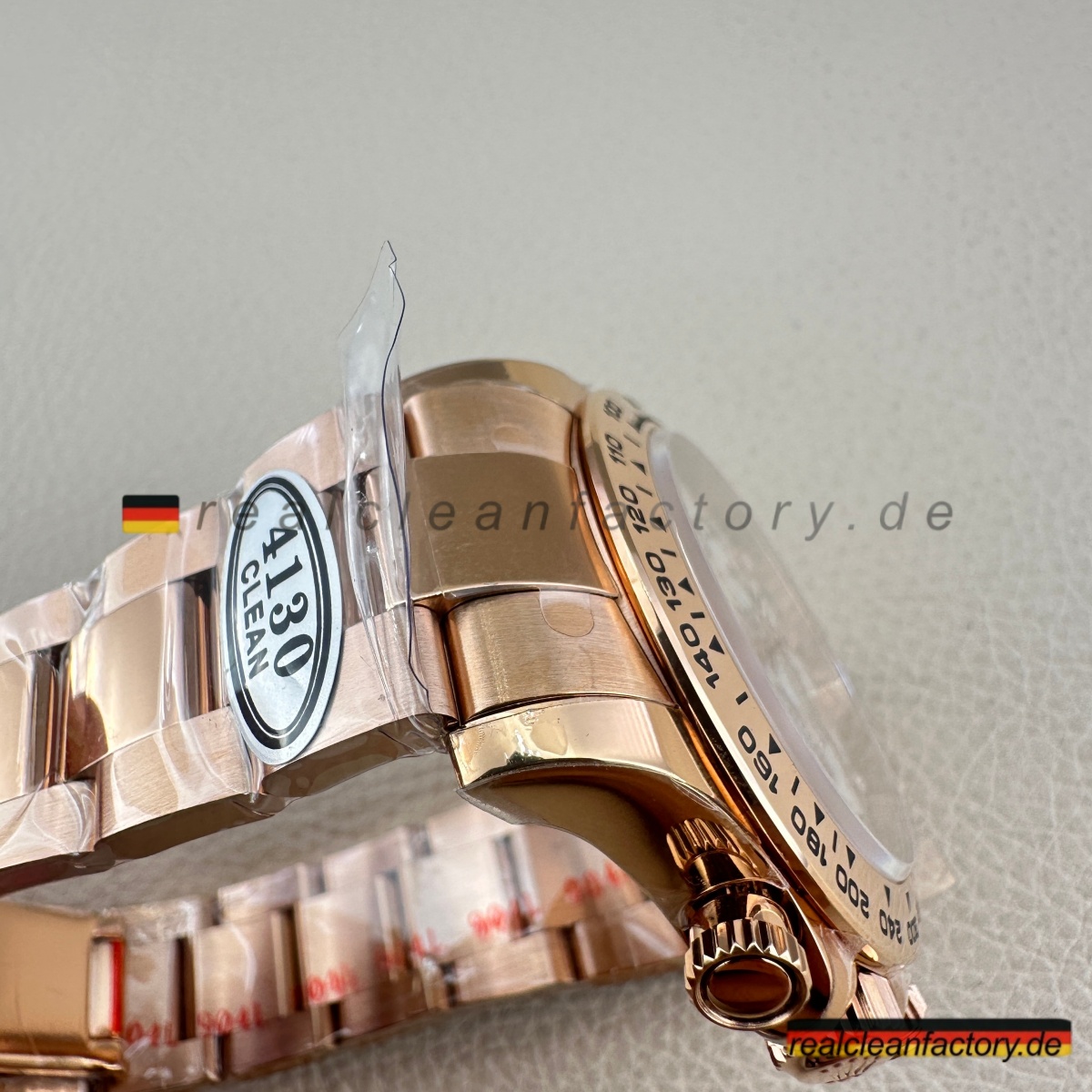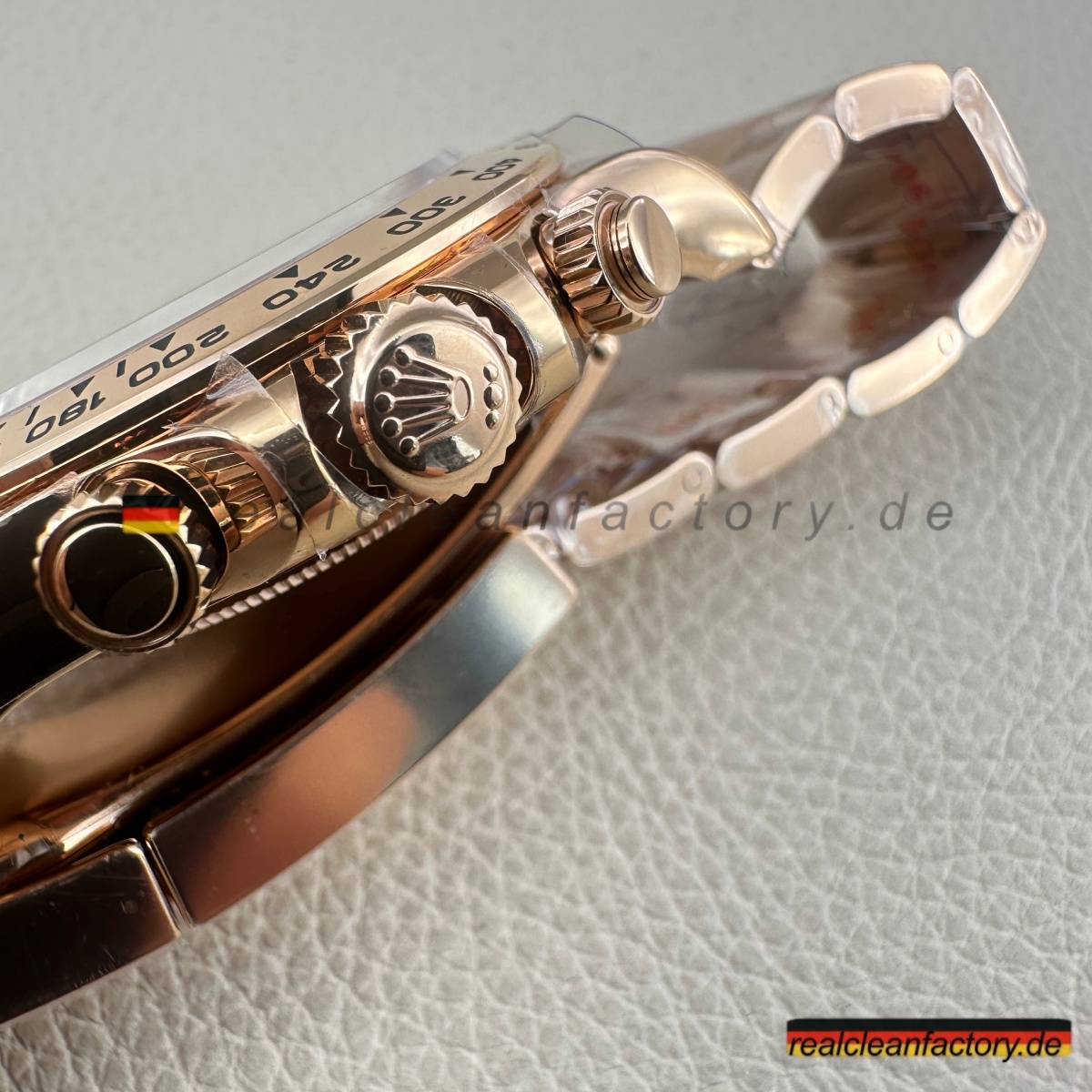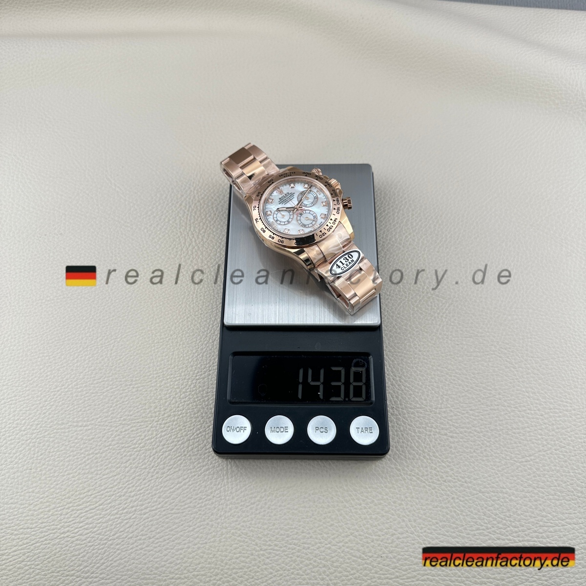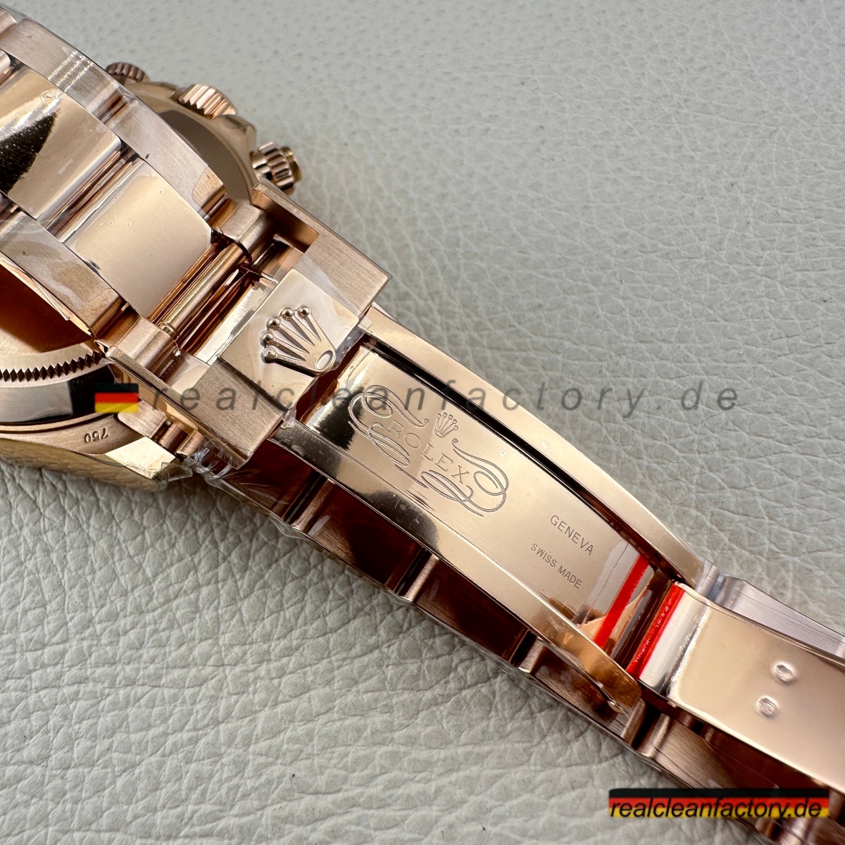- Clean Factorys massive Goldplattierung ist hier entscheidend. Schon kleinste Verfärbungen oder Abnutzungen würden die filigrane Ästhetik ruinieren. Deshalb wird diese Daytona mit dicker 18k Gold-Ummantelung und molekularer Bindung gefertigt. Mit 144 g verzichtet sie auf billige Füllmetalle, die nur Gewicht vortäuschen. Stattdessen bekommt man echtes Rolex-Gold, das dauerhaft strahlt – ohne schwarze Flecken, ohne grünen Belag, ohne Enttäuschung.