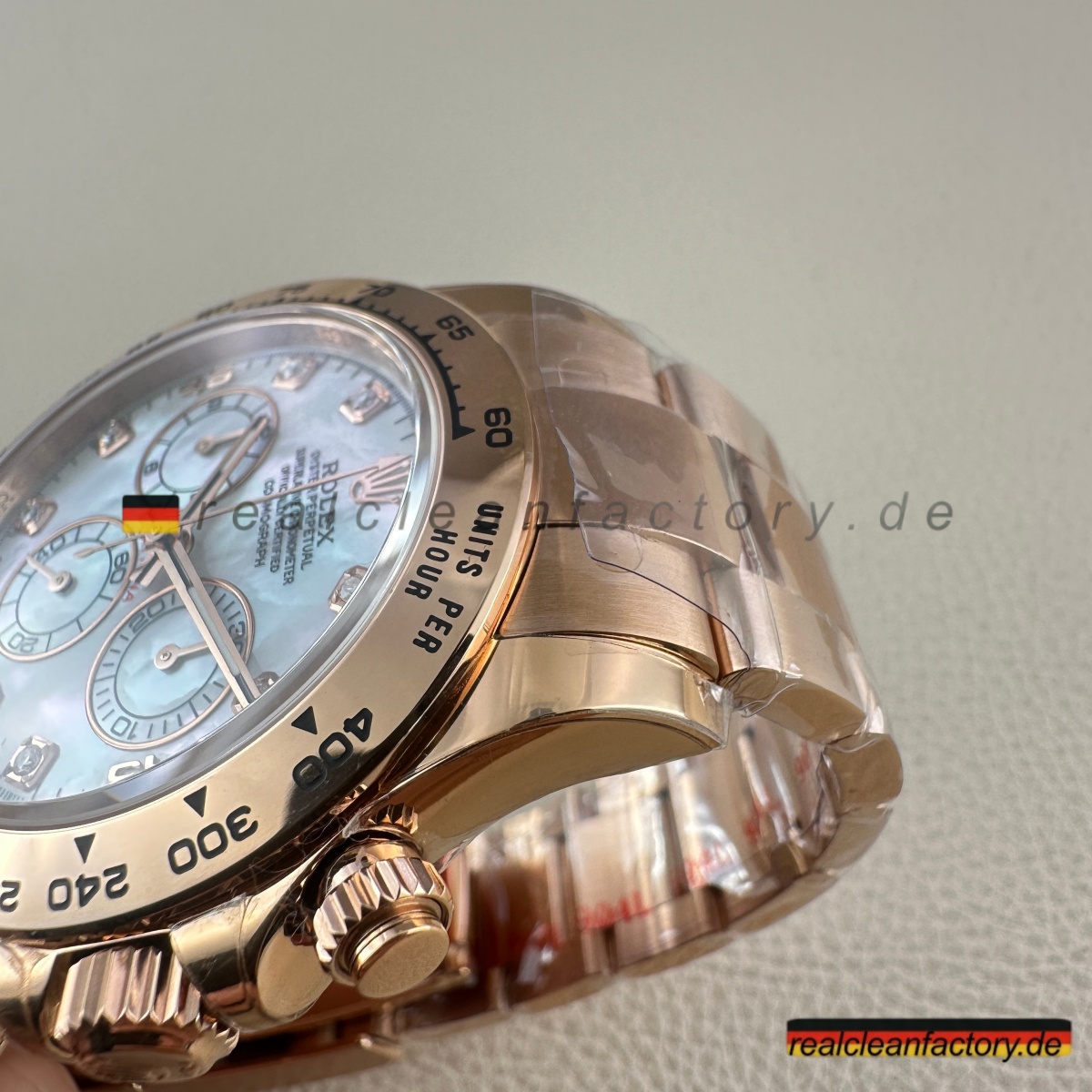 - Die meisten Hersteller scheitern an diesem Modell, weil jedes Detail perfekt sein muss: Goldfarbton, irisierender Glanz, Diamantfassung, Finish. Clean Factory garantiert dank molekularer Bindung und Premium-Materialien, dass das Zifferblatt makellos bleibt und das Gold warm schimmert. Dies ist die Gelbgold-Daytona für Kenner – souverän, ohne zu prahlen; luxuriös, ohne laut zu sein.
