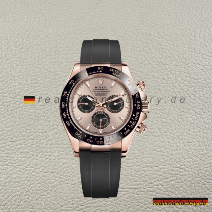 - Die Daytona 116515LN-0059 von Clean Factory in Everose Gold mit Sundust-Zifferblatt, schwarzen Totalisatoren und schwarzer Cerachrom-Lünette setzt Maßstäbe bei einem der technisch anspruchsvollsten Designs, die Rolex je umgesetzt hat.