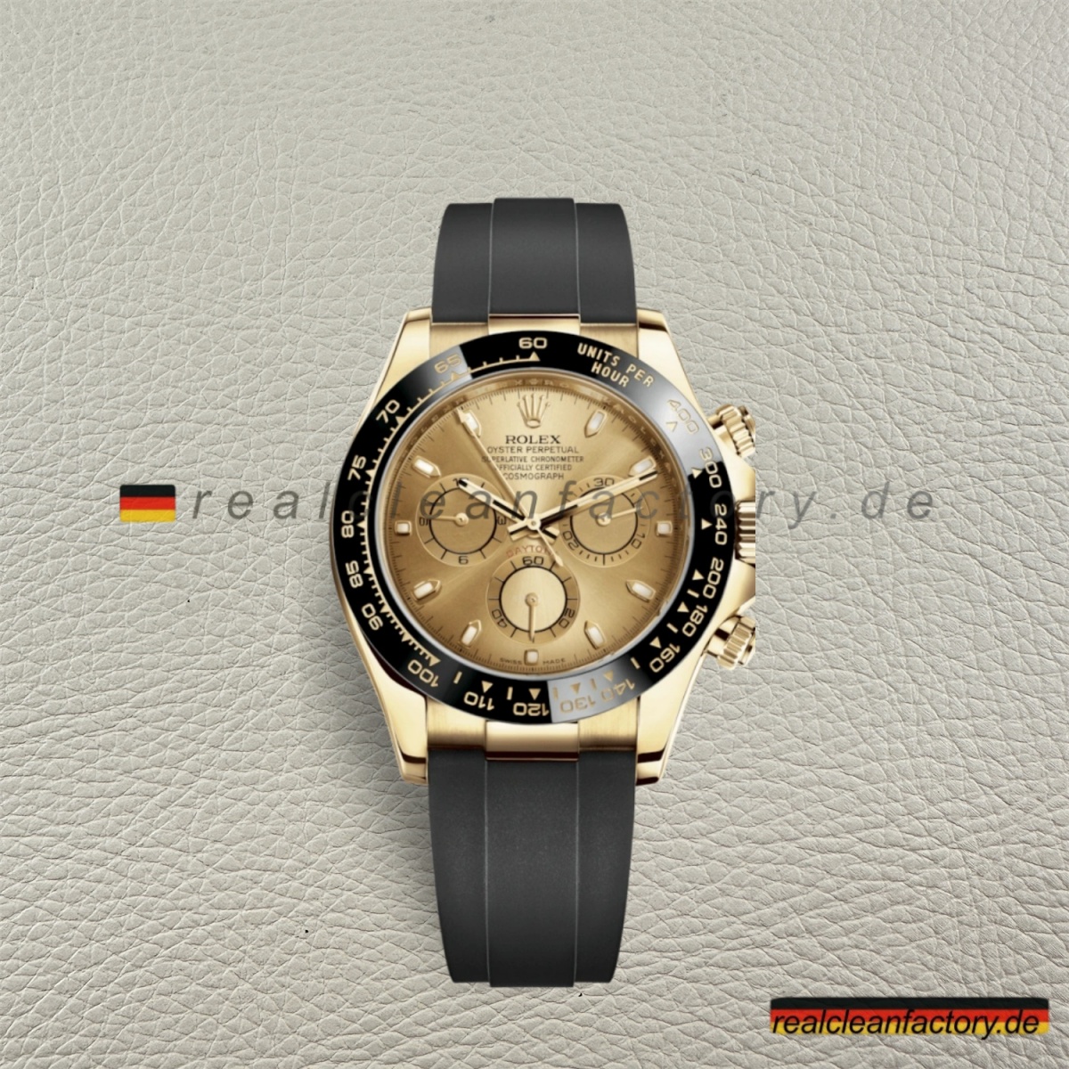 - Die Clean Factory Daytona 116518LN-0034 in Gelbgold mit Champagne-Index-Zifferblatt, Kautschukband und schwarzer Cerachrom-Lünette vereint traditionelle Luxus-Ästhetik mit modernen Materialien – eine technische Herausforderung, an der viele Hersteller scheitern.